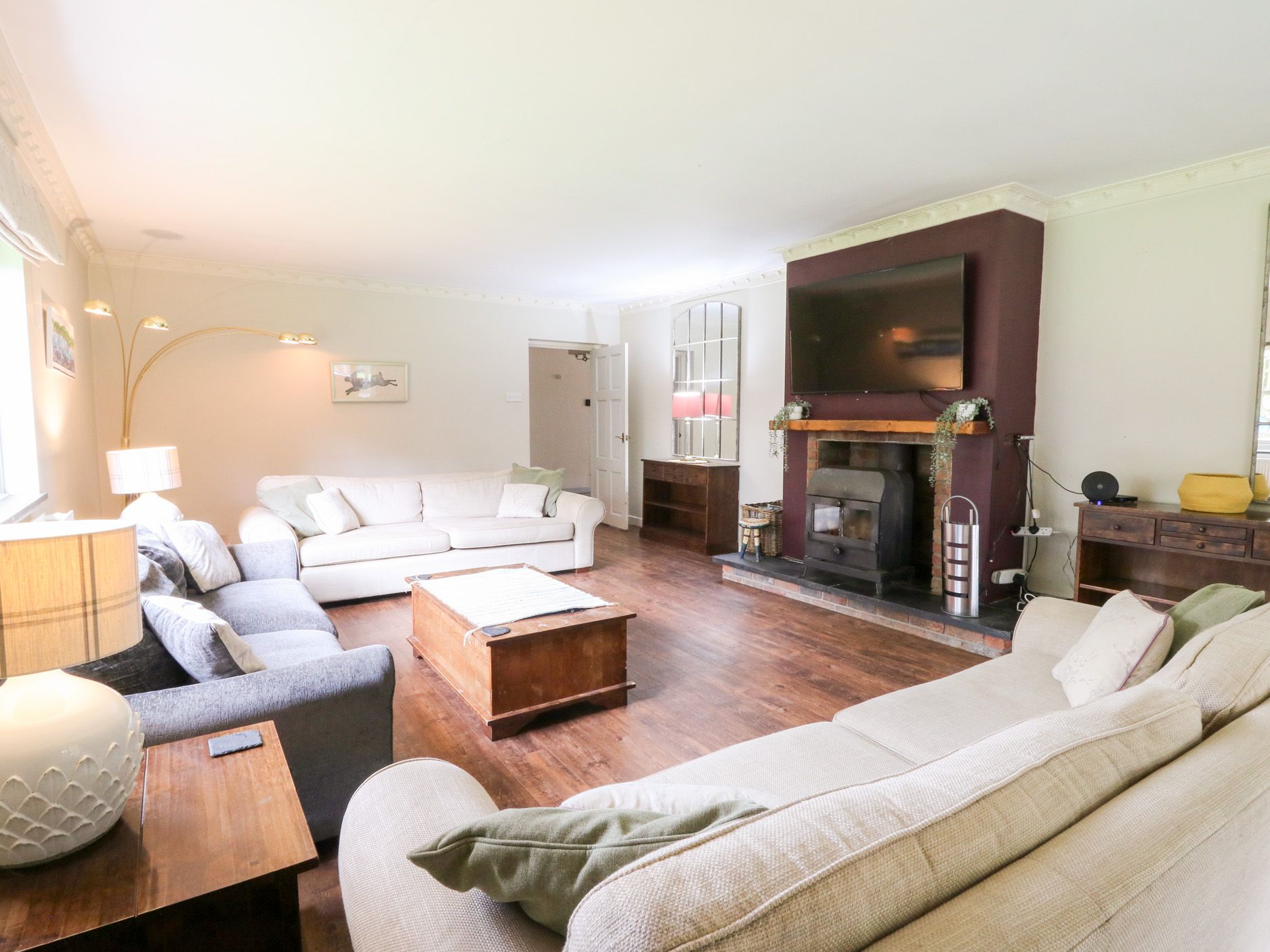 Accomodation Details Six bedrooms: First floor: 1x super kingsize zip and link beds (can be made into twin on request) with en-suite bathroom with walk in shower, basin ,WC, towel rail, Aquarius bath rise and fall, heat blower/dryer, 1 x family bathroom bath with shower over WC, basin and towel rail, 2 x twin rooms, 1 x king size room with en-suite with shower, basin,WC, towel rail, Ground floor: 1 x double room with en-suite bath with shower over, WC, basin and towel rail, 1x family room comprising of 1 x zip and link super king bed (can be made into twins on request) with double sofa bed and en-suite with walk in shower, Aquarius rise and fall bath, rise and fall WC, basin, towel rail. Kitchen/diner. Utility. Dining room. Sitting room with woodburning stove. Snug