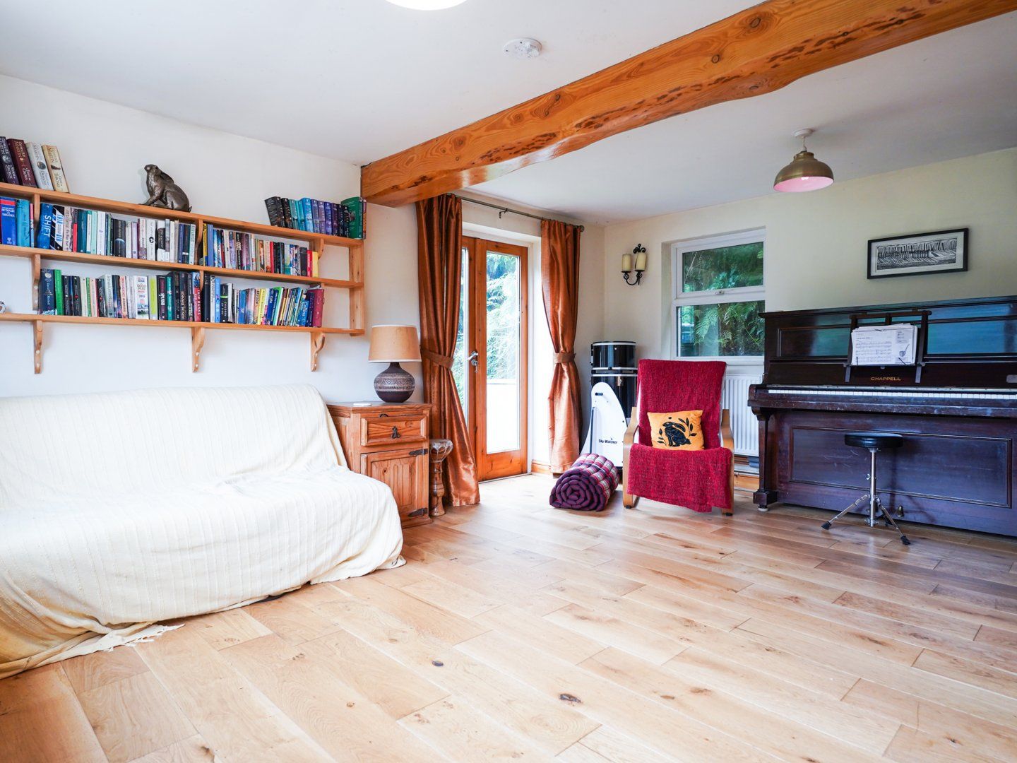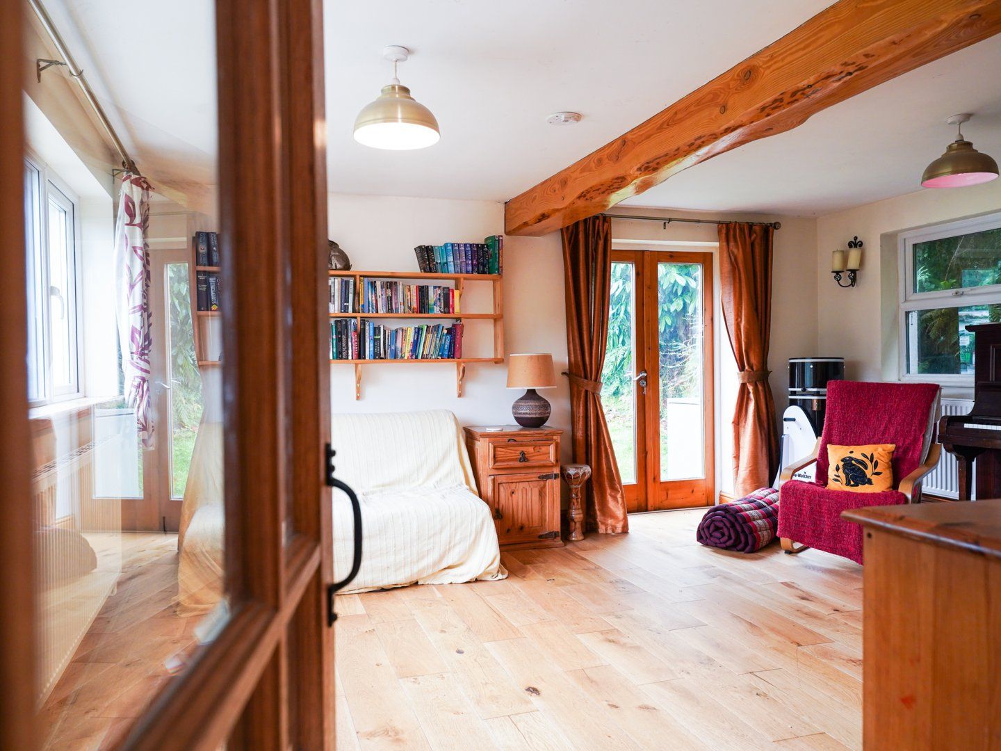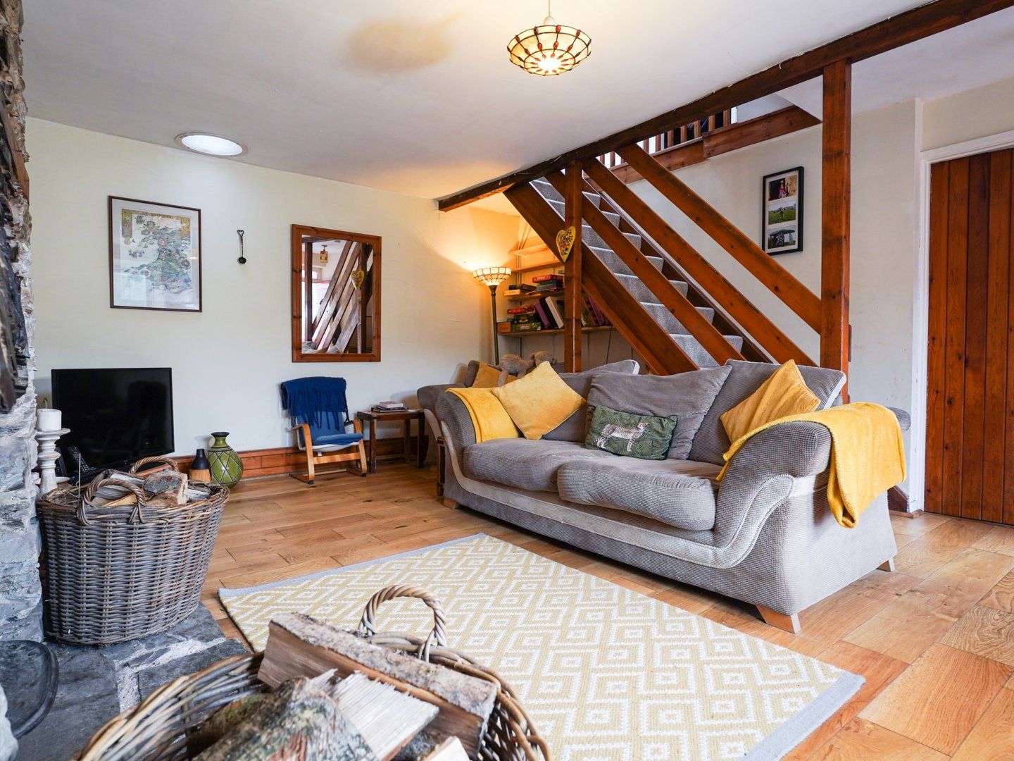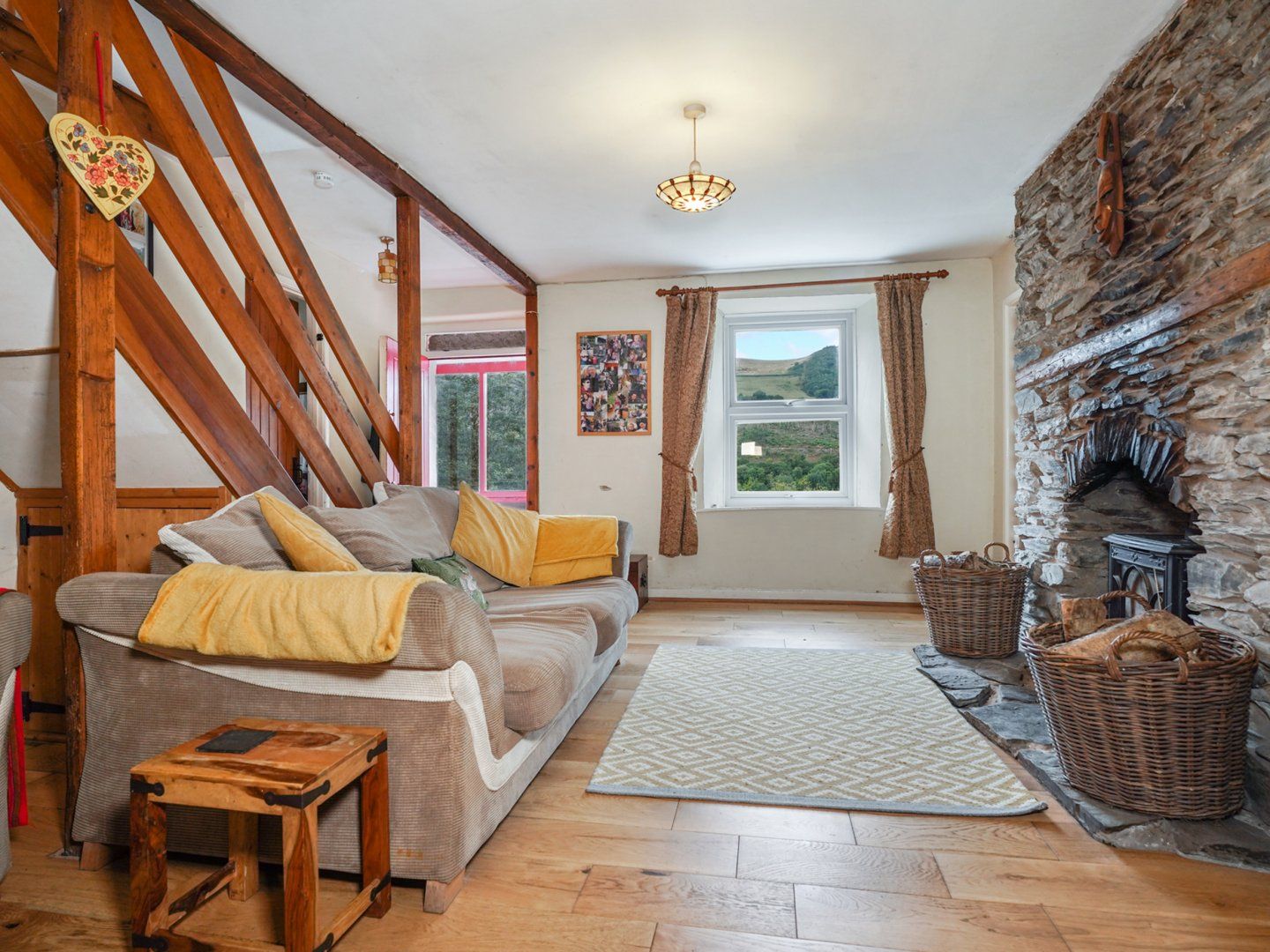 Accomodation Details Three bedrooms: 1 x super-king-size, 1 x double, 1 x adult-bunk. Bathroom with corner bath, shower over, basin and WC. Kitchen/diner. Lounge with French windows, piano and panoramic views of the Melindwr valley. Snug with smart TV and log burner.