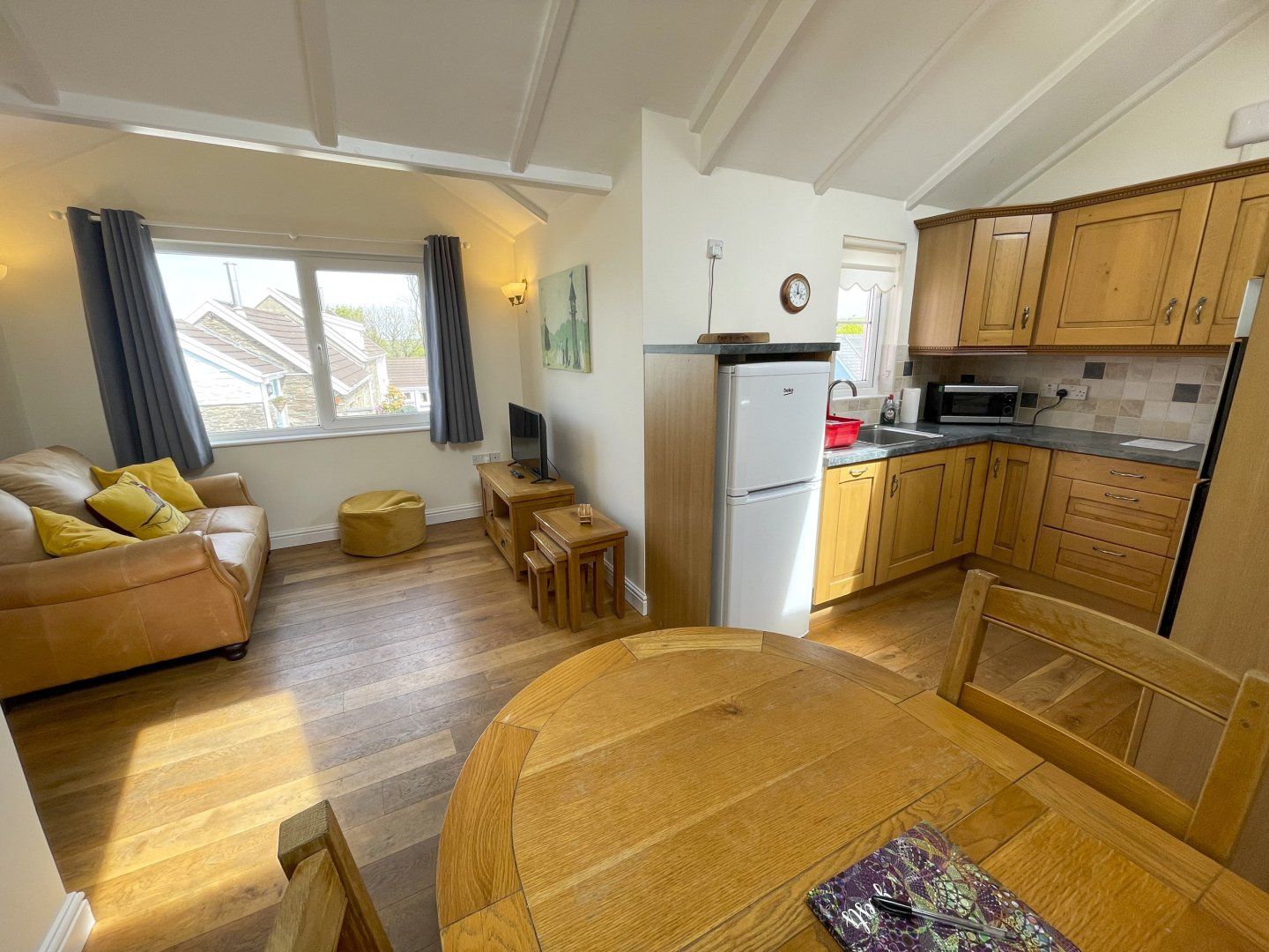 Accomodation Details Single-storey. One bedroom with a king-size bed and en-suite bath, walk-in shower, basin and WC. Open-plan living space with kitchen, dining and sitting area