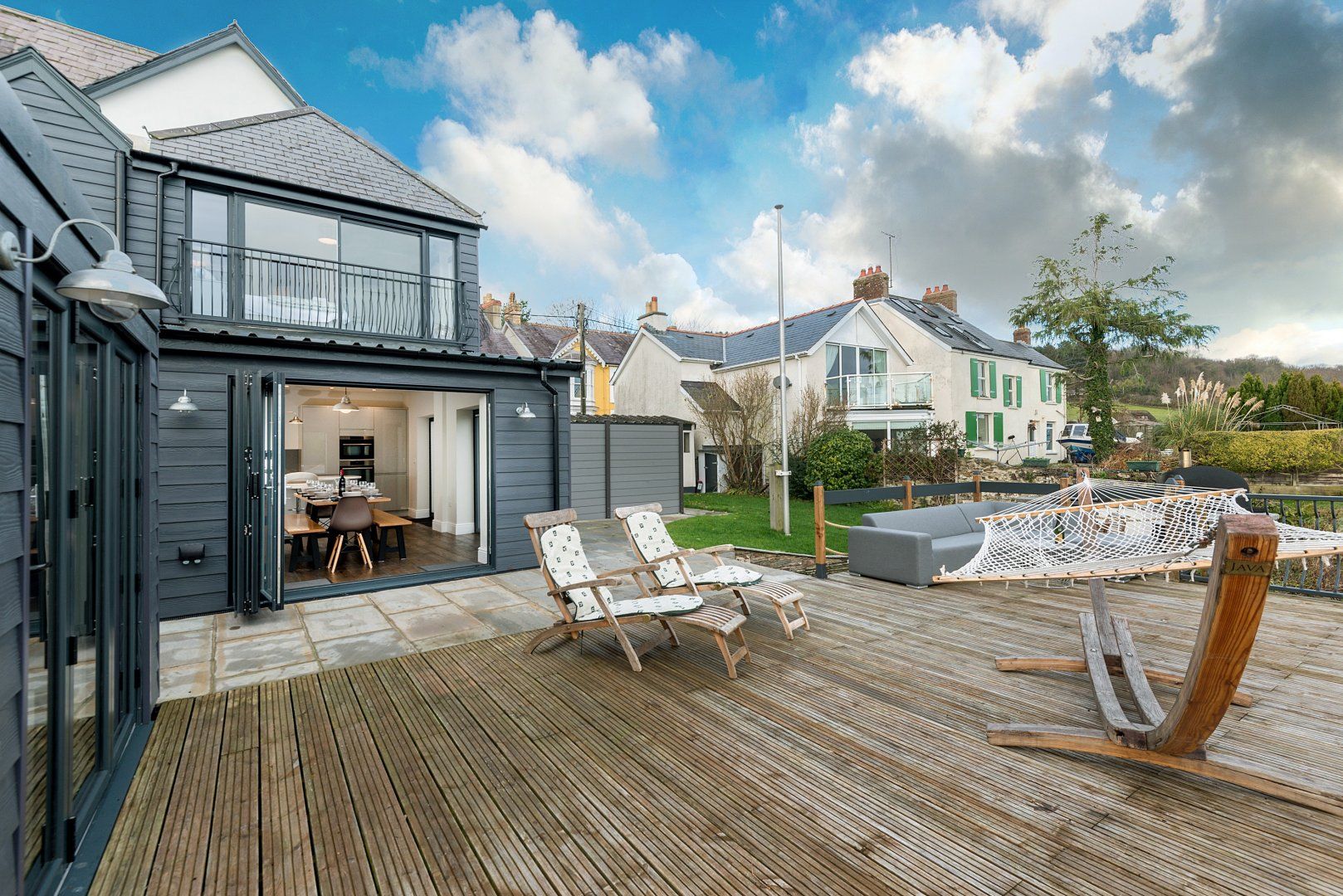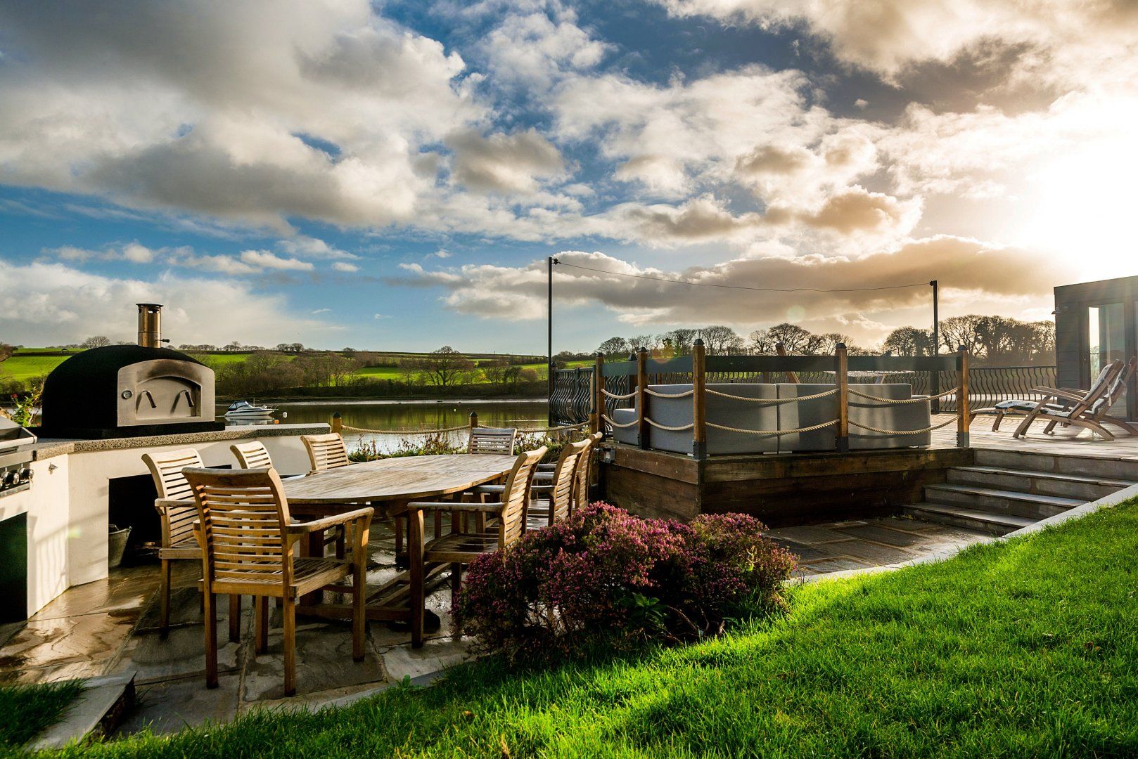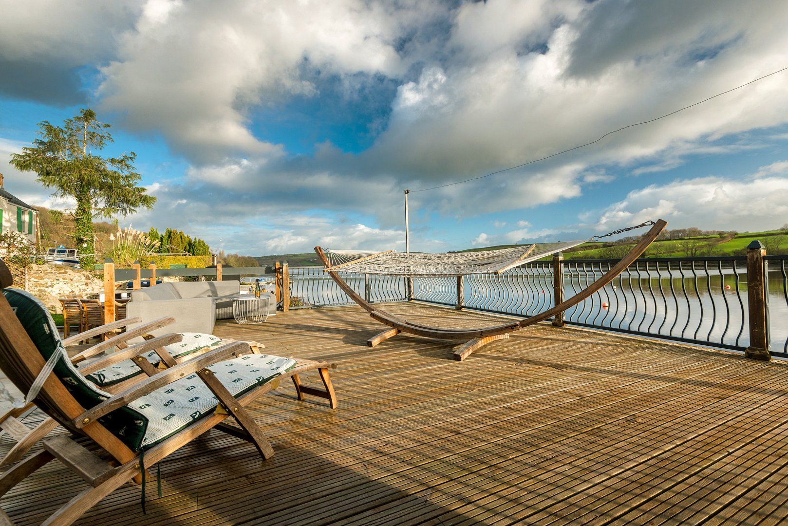Perched on the banks of the Teifi estuary, this renovated former sea captain's villa in southwest Wales treats guests to some spectacular waterside views. On sunny days, these can be enjoyed on the large terrace, whether that's reclining in one of the loungers, lying in the hammock or sitting around the alfresco dining area, waiting for dinner to be served off the barbecue or out of the pizza oven. However, the sparkly panorama can just as easily be appreciated from the huge windows in the open-concept kitchen-dining area or from the bedrooms. When you can prise your eyes away from the beautiful scene outside, you'll find a modern interior that integrates rustic aspects, such as exposed brickwork and a wood-burning fireplace, seamlessly. It's the sort of place you'll look forward to returning on the return leg of a long walk. If you're in need of inspiration, all you have to do is follow the Teifi — half an hour's walk west will get you to Poppit Sands Beach, while the same amount of time in the opposite direction will take you to the town of Cardigan.