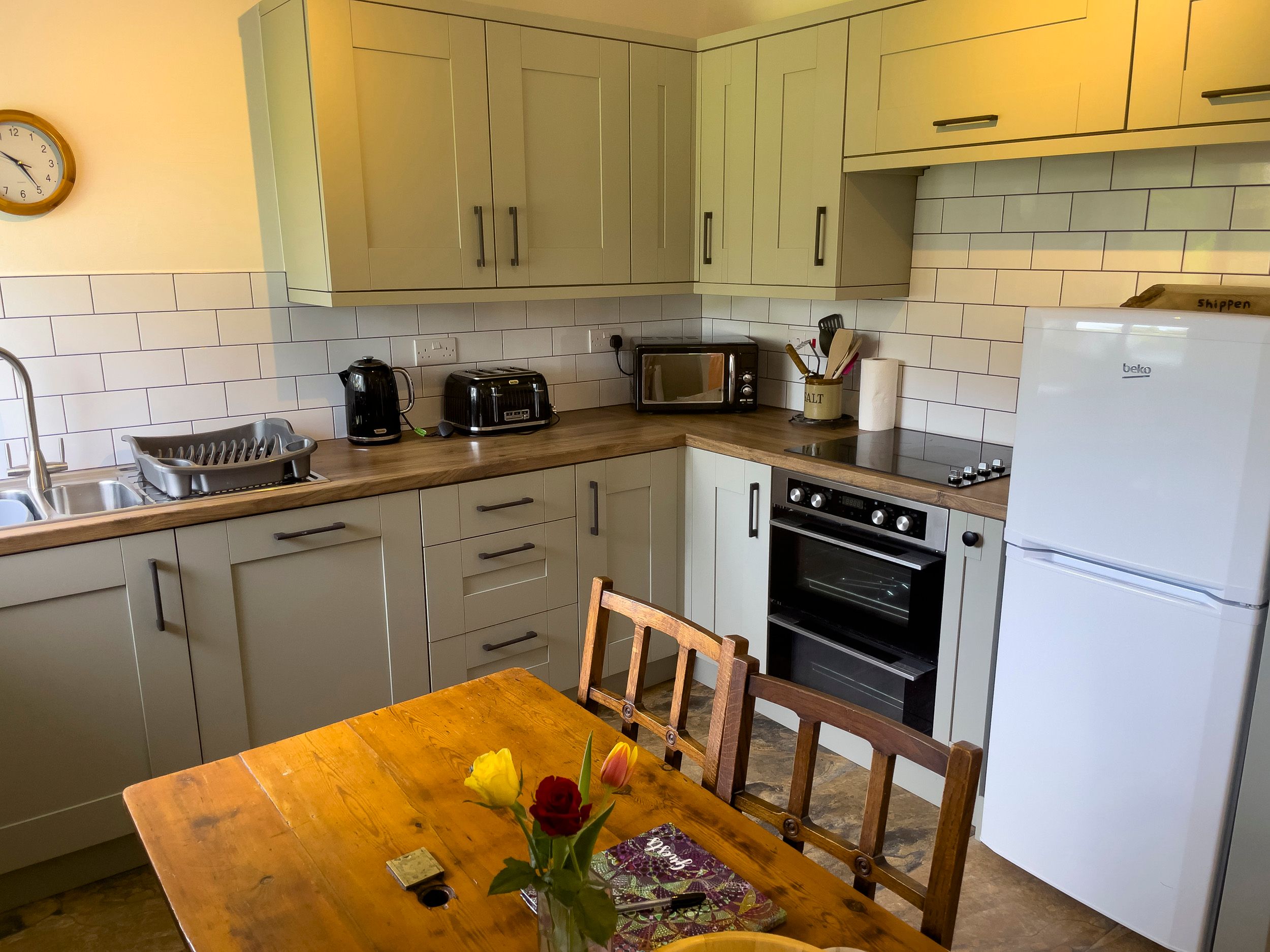 Accomodation Details Two bedrooms: 1 x king size, 1 x triple room with 3 singles. Ground-floor bathroom with bath, shower over, basin, heated towel rail, and WC. Open-plan living space with kitchen, dining area and sitting area with woodburning stove