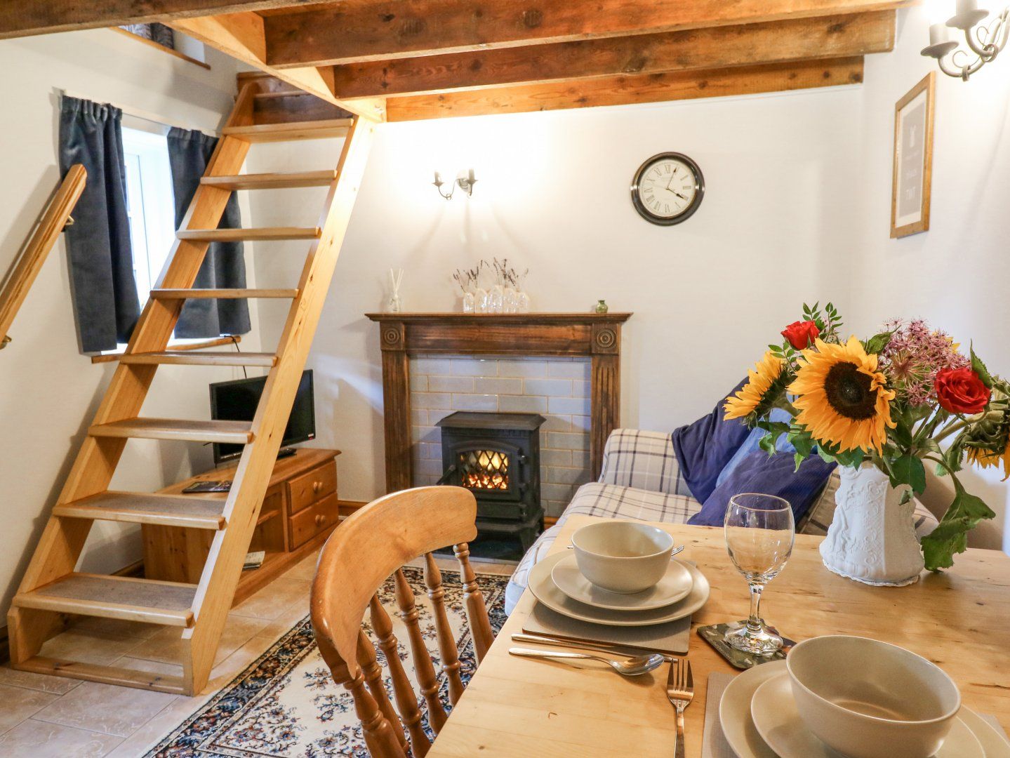 One double bedroom. Ground-floor shower room with walk-in shower, basin, and WC. Open-plan living space with kitchen, dining area and sitting area with electric fire