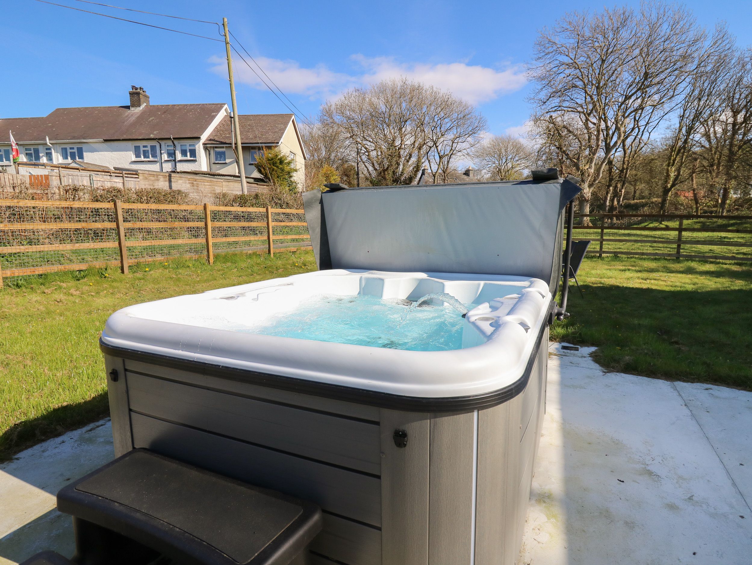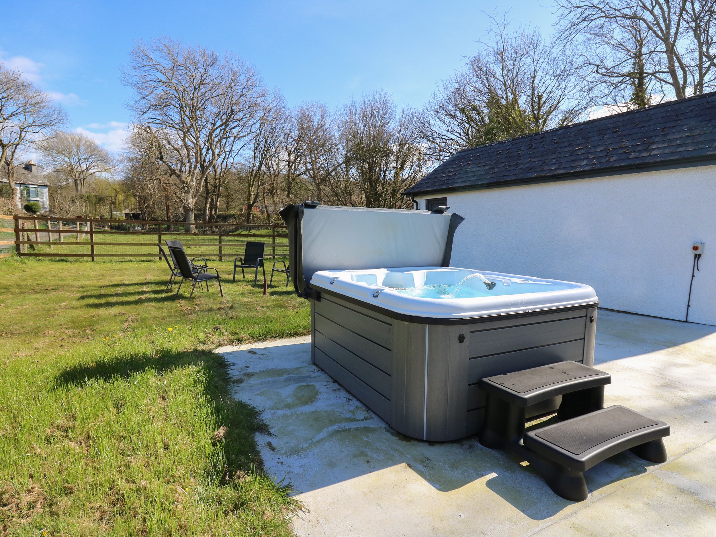 Oil central heating with woodburning stove. Electric oven and hob, microwave, fridge/freezer, washing machine, tumble dryer, dishwasher. Smart TV, WiFi. Fuel, power and starter pack for woodburning stove inc. in rent. Bed linen and towels inc. in rent. Off-road parking for 3 cars. Front enclosed garden with lawn, patio and seating. Rear garden with lawn, patio/furniture and a hot tub. The hot tub has a new pergola for summer 2023 for extra privacy. Travel cot and Highchair available on request. Two well-behaved dogs welcome. Sorry, no smoking. Shop 0.2 miles, pub 0.1 miles. Note: There is a gate leading from the rear garden, please ensure pets are supervised at all times