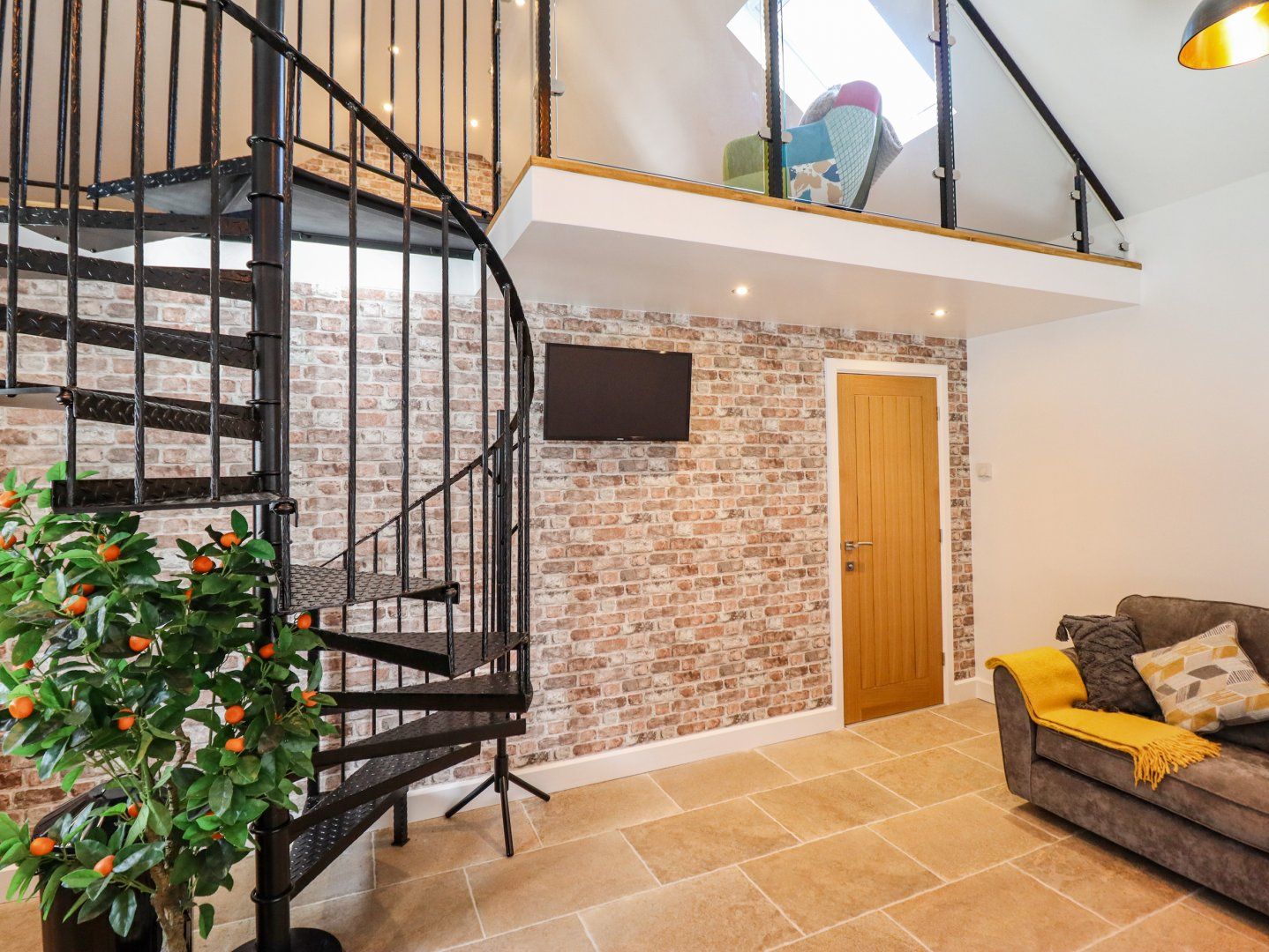 One mezzanine double bedroom. Ground-floor shower room with walk-in shower, basin, heated towel rail and WC. Open-plan living space with kitchen, dining area and sitting area