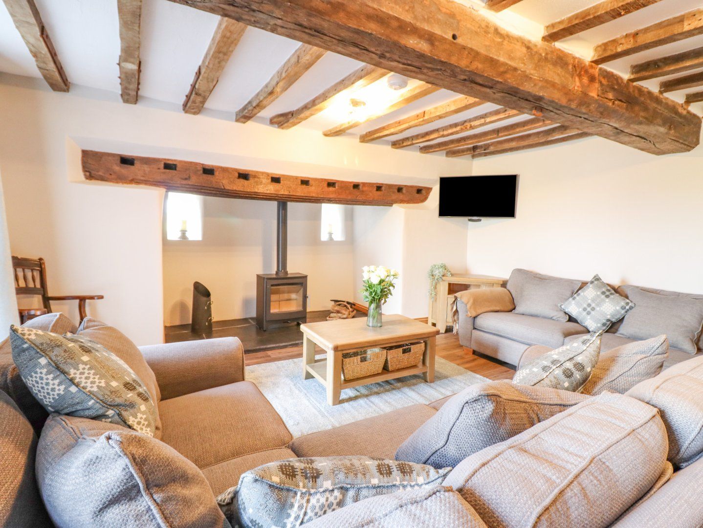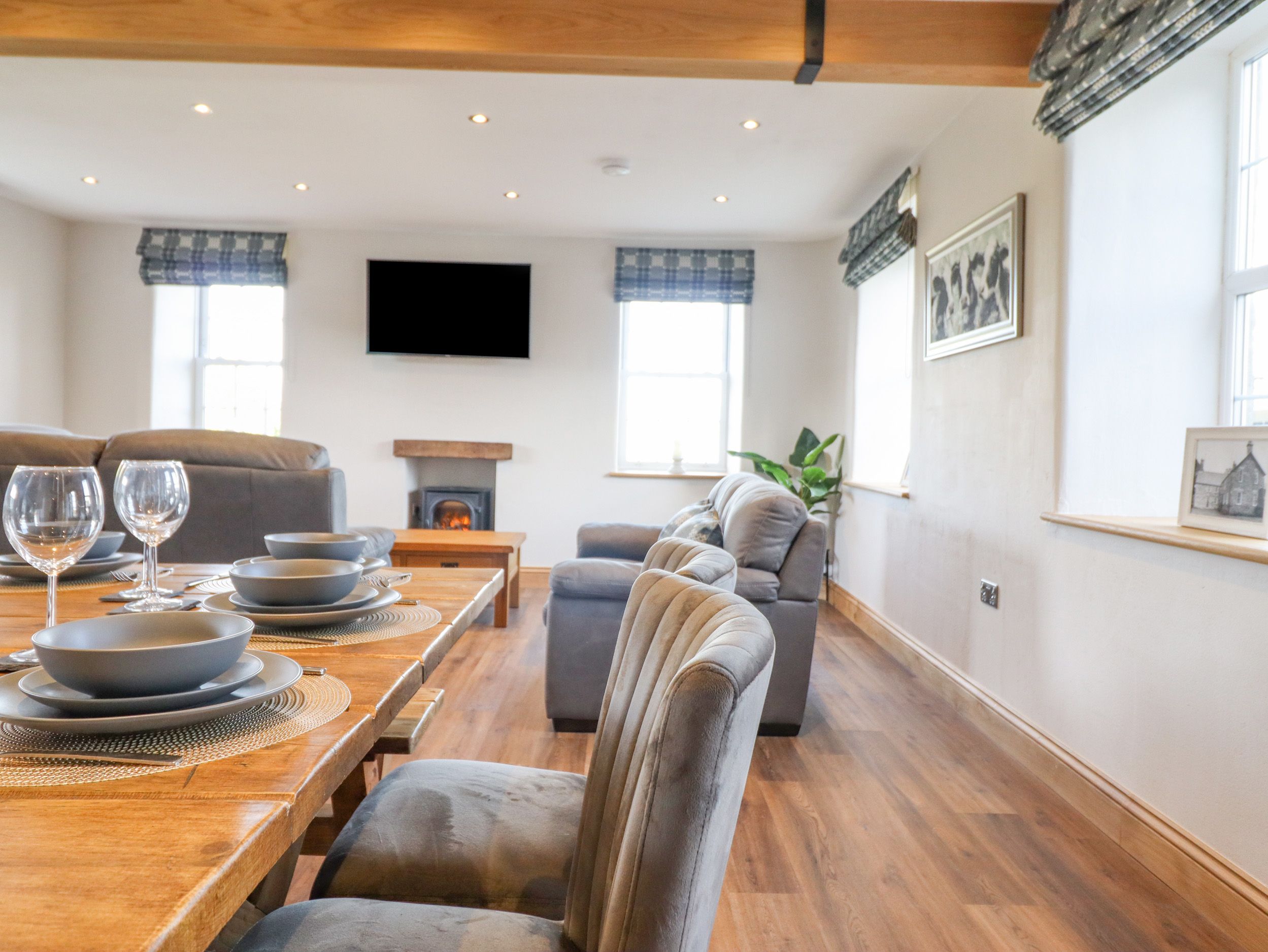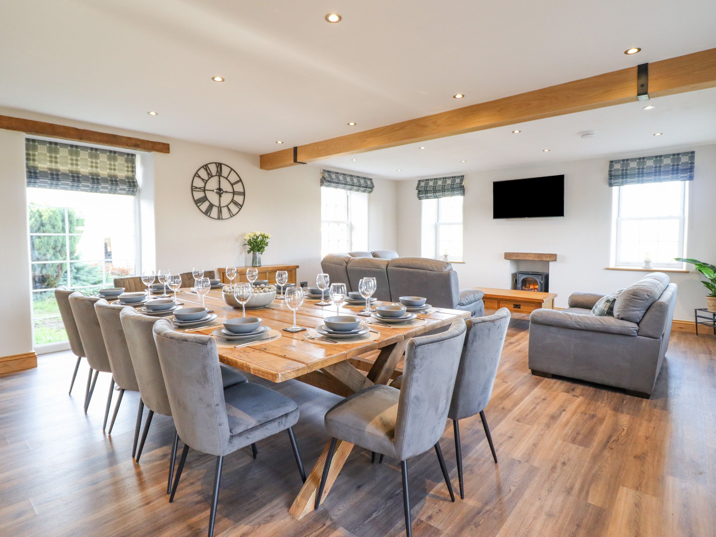 Accomodation Details Six bedrooms: 1 x super-king-size with Smart TV and en-suite walk-in shower, basin, heated towel rail, and WC, 1 x king-size with Smart TV and en-suite walk-in shower, basin, heated towel rail, and WC, 1 x ground-floor king-size with Smart TV and en-suite walk-in shower, basin, heated towel rail, and WC, 1 x double with Smart TV and en-suite walk-in shower, basin, heated towel rail, and WC, 1 x double with Smart TV, 1 x family room with super-king-size and a bunk with Smart TV. Bathroom with free-standing bath, walk-in shower, basin, heated towel rail, and WC. Cloakroom with basin and WC. Open-plan living space with kitchen, dining area, and sitting area with an electric fire. External utility. Sitting room with woodburning stove. External games room