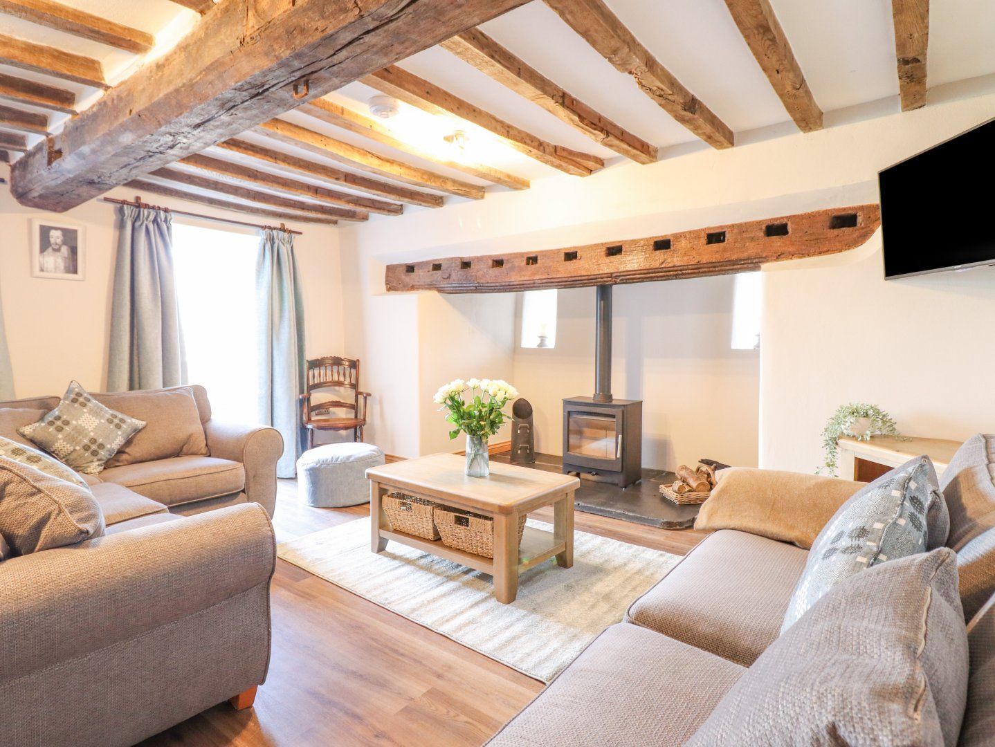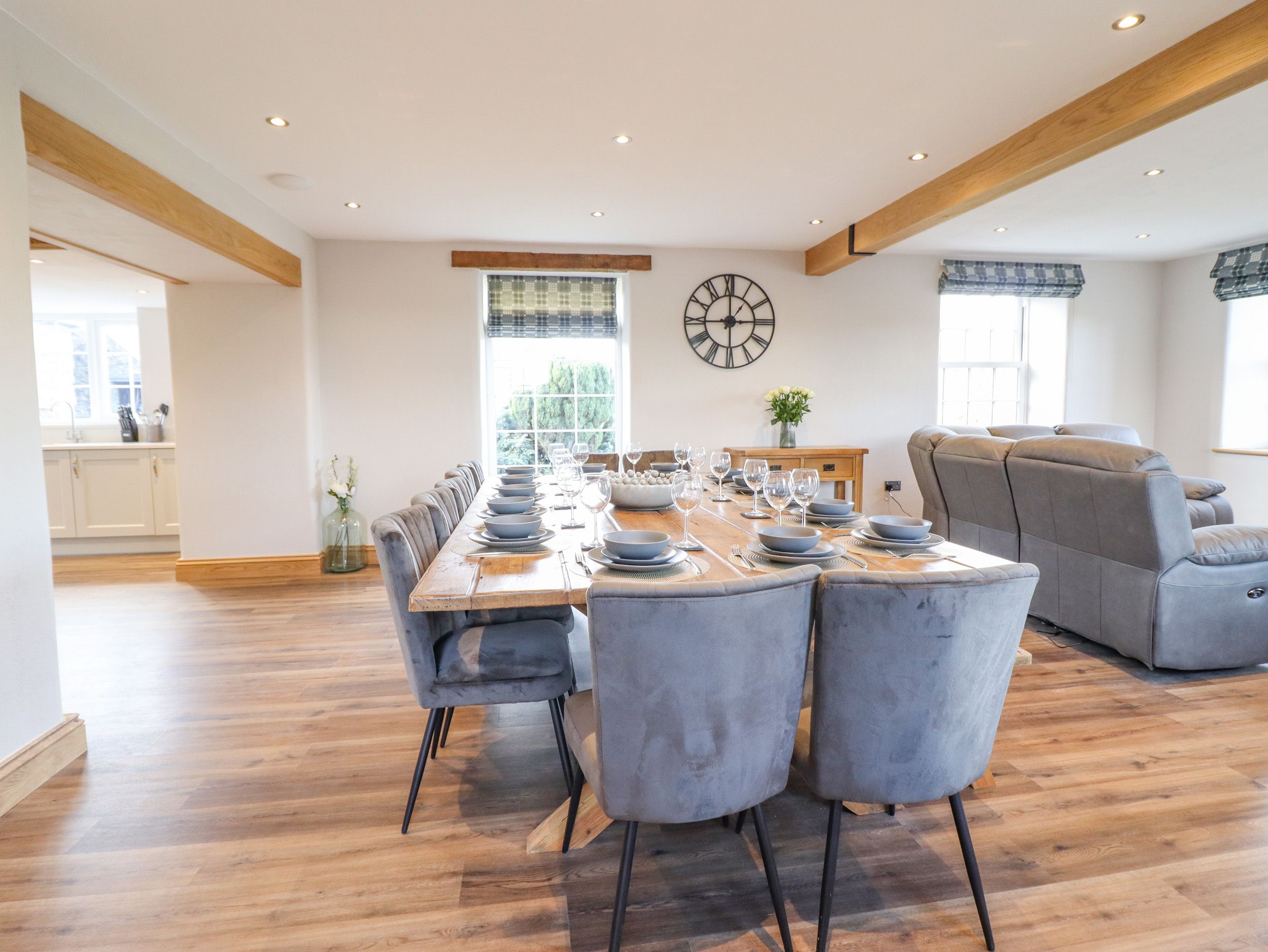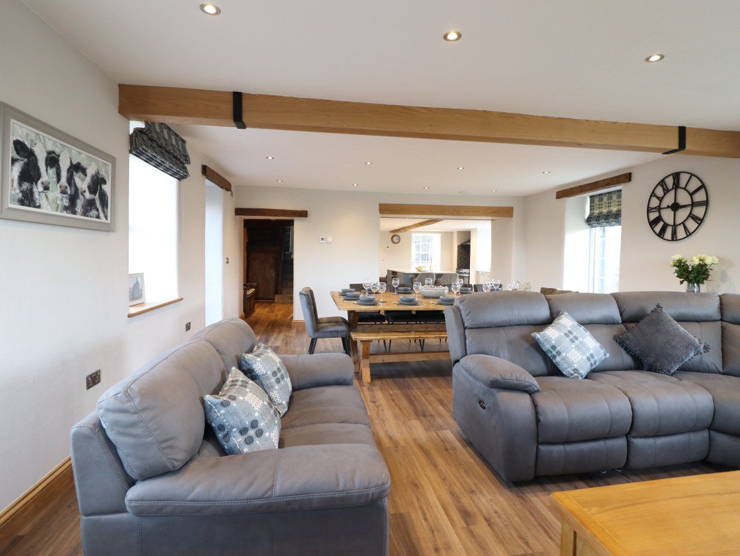 Accomodation Details Six bedrooms: 1 x super-king-size with Smart TV and en-suite walk-in shower, basin, heated towel rail, and WC, 1 x king-size with Smart TV and en-suite walk-in shower, basin, heated towel rail, and WC, 1 x ground-floor king-size with Smart TV and en-suite walk-in shower, basin, heated towel rail, and WC, 1 x double with Smart TV and en-suite walk-in shower, basin, heated towel rail, and WC, 1 x double with Smart TV, 1 x family room with super-king-size and a bunk with Smart TV. Bathroom with free-standing bath, walk-in shower, basin, heated towel rail, and WC. Cloakroom with basin and WC. Open-plan living space with kitchen, dining area, and sitting area with an electric fire. External utility. Sitting room with woodburning stove. External games room