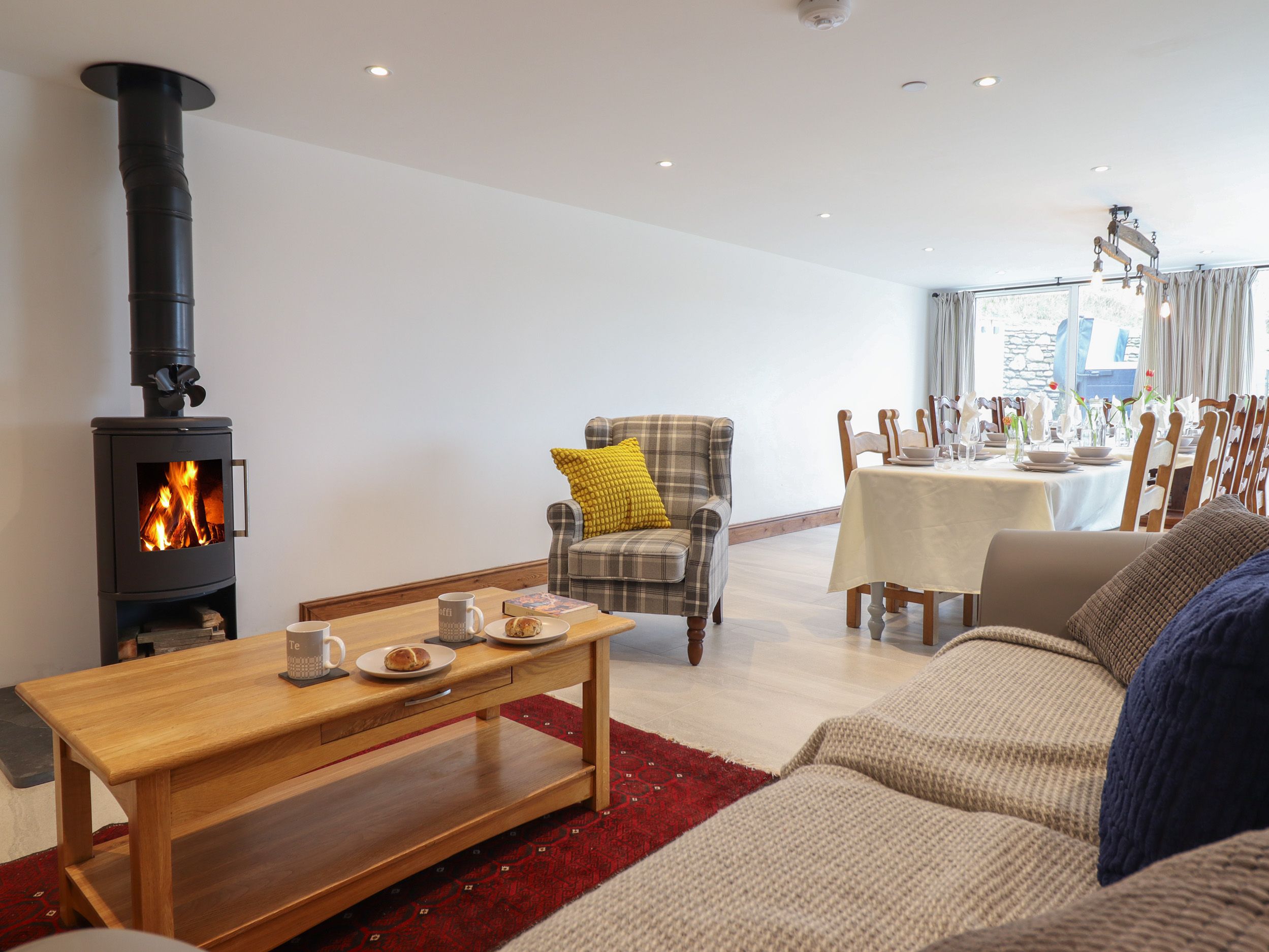 Amenities Central heating via air source pump. Double electric oven including air fryer, induction hob, microwave, fridge/freezer, washing machine, dishwasher, coffee maker, kettle, toaster, slow cooker. 3 x Smart TVs, WiFi. Fuel, power and starter pack for woodburning stove inc. in rent. Bed linen and towels inc. in rent. Highchair, stair gates and travel cot available on request. Shared off-road parking for 3 cars with EV charger. Secure storage for bikes. Enclosed front multi-level garden with lawn, patio, gravel, furniture, and hot tub. Sorry, no pets and no smoking. Community Shop 3 miles. Pubs one serving evening meals 2.3 and another 3 miles away that is owned by the community. Note: There are two steps down to access the ground-floor double bedroom. Note: There are steps in the garden, please take care.