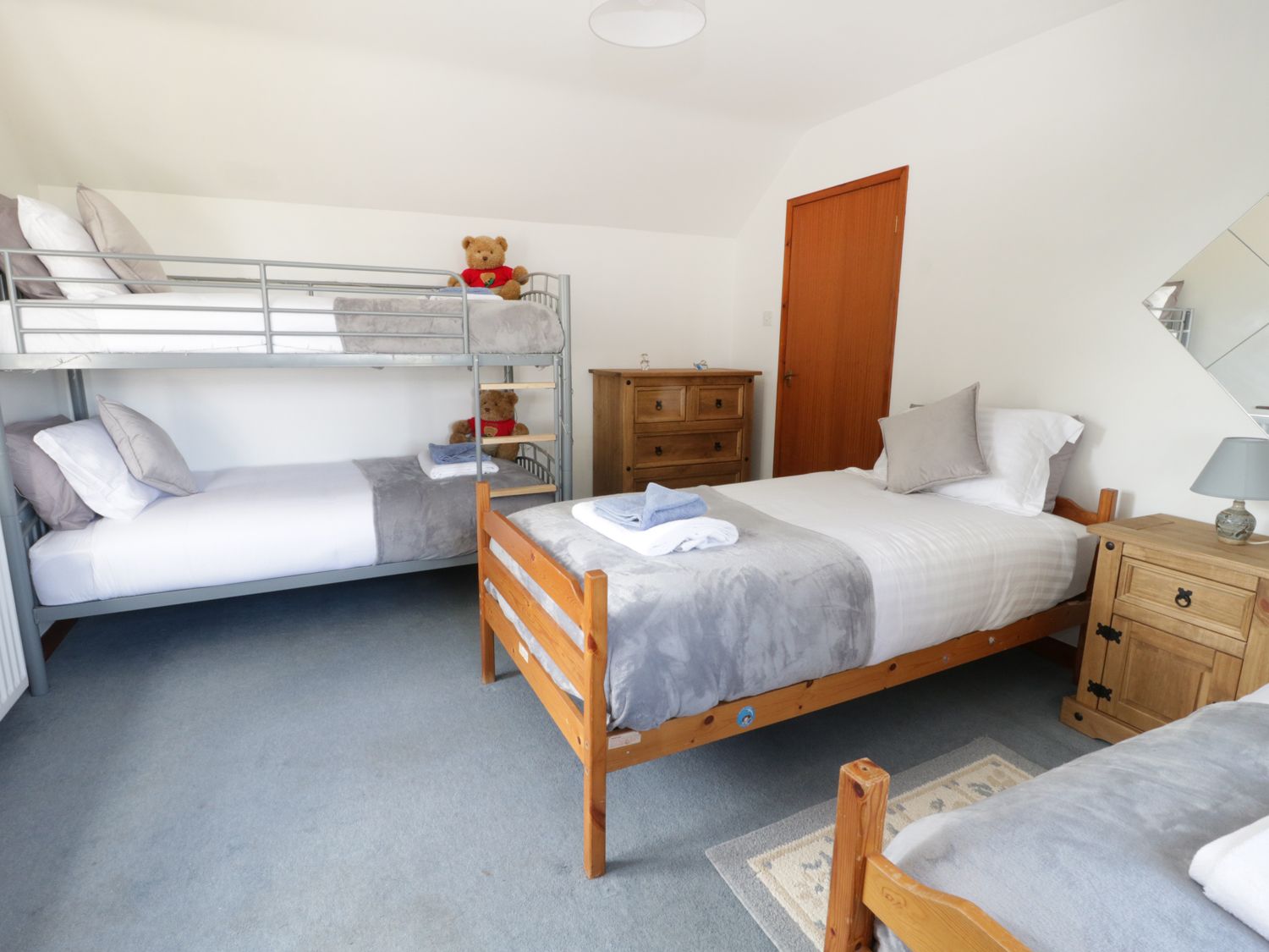Three generations of our family stayed here for a long weekend.The young teens especially loved the upstairs where they had their own bedroom on one side and a TV lounge on the other.It was like their own private apartment.Us oldies chilled out in the lounge downstairs with its warm and cosy log fire.Everything is finished to a very high standard and the large kitchenis equipped with everything you would ever need.All the bedrooms are spacious and very comfortable.Unfortunately the weather was not kind to us but we would love to return in the summer and sit on the balcony to enjoy the views and soak up the peace and quiet.Highly recommend staying in this property