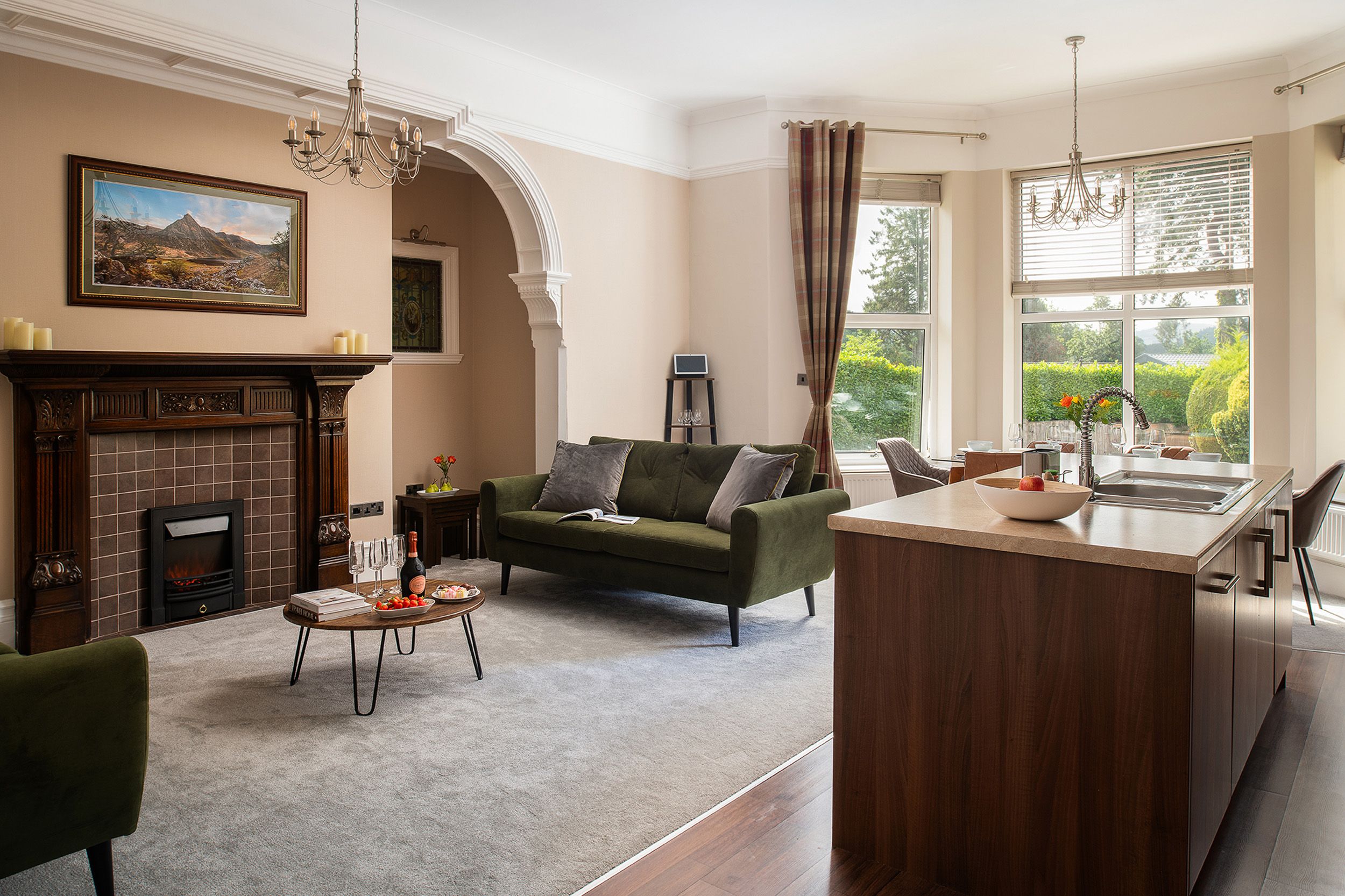 Ground-floor apartment. Three bedrooms: 1 x super-king-size, 1 x king-size with en-suite walk-in shower, basin and WC, 1 x twin OR super king (zip link option available on request) . Bathroom with bath, shower over, basin and WC. Open-plan living space with kitchen, dining and sitting area. Snug