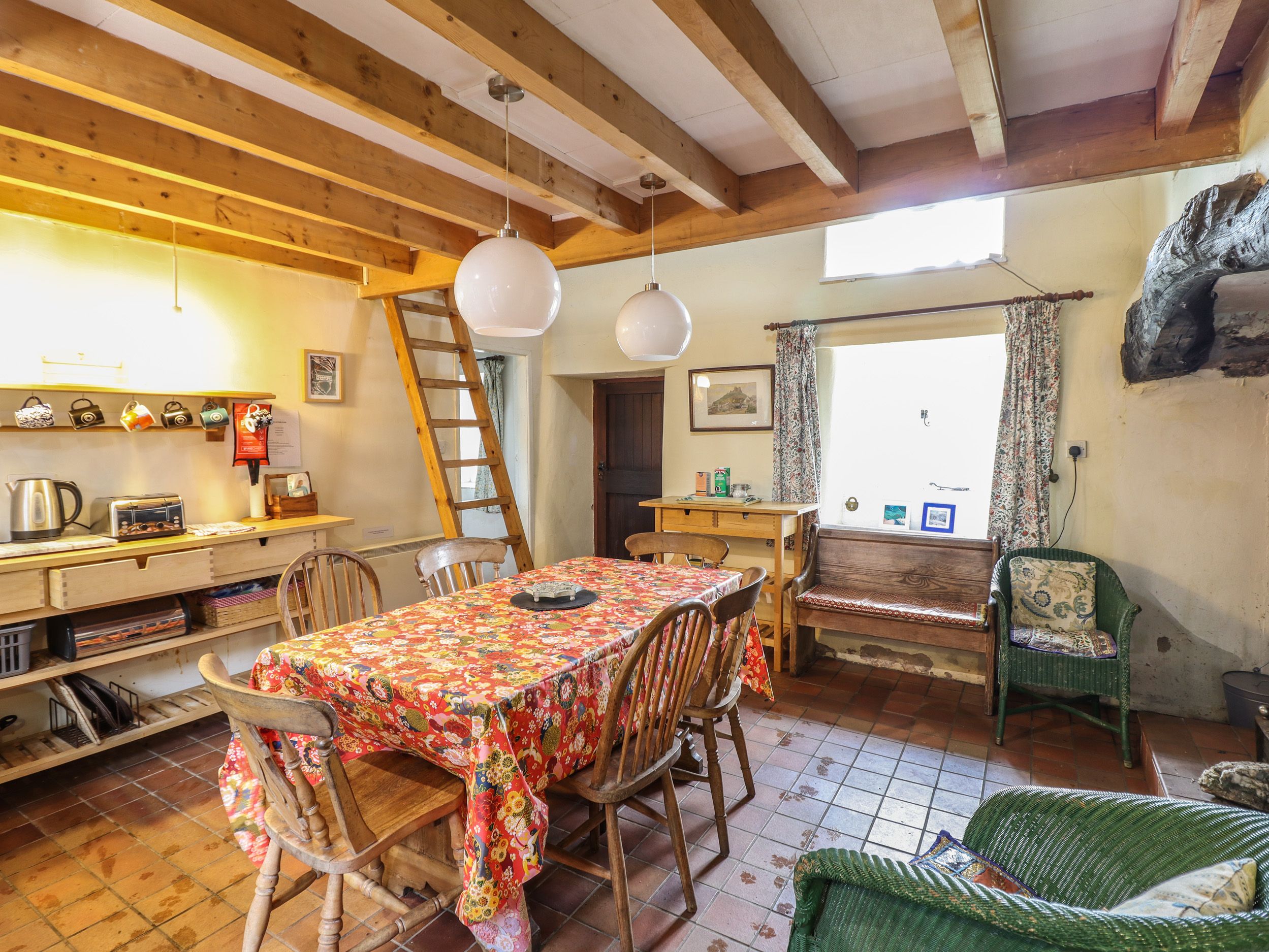 Holiday home The Long Cottage consists of a kitchen/diner with electric oven and hob, fridge with freezer compartment, dining space for four, a utility with microwave, washing machine, and freezer, sitting room with TV and open fire, plus first-floor games room with ladder access, TV and table football. There are two double bedrooms, serviced by a ground-floor shower room and ground-floor bathroom. Outside there is a non-enclosed front lawn with furniture, plus off-road parking for five cars. Within 0.7 miles you will find a shop and a pub, and please note this is a smoke-free property. Pet-friendly. Travel cot available. WiFi, fuel, power, bed linen, and towels included in the rent. Explore Conwy with a stay at The Long Cottage. Note: Ladder above kitchen to games room, please take care. Note: Restricted head hight in one double bedroom. Please Note: this property has a £25 per pet supplement.