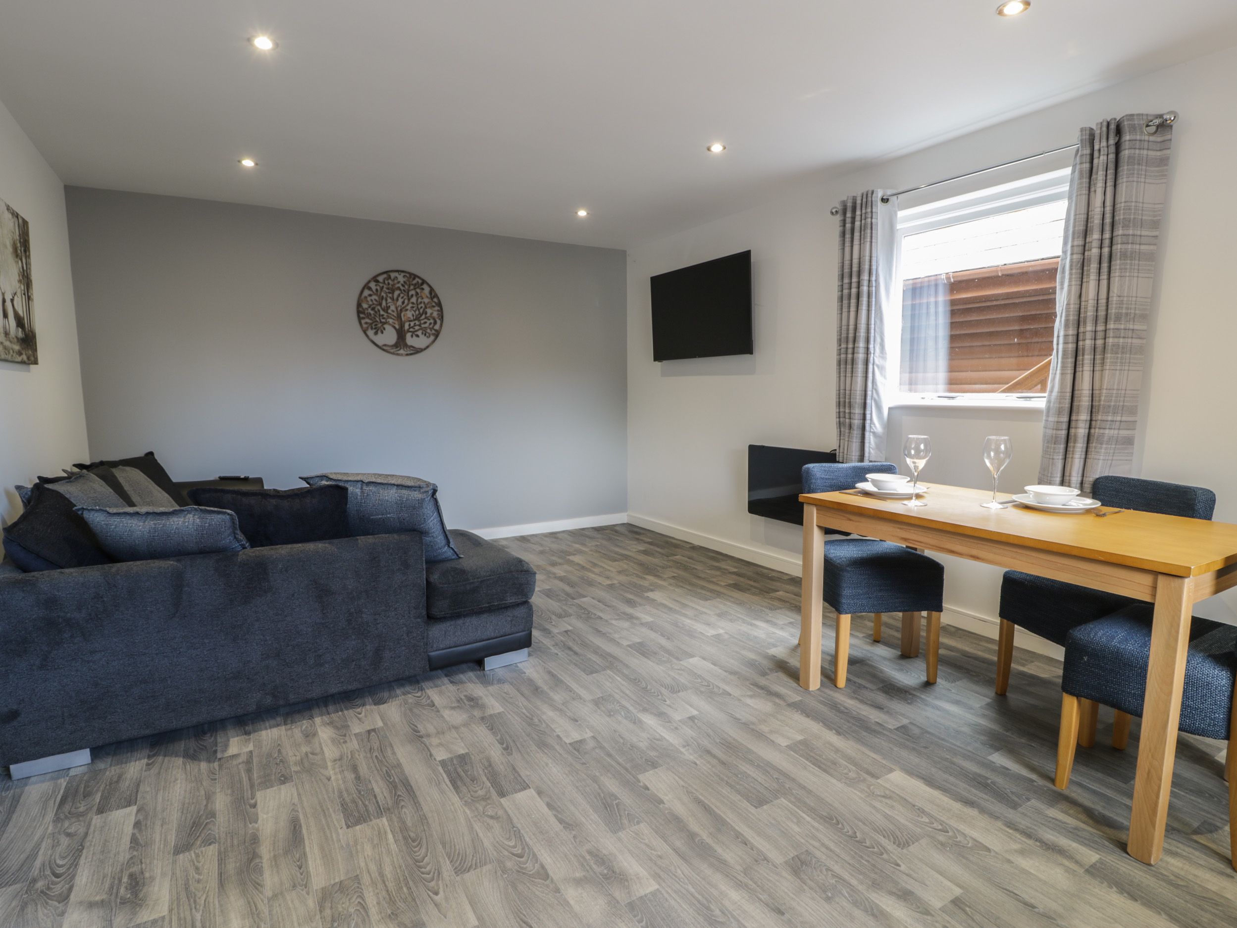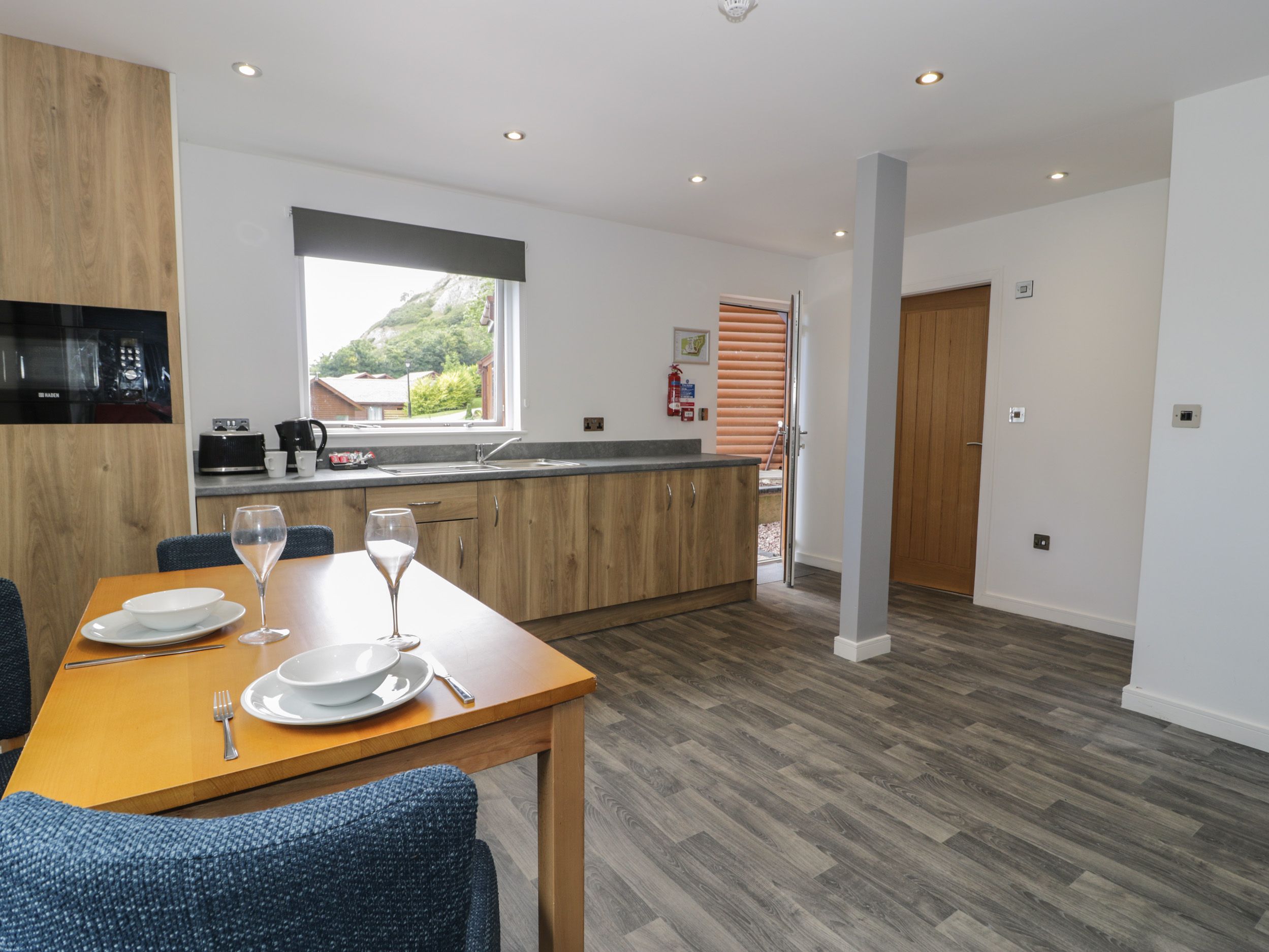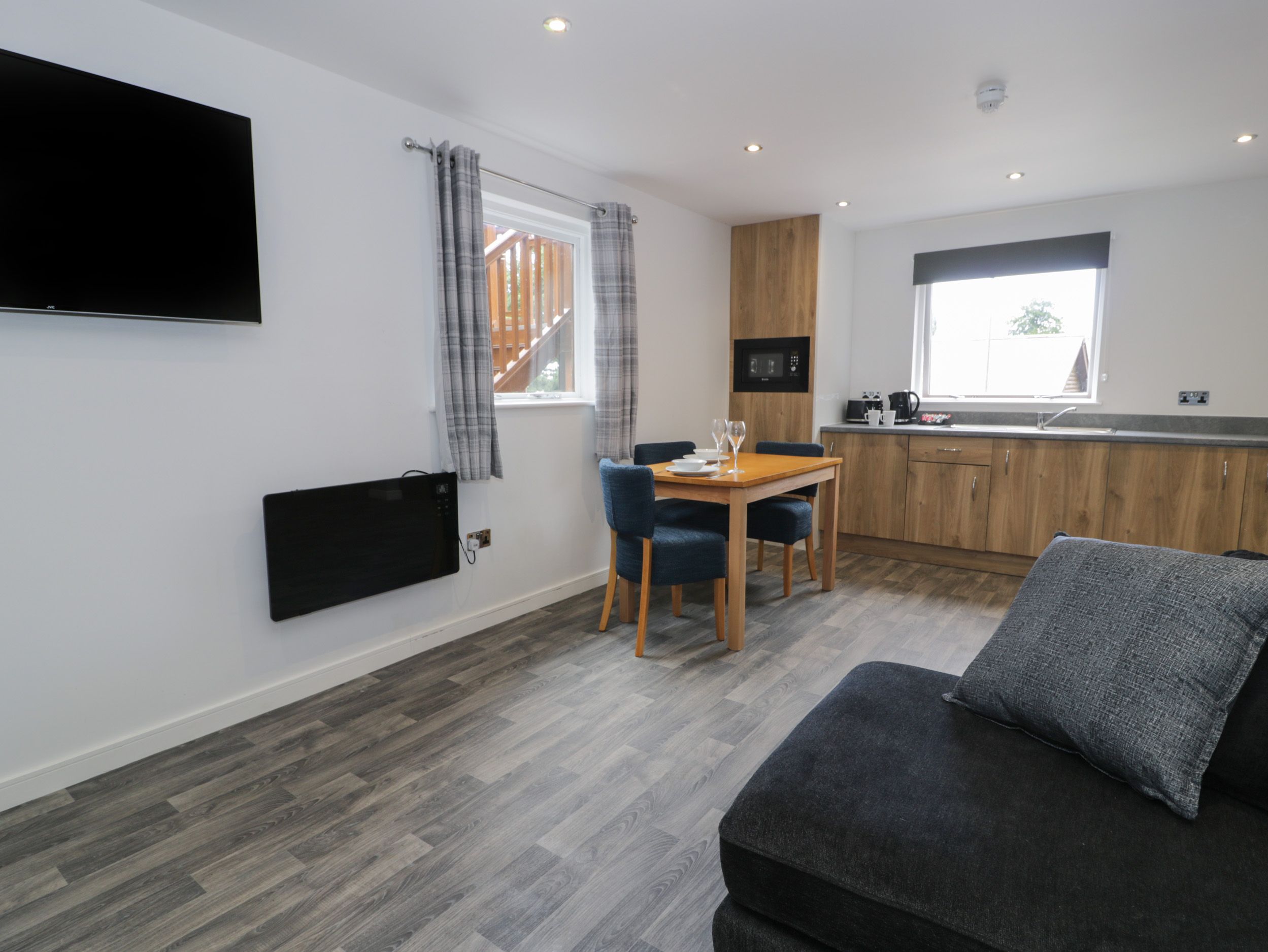 Ground-floor lodge. One king-size bedroom. Shower room with walk-in shower, basin, heated towel rail, and WC. Open-plan living space with kitchen, dining area, and sitting area with electric fire
