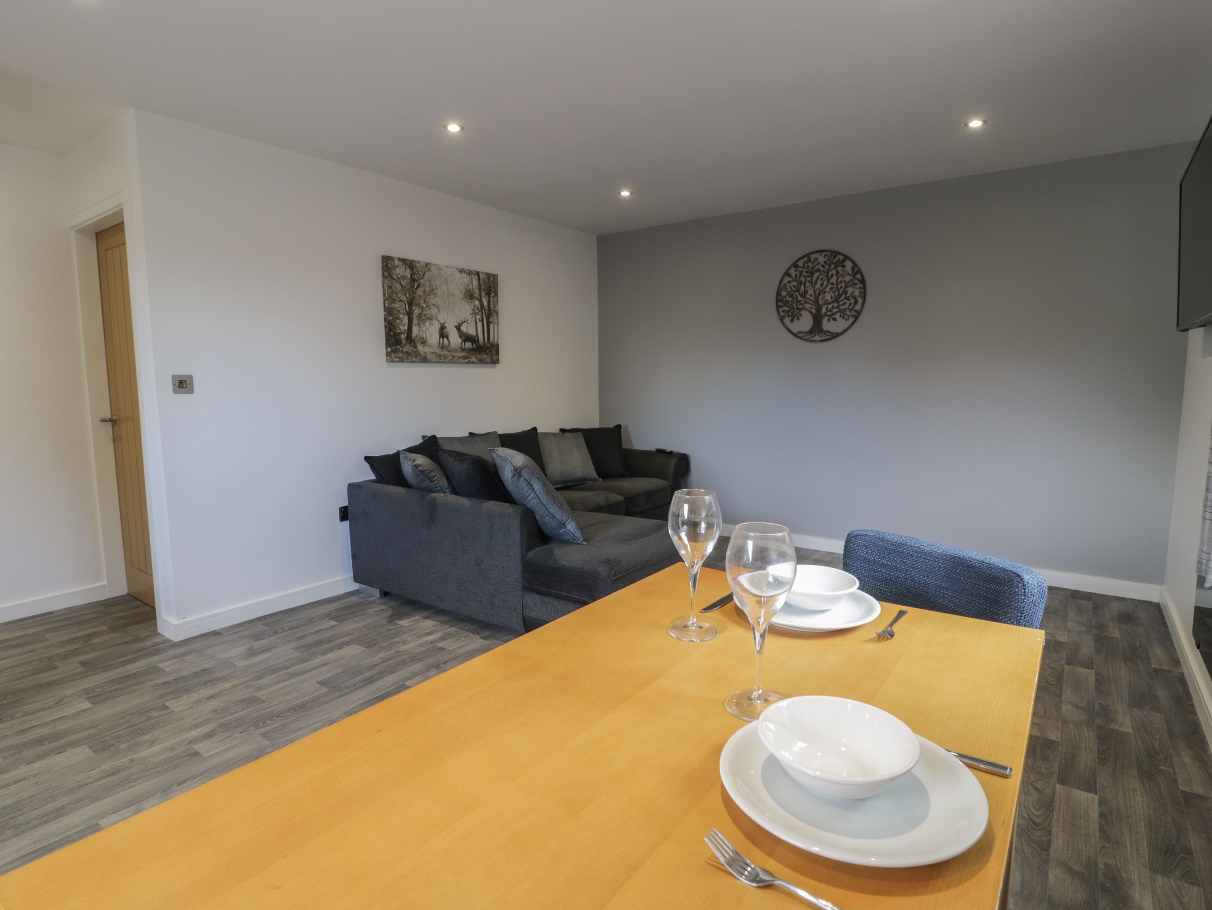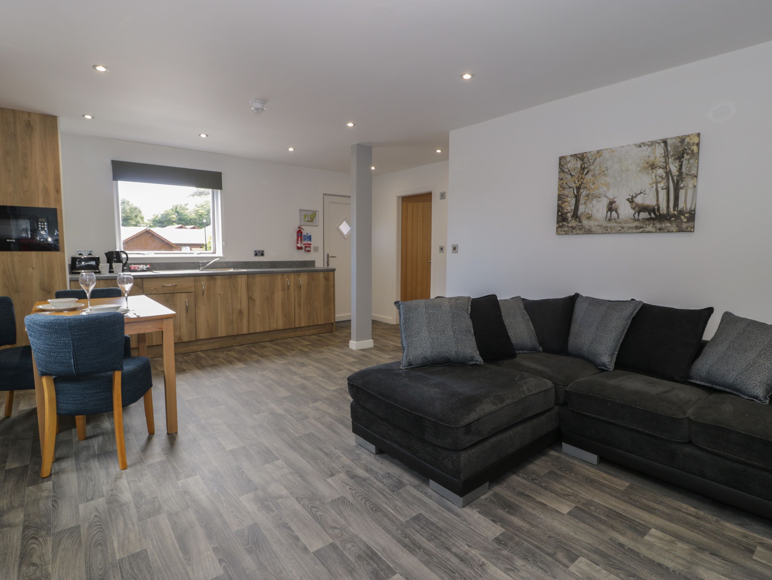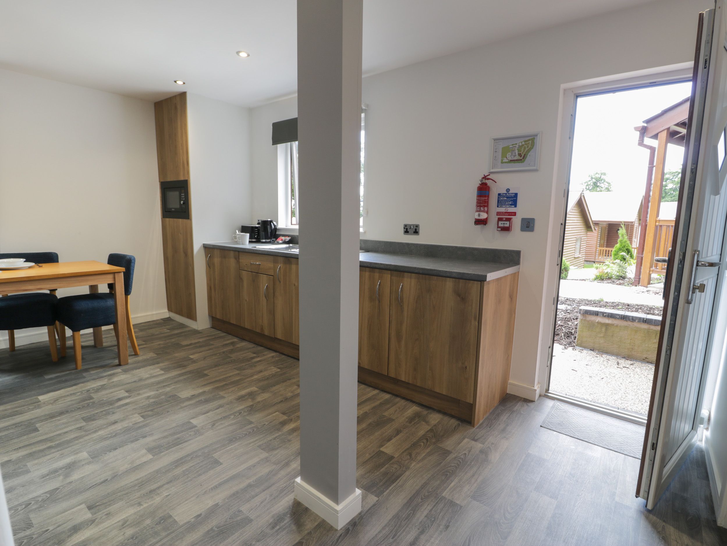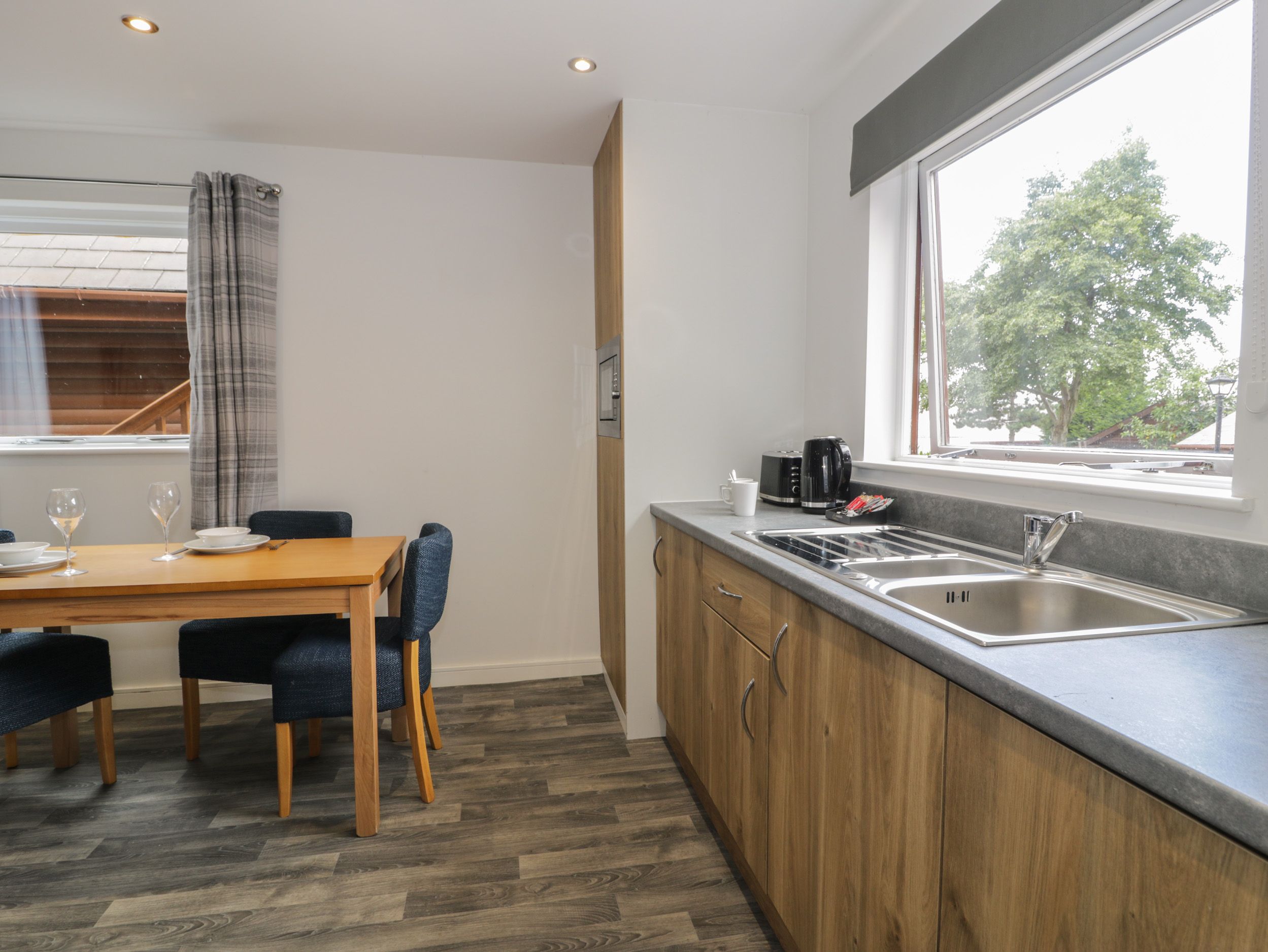 Ground-floor lodge. One king-size bedroom. Shower room with walk-in shower, basin, heated towel rail, and WC. Open-plan living space with kitchen, dining area, and sitting area with electric fire