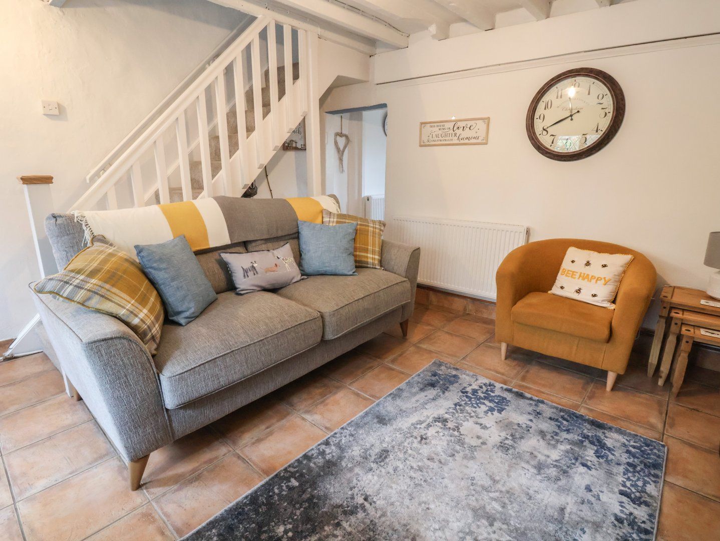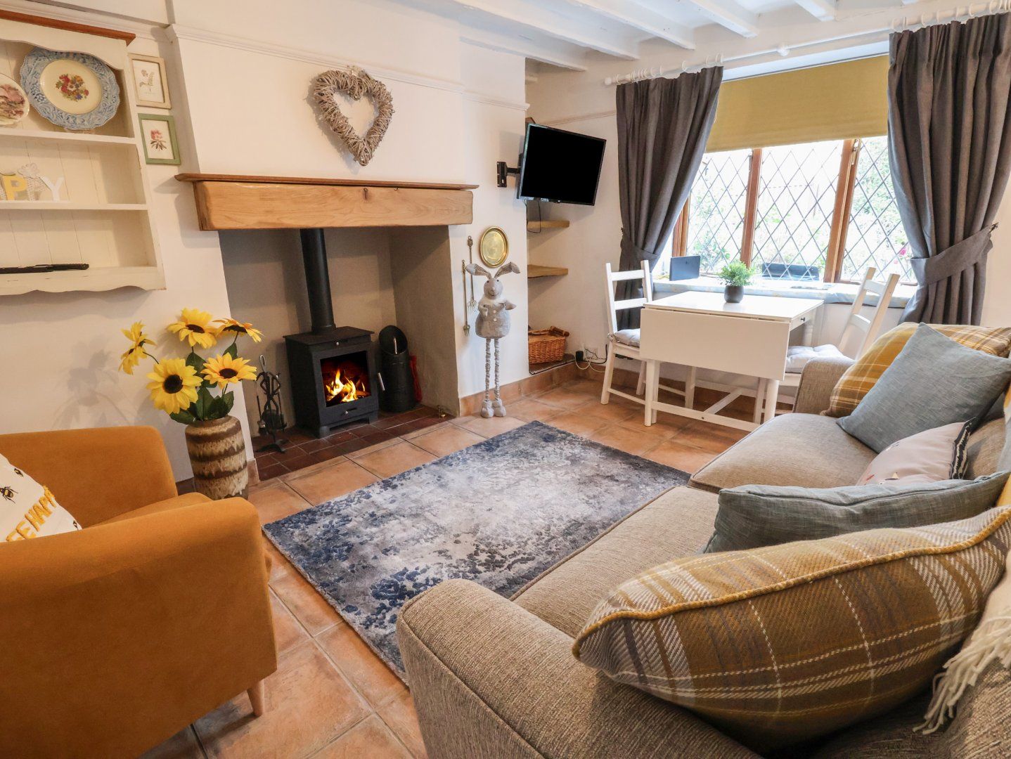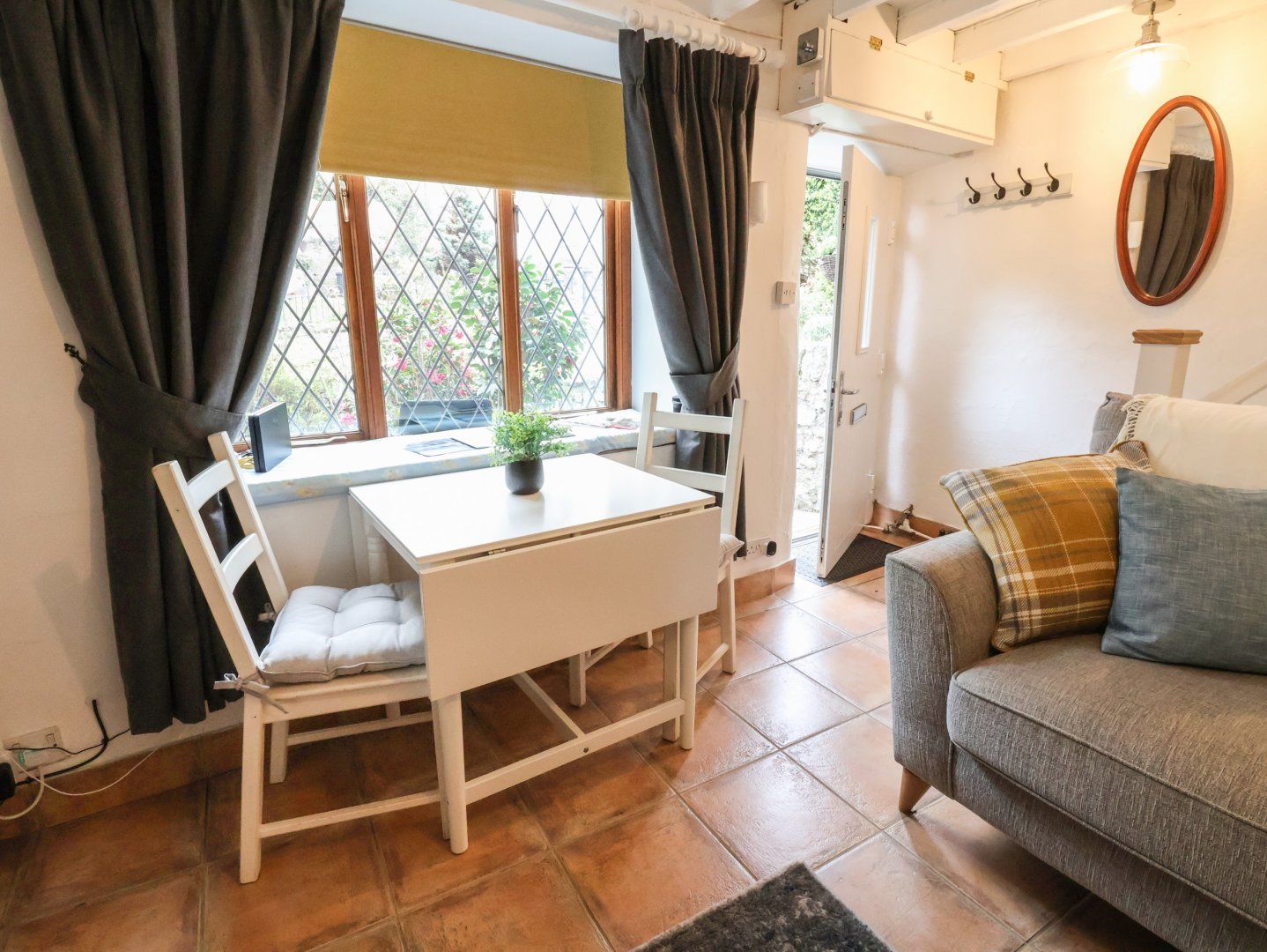 Amenities Electric heating with combi-boiler. Electric oven, electric hob, microwave, fridge, freezer, slimline dishwasher, washing machine. Smart TV, WiFi. Fuel and power inc. in rent. Bed linen and towels inc. in rent. 1 small well-behaved dog allowed. Free public car park nearby. Split level garden with patio with furniture and lawn with decking, AstroTurf, and furniture. Sorry, no pets and no smoking. Shop 0.4 miles, pub 0.1 miles, river 0.1 miles. Note: Steep stairs, please supervise children. Note: Low doorway into kitchen. Note: This property has external CCTV. Note: Low ceiling on staircase. Note: Due to steep stairs and split level garden, this property may not be suitable for those with mobility issues