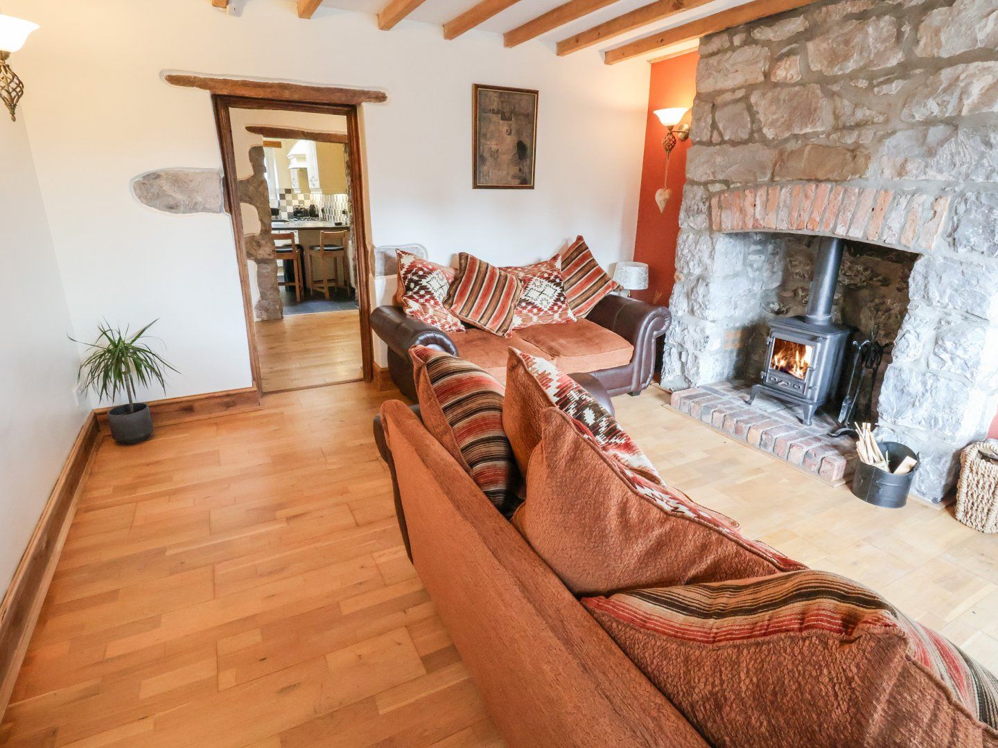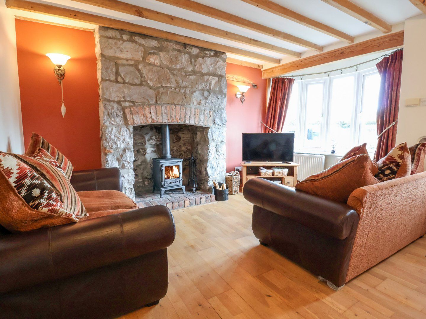 Amenities Gas central heating. Electric oven, gas hob, microwave, fridge with ice-box, washing machine, dishwasher. Smart TV, WiFi. Fuel, power, and starter pack for woodburning stove inc. in rent. Bed linen and towels inc. in rent. Travel cot, highchair and stairgate available on request only. Off-road parking for 1 car, with further roadside parking on a first come, first serve basis. Front garden with astroturf and seating, enclosed rear garden with astroturf, patio, and furniture. Two well-behaved dogs welcome. Sorry, no smoking. Shop 0.3 miles, pub 0.1 miles, River Clwyd 0.2 miles. Please note: The second twin bedroom can also be made up as a king-size room upon request. Note: Please contact the owners for additional pets. Note: There are steps and an unfenced drop to the exterior of the home; please be careful. Note: Low doorways throughout the home; please be careful
