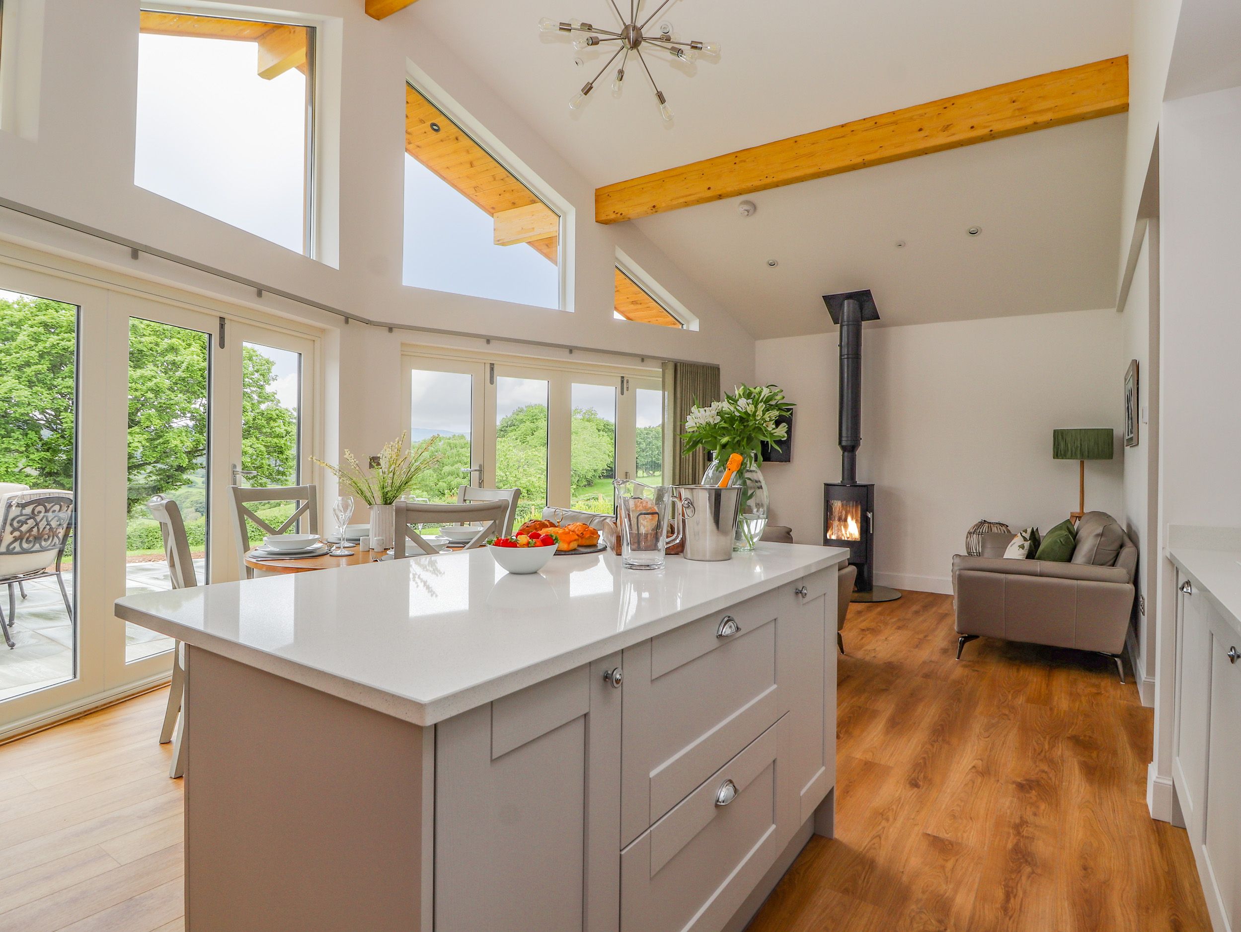 Accomodation Details Single-storey. Two bedrooms: 1 x king-size with en-suite bath, basin and WC, 1 x twin (zip/link, can be king-size on request). Shower room with walk-in shower, basin and WC. Open-plan living space with kitchen, dining area and sitting area with woodburning stove. Utility