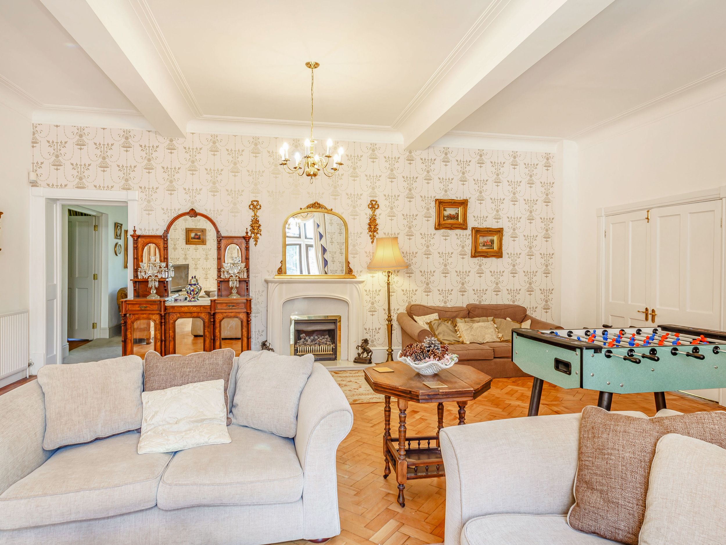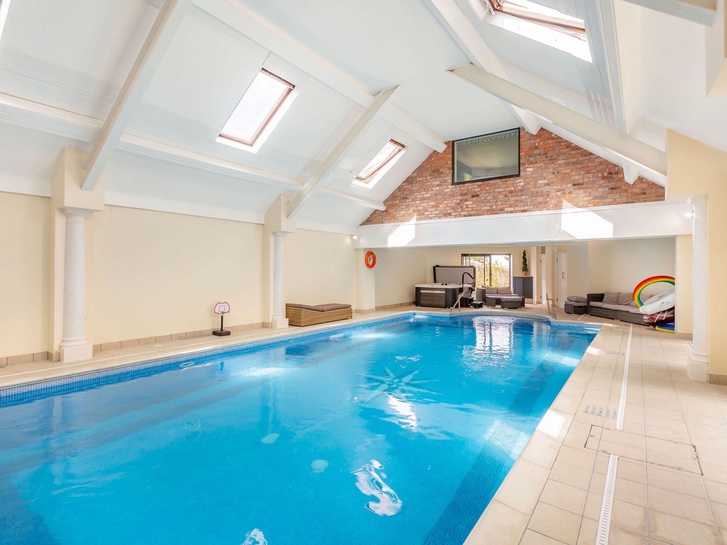 Accomodation Details Sykes Gem Awards 2024 Gold winner for Best for Large Groups. 6 bedrooms - 1 x Family room (king-size double and 2 singles) with en-suite bath, shower over, basin and WC, 1 x (king size double room) with en-suite bath, shower over, basin and WC, 1 x (king size double room with additional single bed) with en-suite bath, shower over, basin and WC, 1 x (king size room double with additonal single bed) with en-suite bath, shower over, basin and WC, 1 x (king size double room) with en-suite bath, shower over, basin and WC, 1 x (king size ground floor double room). Annexe with 2 bedrooms (bedrooms 6 & 7 on ground floor 1 x king-size double, 1 x twin) with Jack-and-Jill access to bathroom and open plan living area with kitchen. Bathroom with bath, shower over, basin and WC. Sitting room. Dining area (seats 18) and sitting area. Drawing room. First floor games room with snooker table, pool table, darts board, dance floor, bar, Sky TV, fridge, seating area, basin and WC. Private heated indoor swimming pool (measuring approx 5m x 12m, depth 1.2m to 2.1m) and Jacuzzi, sauna with changing room with shower, basin and WC.his property only accepts bookings -