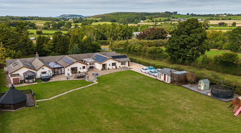 Amenities Biomass central heating with partial underfloor heating. Electric Range cooker with oven and hobs, microwave, 2 x full size fridge & 1 x fridge freezer, washing machine, tumble dryer, 2 x dishwashers, wine cooler, integrated coffee machine. 8 x TVs with Sky Stream. Apple TV and Netflix, DVD, Apple HomePod and surround sound speakers, PlayStation 3 with games, WiFi. Fuel, power and starter pack for wood burning stove inc. in rent. Bed linen and towels inc. in rent. Cot and highchair available. Ample off-road parking with detached garage with garden fridge. Private, enclosed garden with furniture, barbecue hut, chiminea, activity centre, trampoline and six-seater Jacuzzi hot tub with waterfall function and Bluetooth sound system. Indoor heated swimming pool (1.2m uniform depth). Three well-behaved pets welcome. Sorry, no smoking. Shop and pub 0.5 mile. Note: Check-in from 4pm and check-out by 10am. Note: Pool is heated to 33 degrees celsius year round.