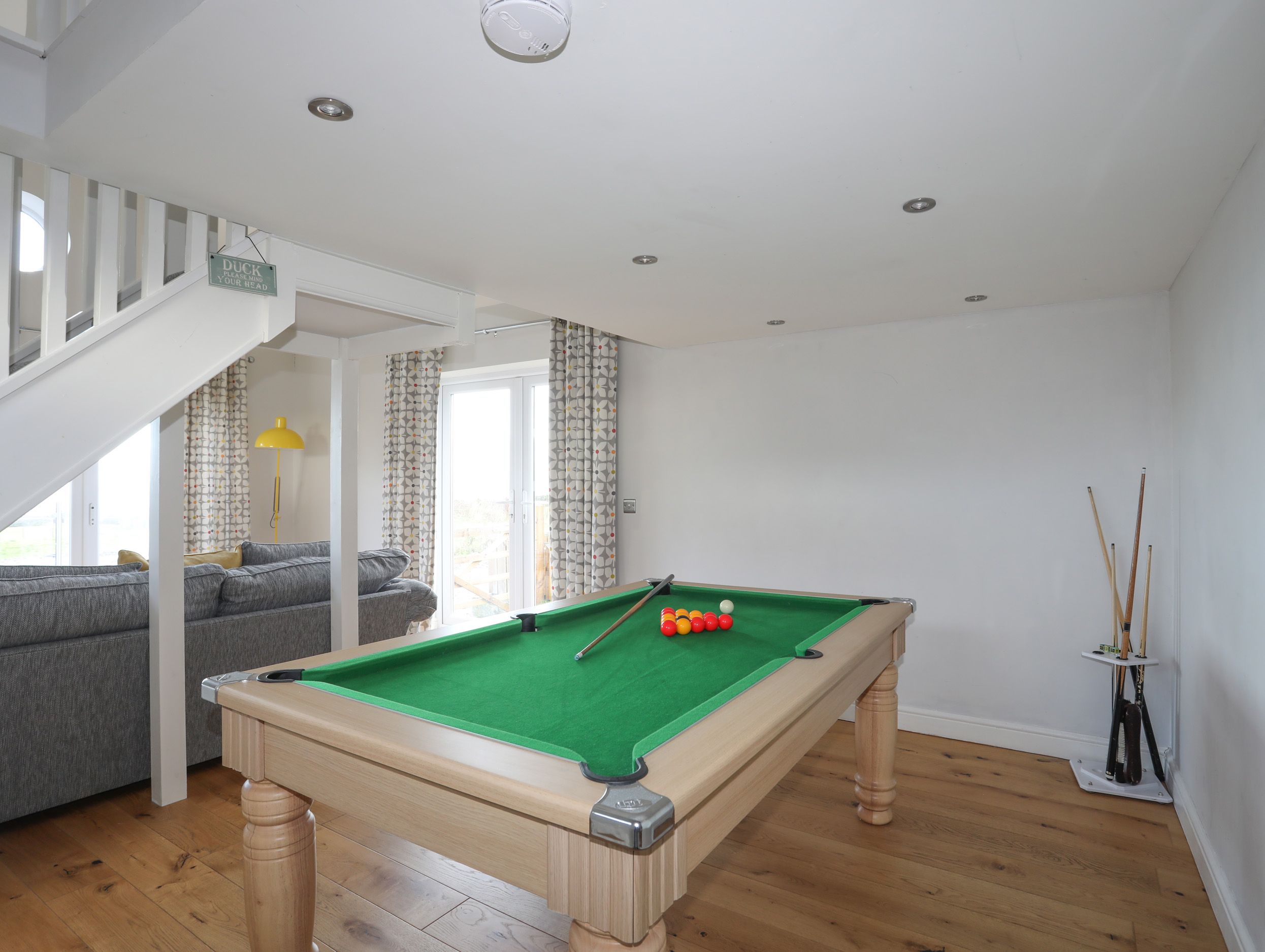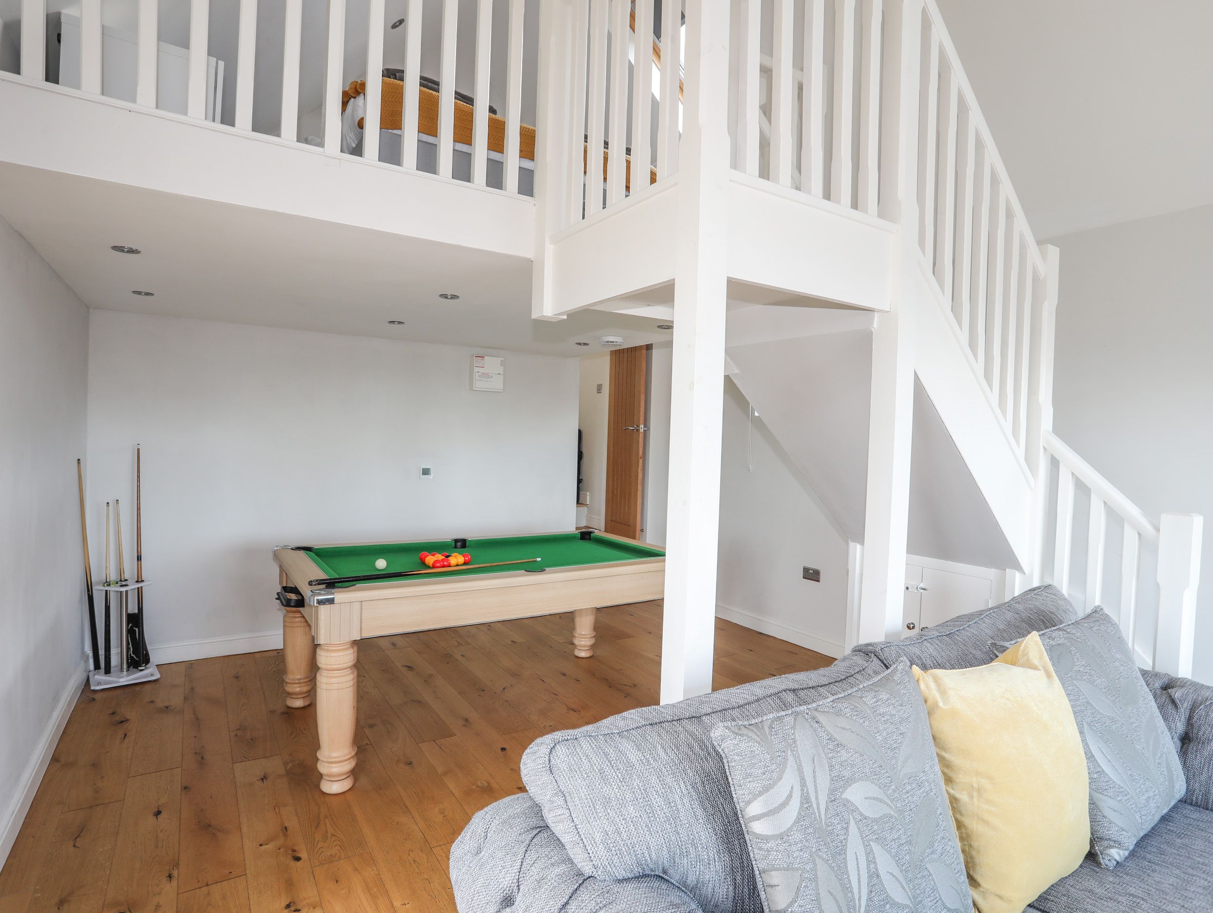 Amenities Central heating with 2 x woodburning stove . Electric double ovens, hob, microwave, fridge/freezer, washing machine, tumble dryer, dishwasher, 3 x hairdryers. 3 x Smart TVs, Xbox, pool table, WiFi, selection of books, games. Fuel, power and starter pack for woodburning stove inc. in rent. Bed linen and towels inc. in rent. Highchair and travel cot available. Private parking for 5 cars with boat parking available. Side patio with furniture and barbecue (charcoal not provided). Side terrace with furniture and hot tub. Two well-behaved pets welcome £50 per pet per stay. Sorry, no smoking. Shop 2.5 miles, pub 2.7 miles, beach 2 miles. Note: The mezzanine double bedroom has sloped ceilings, please take care.