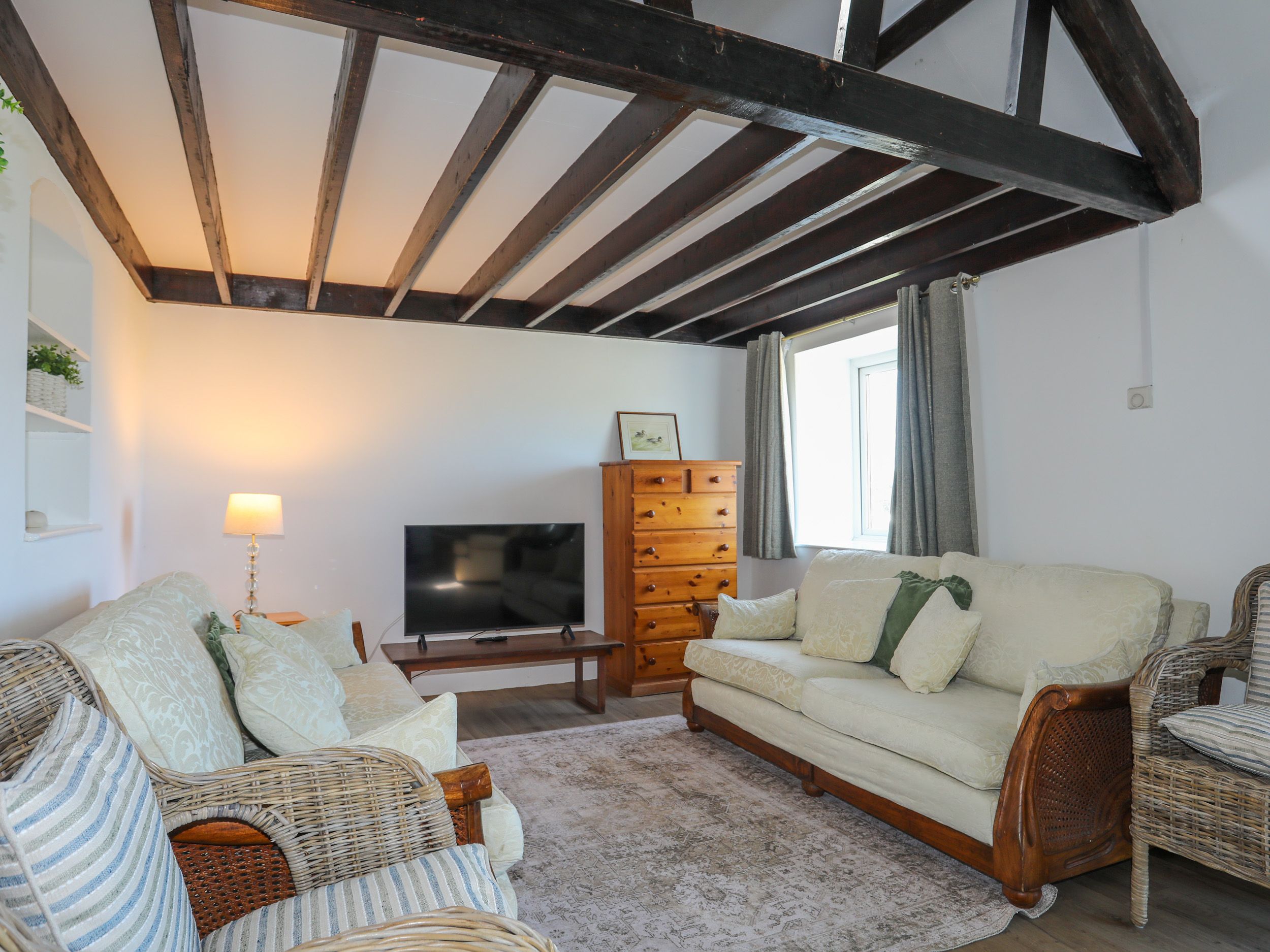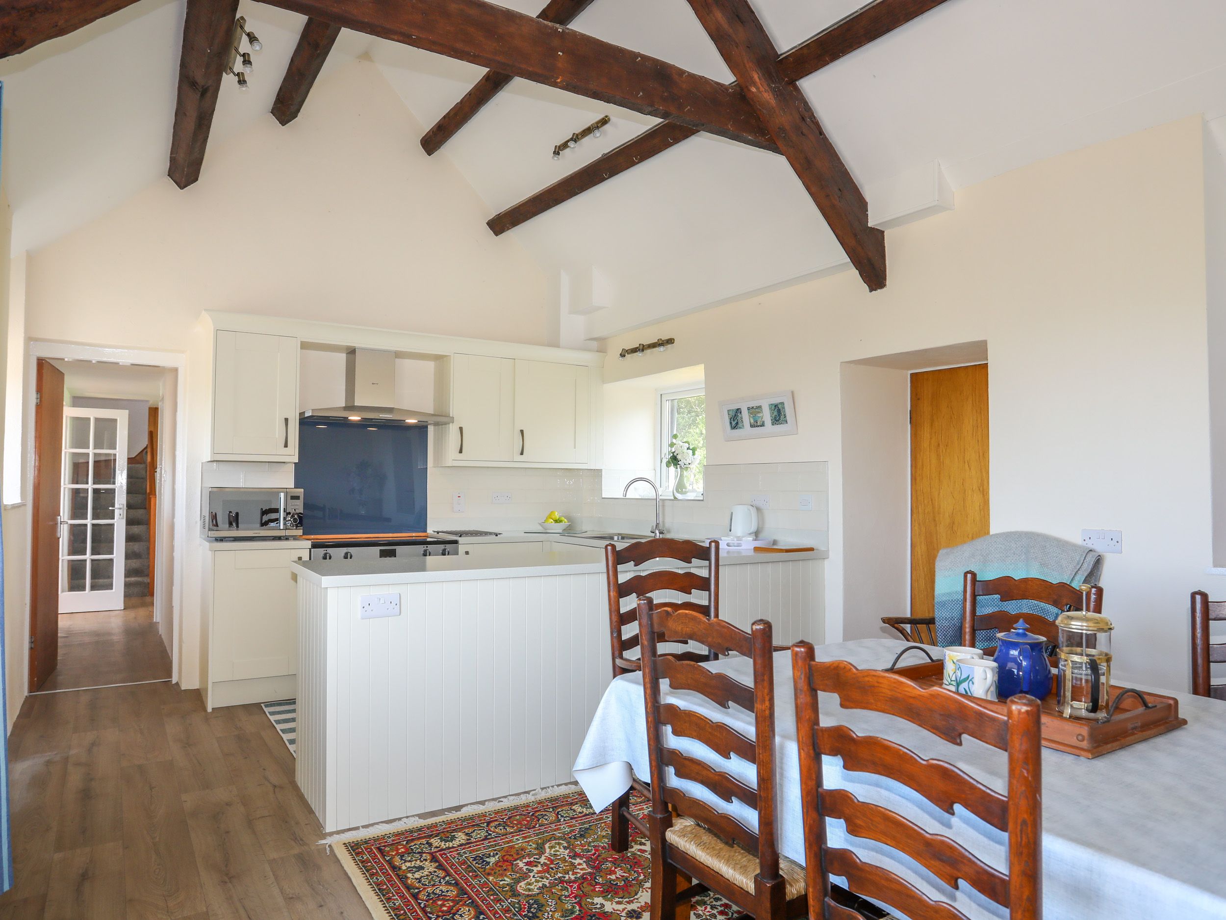 Amenities Oil central heating. Electric range oven with induction hob. Microwave, fridge, fridge/freezer, washing machine, dishwasher, kettle, toaster. Smart TV, TV, WiFi. Fuel and power inc. in rent. Bed linen and towels inc. in rent. Highchair and travel cot available. Off-road parking for 4 cars. Non-enclosed front patio and garden.Two well-behaved dogs welcome. Sorry, no smoking. Note: Check-in from 4pm, check-out by 10am. Note: The property sleeps up to 10 in total the single bedroom with the trundle bed is suitable for children only. Note: Please supervise dogs as there is livestock in neighbouring fields. Note: Please supervise children by the fenced pond. Note: Please take care on the steep stairs to the first floor. Note: There is a good housekeeping bond of £600