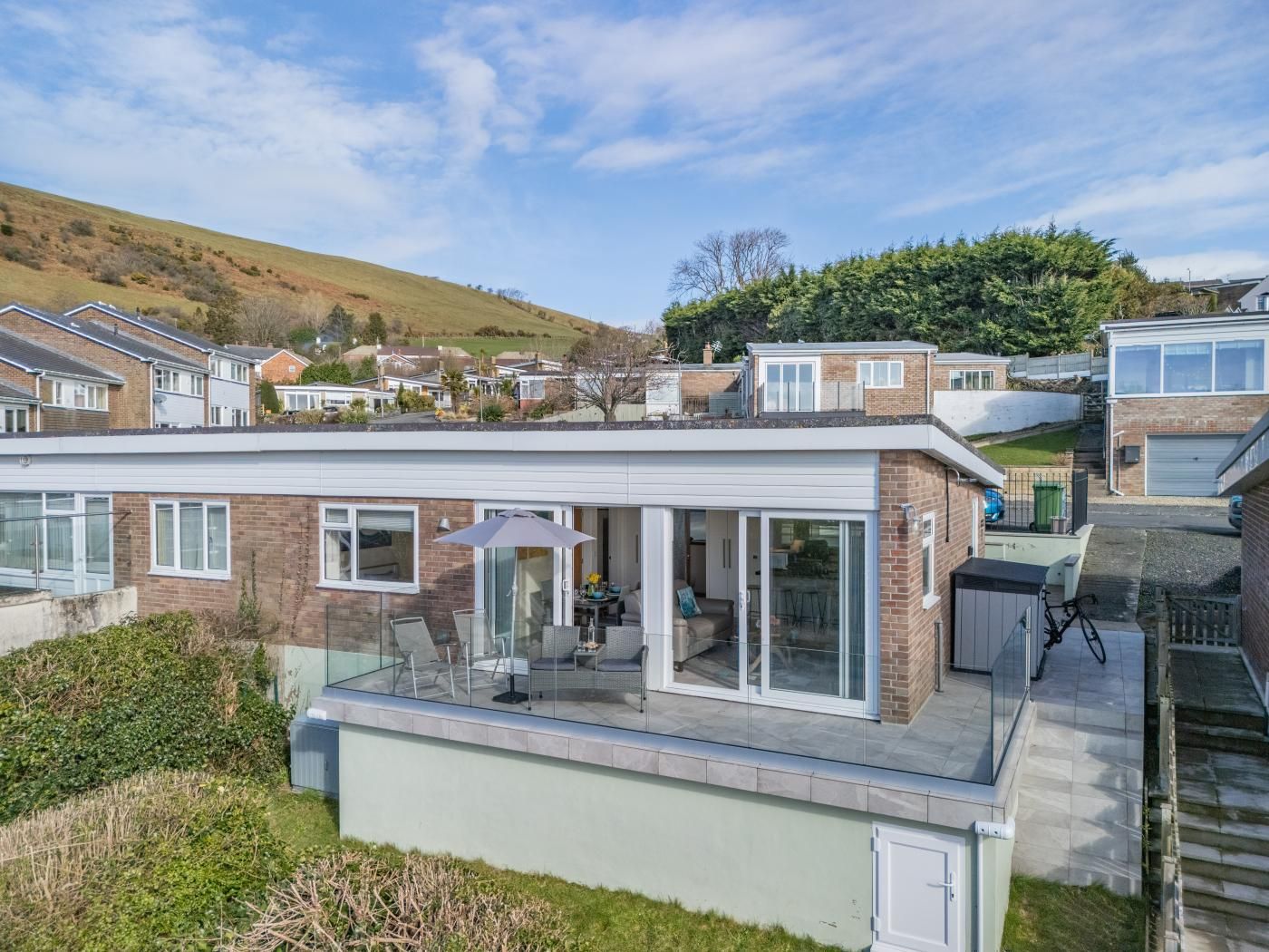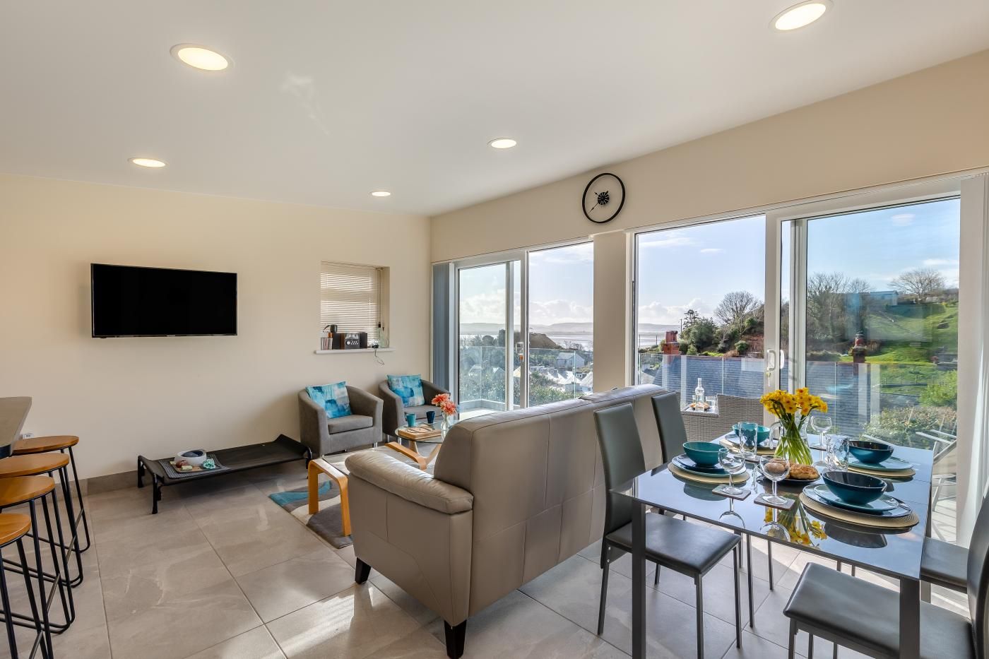Inside this stylishly furnished bungalow, the open-plan lounge/kitchen/diner is bathed in natural light, thanks to the picture windows offering panoramic views of the sea and mountains.