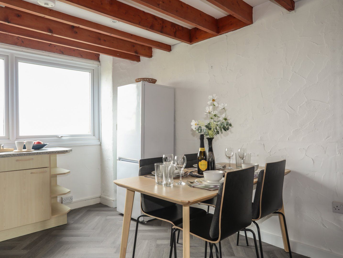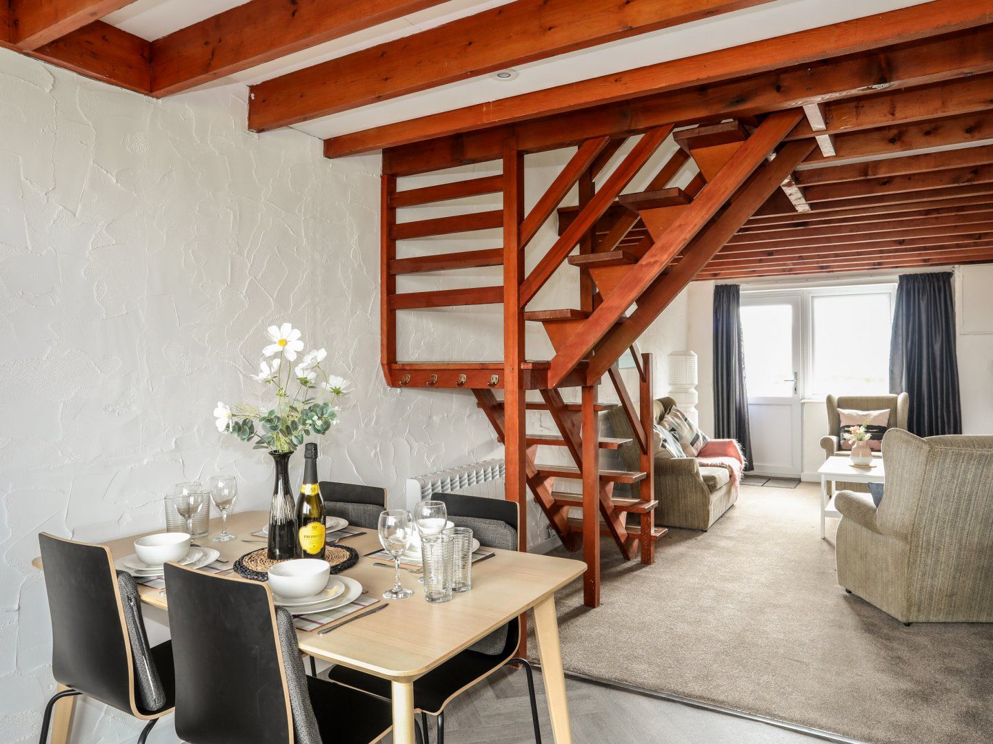 Duplex apartment. Two bedrooms: 1 x double with basin, 1 x twin with basin. Shower room with walk-in shower and WC. Open-plan living space with kitchen, dining area and sitting area with [type] stove