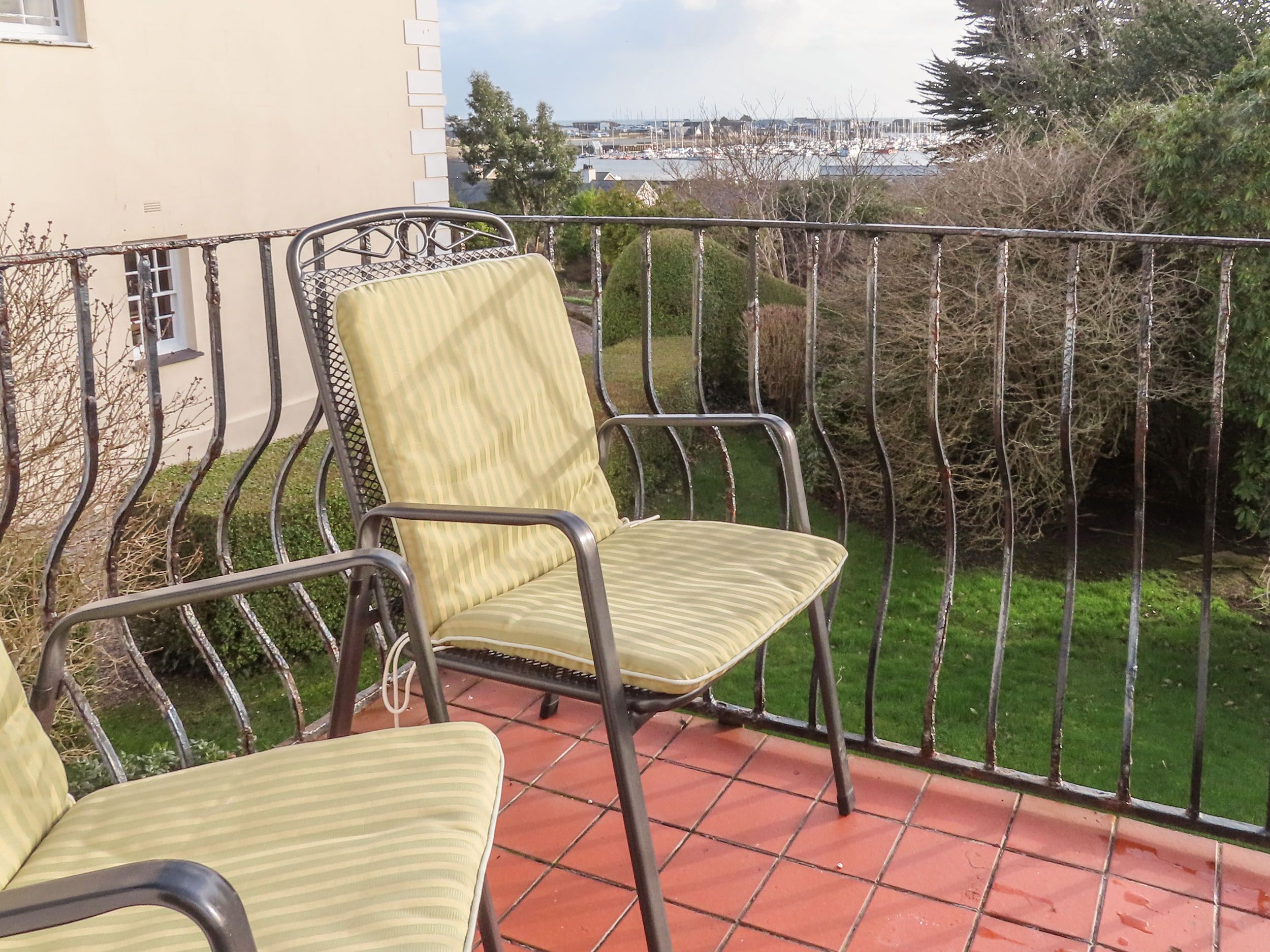 Accomodation Details Two bedrooms: 1 x double, 1 x twin. 1 x bathroom with shower, loo and wash hand basin. Kitchen with electric cooker/hob, fridge and freezer, dishwasher, microwave and toaster. Dining room with table and chairs and sideboard. Sitting room with views to the marina and the sea, comfortable seating, desk and chair, TV, DVD, WIFI. Central heating. Balcony with furniture and sea views. Dedicated washing machine in linen room below the flat. Gardens including a private garden dedicated to Bwthyn. Access: through the original gateway with ample width (8 1/2 ft) for cars, SUV's, vans and boat trolleys and thence by private flat path from dedicated parking to entrance with four steps up to front door (alternate parking in owner's yard may also be available if preferred but involves additional steps to entrance). Shops, amenities and beaches within walking distance.
