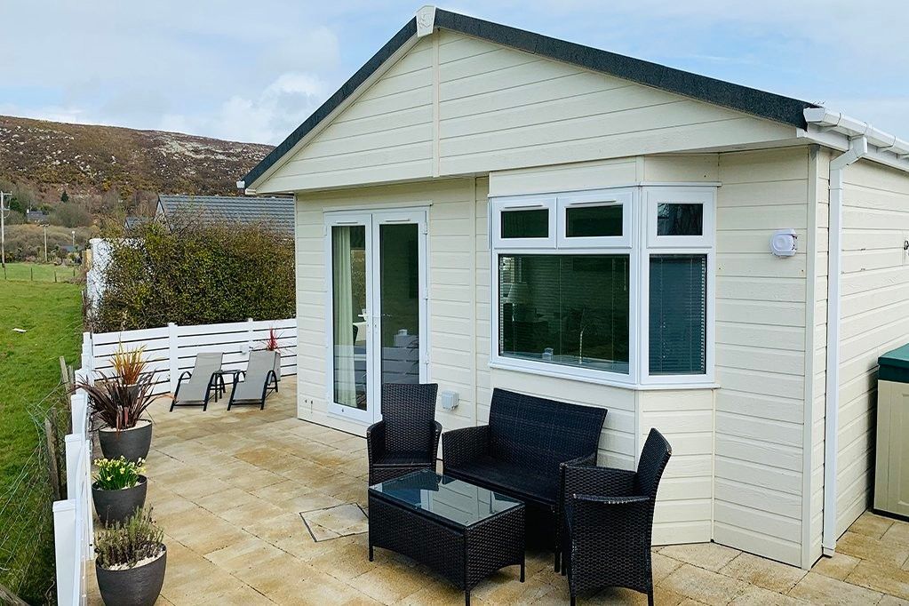 Single storey. Three bedrooms: 1 x double, 1 x twin, 1 x 2’6” twin. Bathroom with bath, shower over, basin and WC. Shower room with walk-in shower, basin and WC. Open-plan living space with kitchen, dining area, sitting area and electric fire. External utility