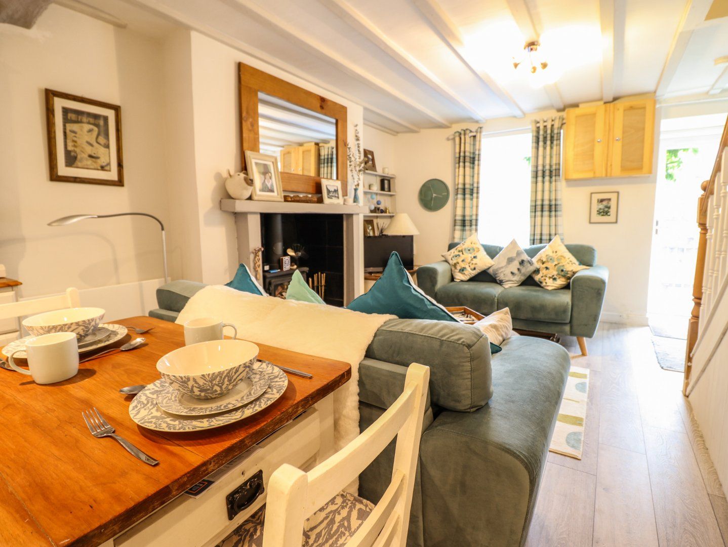 Accomodation Details Two bedrooms: 1 x double, 1 x day bed and a Juliette balcony. Shower room with walk-in shower, basin, heated towel rail and WC. Open-plan living area with kitchen, dining area and sitting area with woodburning stove