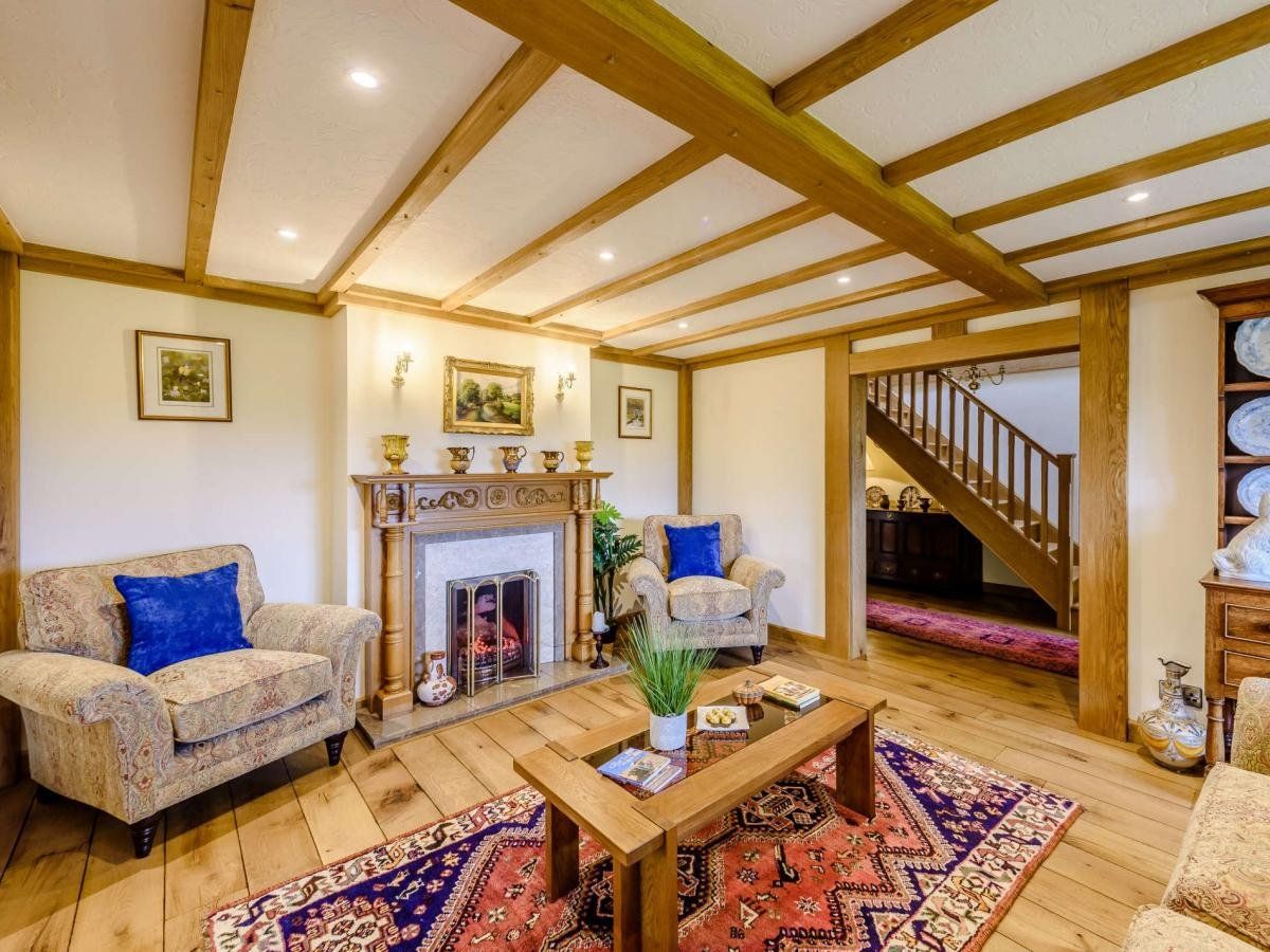 As you step into the hallway you’ll be directed towards the charming living room which features a beamed ceiling and an ornate fireplace.
