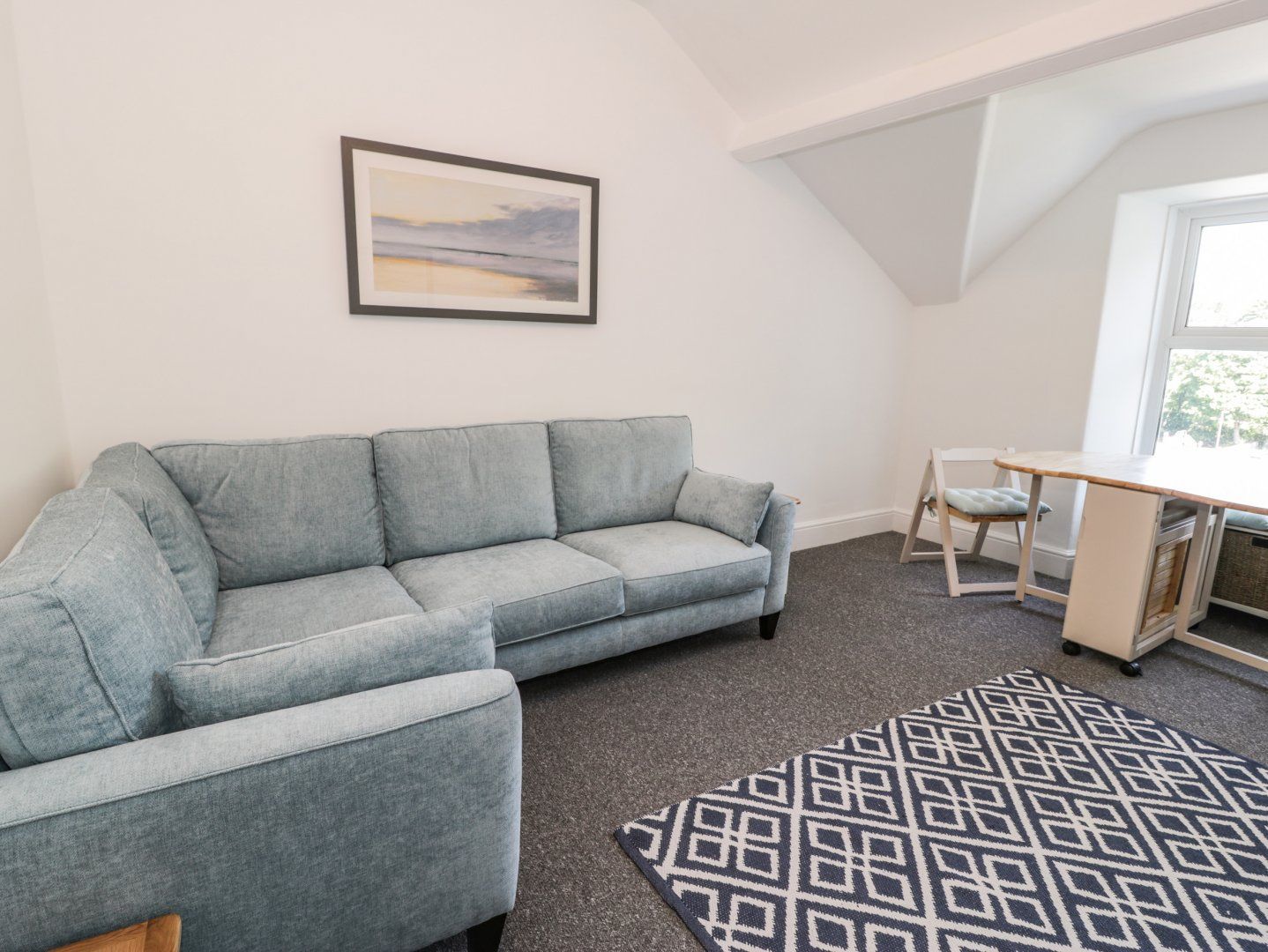 This first-floor apartment has two bedrooms including a super-king-size zip/link and a bunk, along with a bathroom, a kitchen and a living/dining room. Appliances include an electric oven and hob, microwave, fridge/freezer and dishwasher and for entertainment there is a. TV and WiFi. One well-behaved pet welcome and outside there is off-road permit parking available for one car in the nearby car park a short walk from the property. Fuel, power, bed linen and towels are all included in the rent. You can find a shop and pub in 0.1 mile and a beach 0.3 miles. Note: The stairs have a handrail. Note: There is no garden. Note: The bathroom is accessed via four steps and there are steps between the WC and the rest of the bathroom facilities. Note: One well-behaved dog welcome.