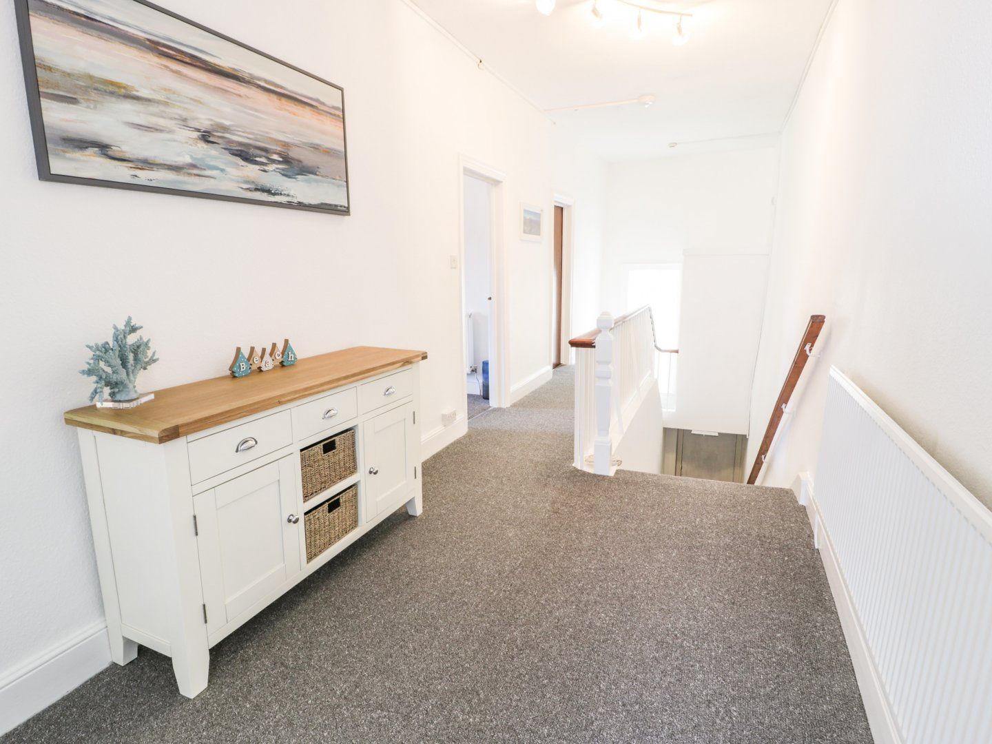 First-floor apartment. Two bedrooms: 1 x super-king-size (zip/link can be twin on request), 1 x bunk. Bathroom with bath, shower over, basin and WC. Kitchen. Living/dining room