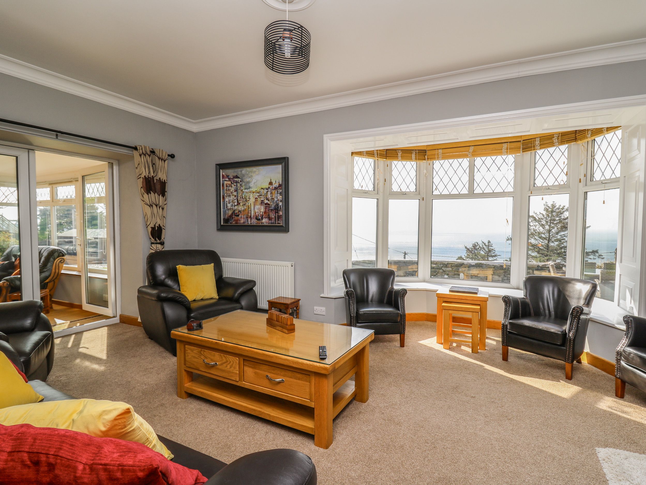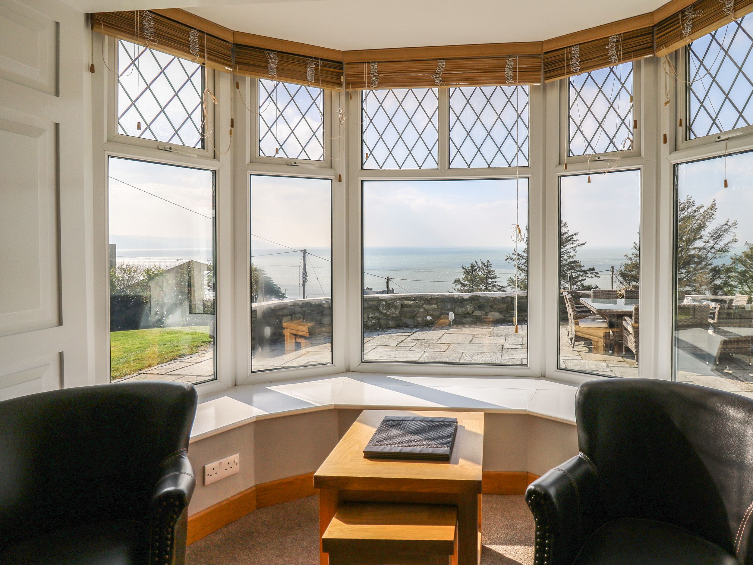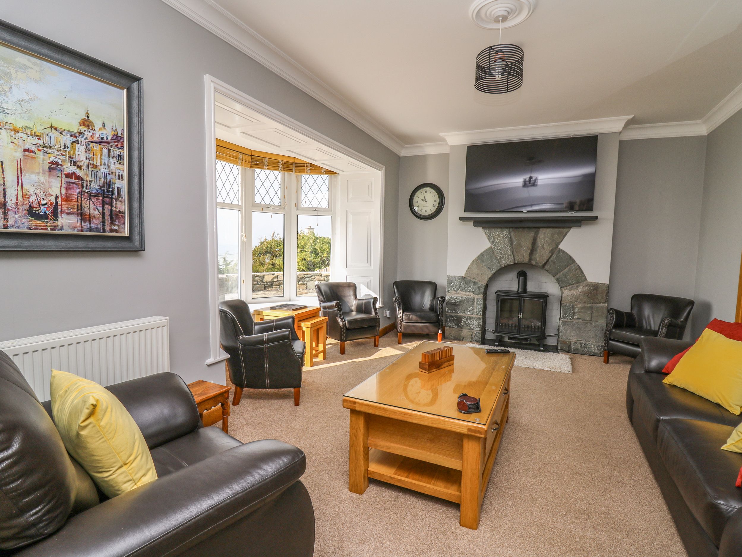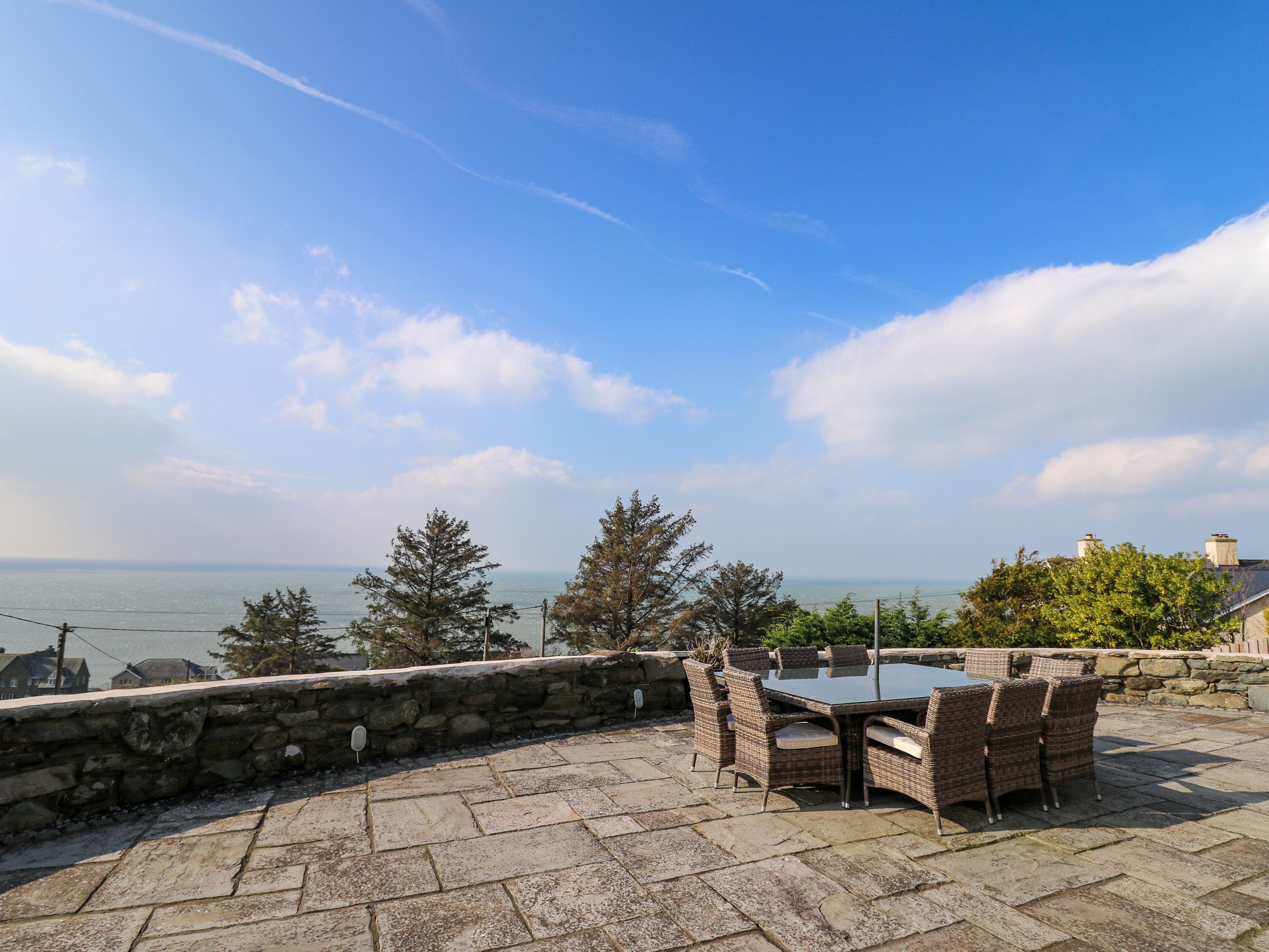 Mynydd ar Mor has five bedrooms in the main house: one super-king-size with en-suite shower room with walk-in shower, basin, heated towel rail and WC, one king-size, two double with en-suite shower room, and one twin, plus a bathroom and two cloakrooms. Kitchen/diner with TV, electric double oven range cooker with ceramic hob, microwave, 2 x fridge/freezers, dishwasher, kettle, toaster, double Air Fryer, coffee machine and electric log effect fire. Utility with washing machine and tumble dryer. Sitting room with a TV, electric log effect fire and conservatory. External Annexe: one super-king-size bedroom, a shower room, and living/dining room with TV and electric log effect fire. Internal Annexe: one super-king-size bedroom with an en-suite shower room, living/dining room with TV and electric log effect fire and a conservatory. Oil central heating, WiFi, fuel and power, bed linen and towels are included in the rent. Two highchairs and travel cots on request. Private off-road parking for seven cars. Enclosed garden with lawn, patio, charcoal barbecue and furniture. Sorry, no pets and no smoking. Nearest shop in 0.7 miles, pub in 0.1 mile, beach in 0.1 miles. Bring your family to Mynydd ar Mor for an unforgettable get-together. Note: Property is on a hill and the lawn is sloped, please take care with children. Note: Check-in is from 4.30pm and check-out is by 10am Note: No Stag or Hen parties. Note: Bookings of 4 nights or more are accepted only over the Christmas and New Year period. Note: there is a CCTV camera at the car park entrance only. Note: The property will only accept 7 night bookings at Christmas and New Year, July-- September (the school summer holidays) and Spring Bank Holiday week commencing 23rd May. In winter 3 night bookings can be taken commencing on Fridays only and 4 night bookings commencing Mondays only