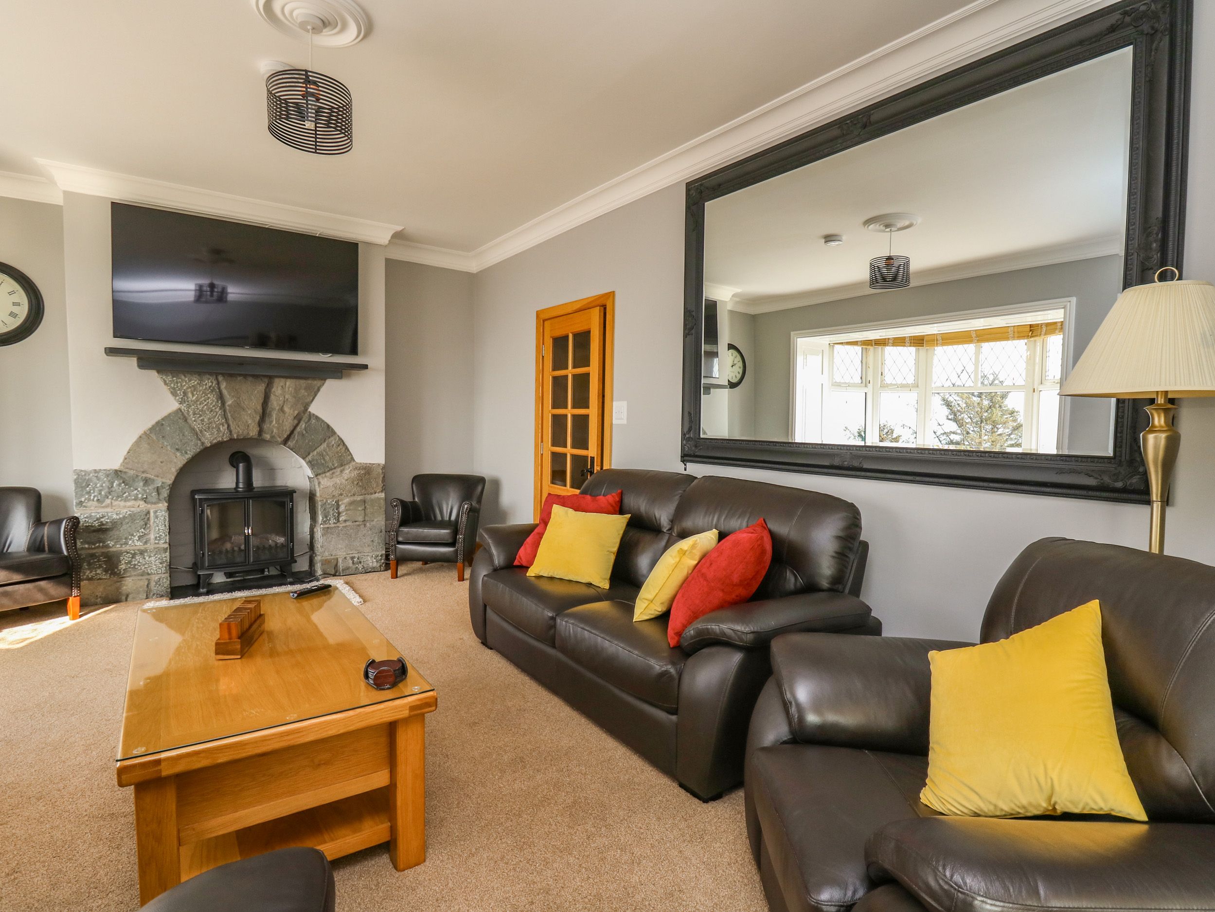 Oil central heating. Electric double oven range cooker with ceramic hob, microwave, 2 x fridge/freezers, washing machine, tumble dryer, dishwasher, kettle, toaster, double air fryer and coffee machine. 4 x Smart 65" TVs, WiFi. Fuel and power inc. in rent. Bed linen and towels inc. in rent. 2x highchairs and 2 x travel cots available on request (no charge). There is a hairdryer in 6 bedrooms. Private off-road parking for up to 7 cars. Enclosed garden with lawn, patio area, with barbecue stand and furniture (please bring your own charcoal and BBQ trays). Sorry, no pets and no smoking. Shop 0.7 miles, pub 0.1 mile, beach 0.1 miles. Note: Property is on a hill and the lawn is sloped, please take care with children. Note: Check-in is from 4.30pm and check-out by 10am. Note: No Stag or Hen Parties. Floor plan can be provided upon request. Note: there is a CCTV camera at the car park entrance only Note: The property will only accept 7 night bookings at Christmas and New Year, July- September (the school summer holidays) and Spring Bank Holiday week commencing 23rd May. In winter 3 night bookings can be taken commencing on Fridays only and 4 night bookings commencing Mondays only