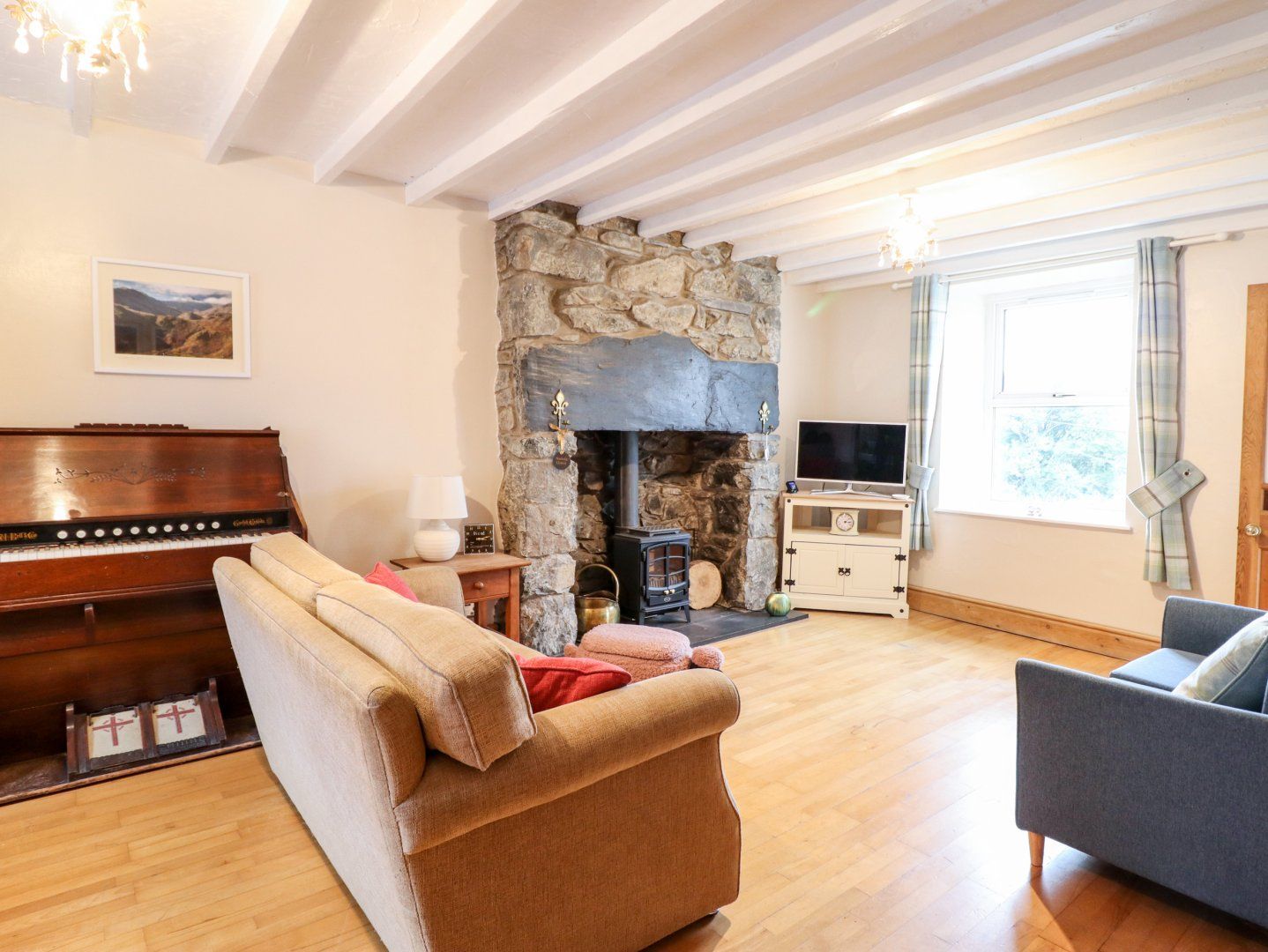 Accomodation Details Set over three floors. Ground floor: Entrance porch with boot storage leading to large, double aspect sitting room / dining room with mountain views, internet TV, feature slate fireplace & electric log burner. Stairs down to lower ground floor: large kitchen/breakfast room with electric oven, induction hob, fridge/freezer, microwave and breakfast table to seat 4. Bathroom with bath, over-bath shower with screen, basin and WC. First floor: Two bedrooms: Main bedroom: double with en-suite shower, basin, heated towel rail and WC. Second bedroom 2 x bunkbeds with views over the Moelwyn mountains. Door from kitchen leading to rear garden & seating area overlooking Moelwyn mountains. Steps down to stone-built shed for bike storage