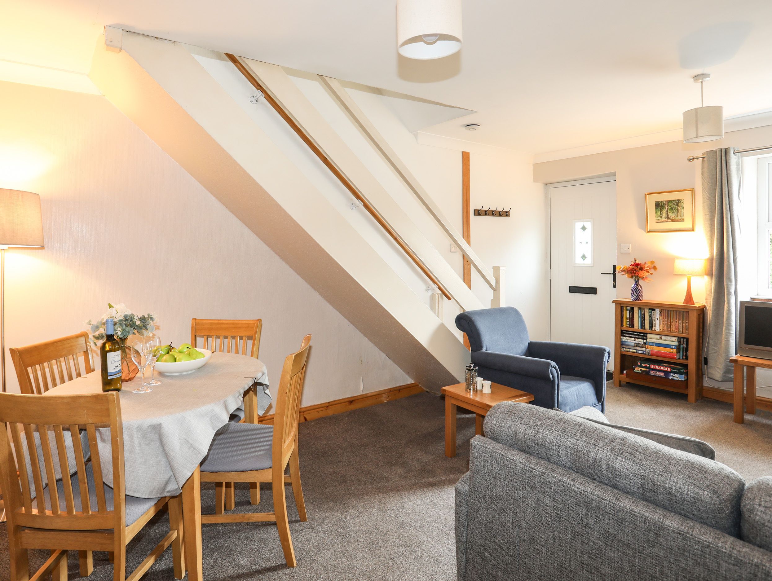 Amenities Electric central heating. Electric oven and hob, kettle, toaster, microwave, fridge/freezer, dishwasher, washing machine, air fryer & coffee maker . WiFi, TV, Bluetooth speaker & a selection of books and games. Fuel and power inc. in rent. Bed linen and towels inc. in rent. Highchair, travel cot and stairgate available (please bring own baby bed linen). Roadside parking available. Enclosed rear garden with lawn & patio furniture. Three well-behaved pets welcome. Initial starter pack for open fire during winter months. Barbecue and starter pack during summer months. Sorry, no smoking. Pub & pub shop across the road, other shops 1.3 miles (inc. Butcher, baker, deli, newsagent & market) Note: Check-in from 4pm, check-out by 10am. Note: The rear of the property has communal access to the other three houses on the row, so we will be grateful if you can supervise your pets when they are in the garden. Note: Please keep dogs downstairs, stair gate at the property.