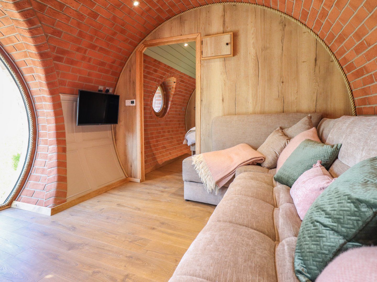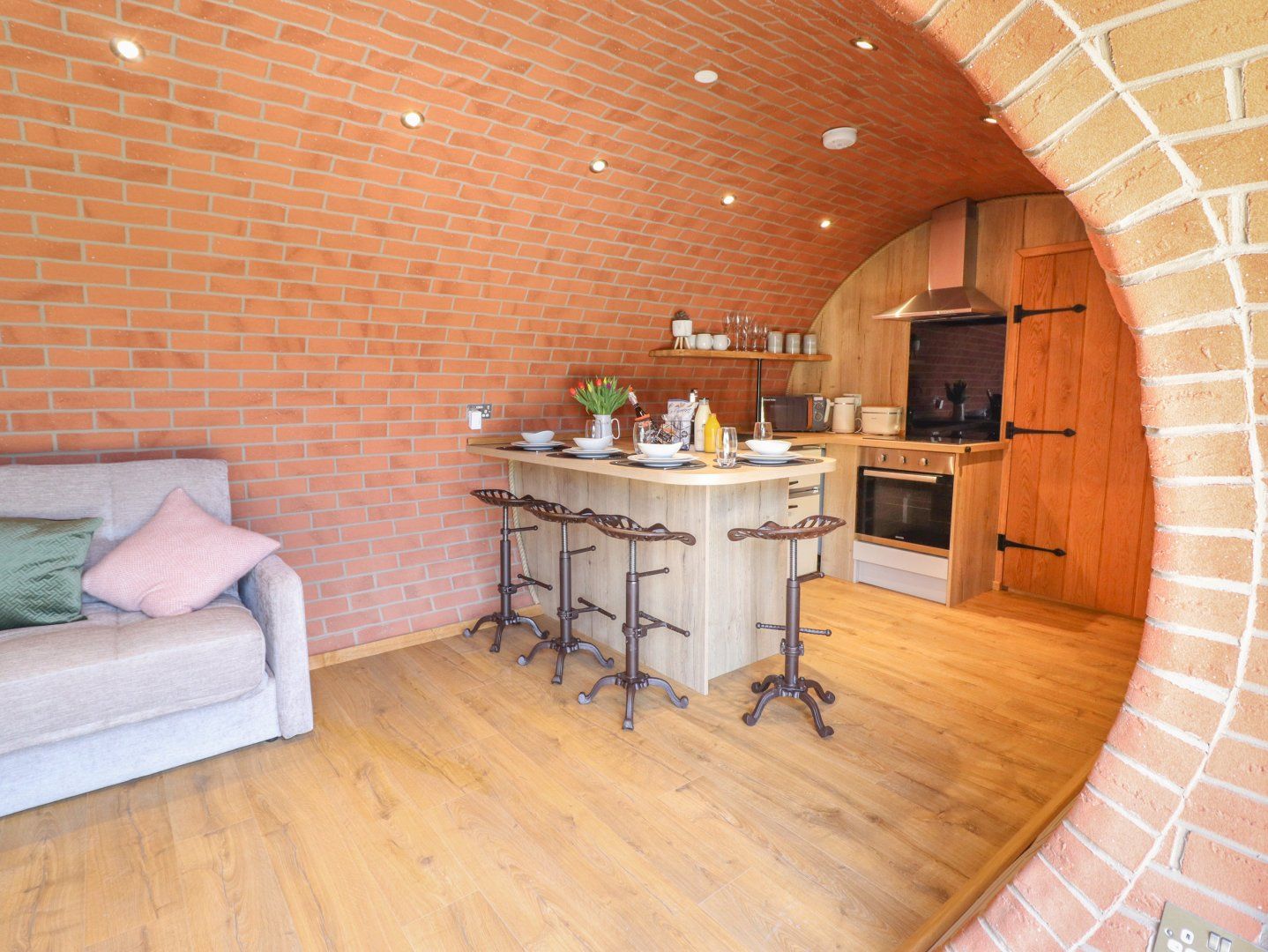 Single-storey. One king-size bedroom. Open-plan living space with kitchen, dining area and sitting area. Shower room with walk-in shower, basin, heated towel rail and WC
