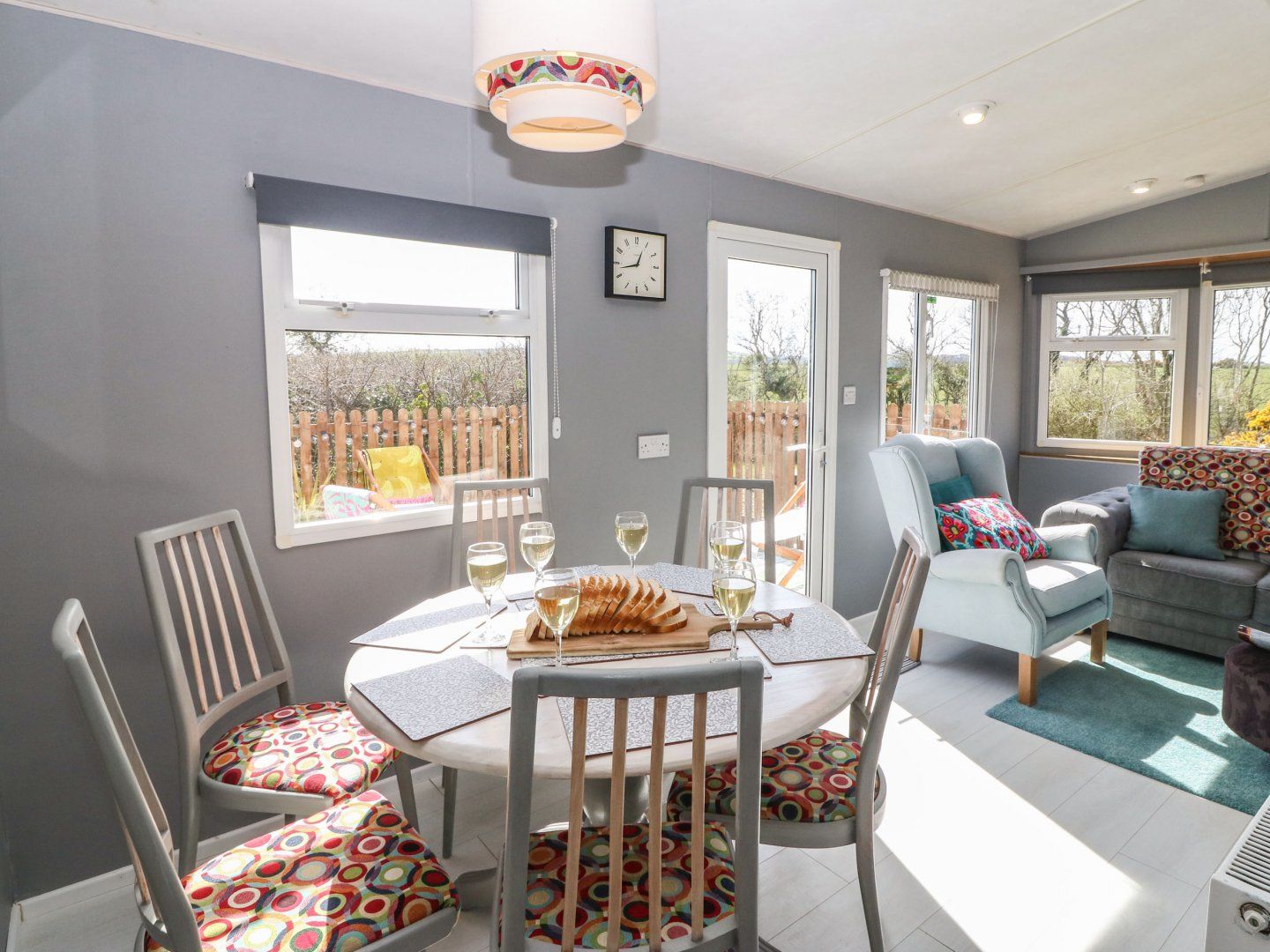 Single-storey. Three bedrooms: 1 x double, 2 x twin. Shower room with walk-in shower, basin, and WC. Open-plan living space with kitchen, dining area and sitting area with gas fire