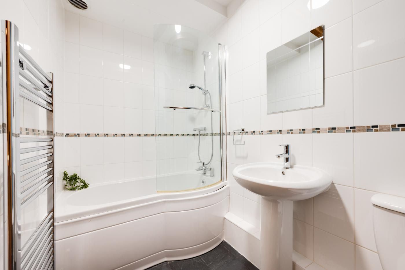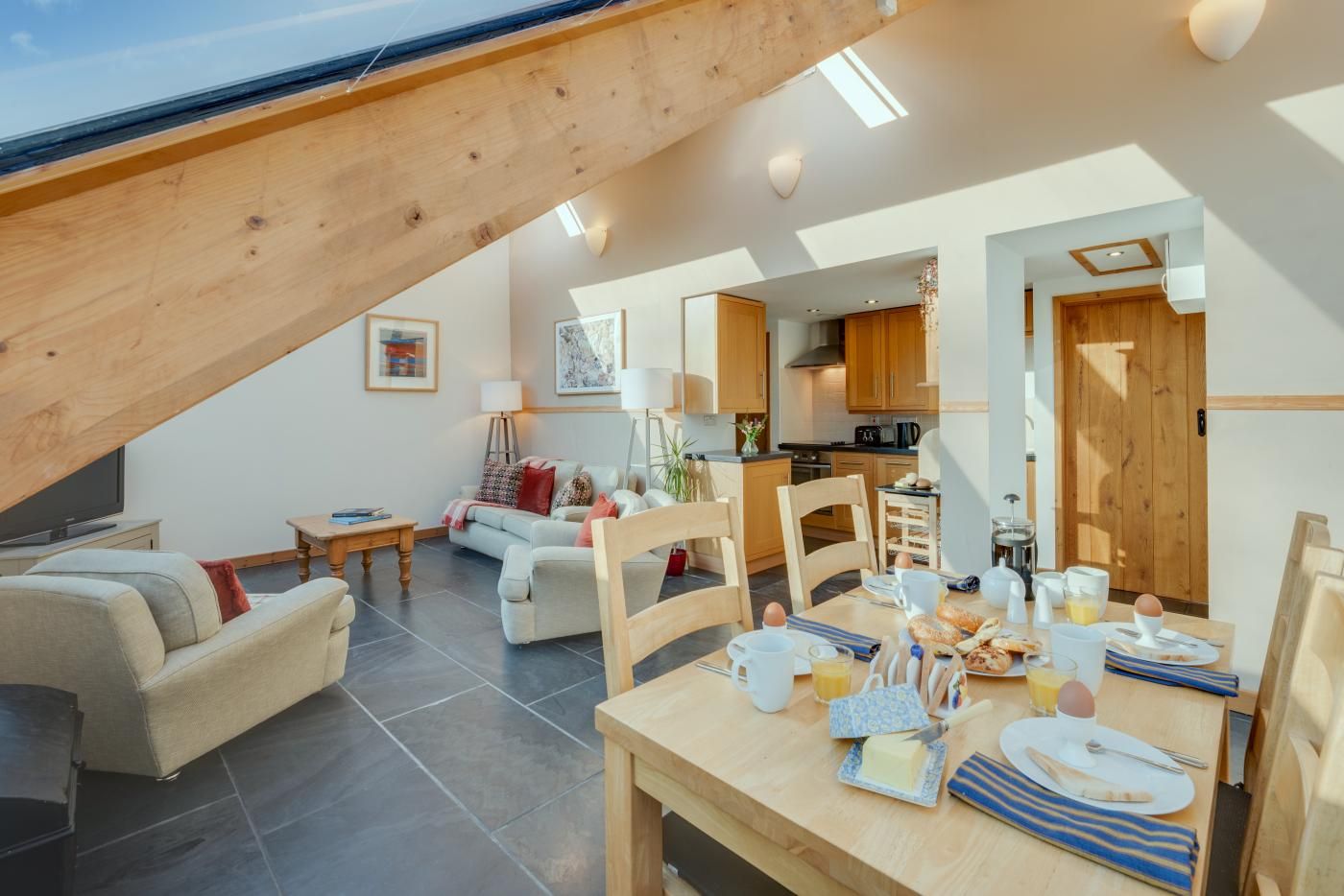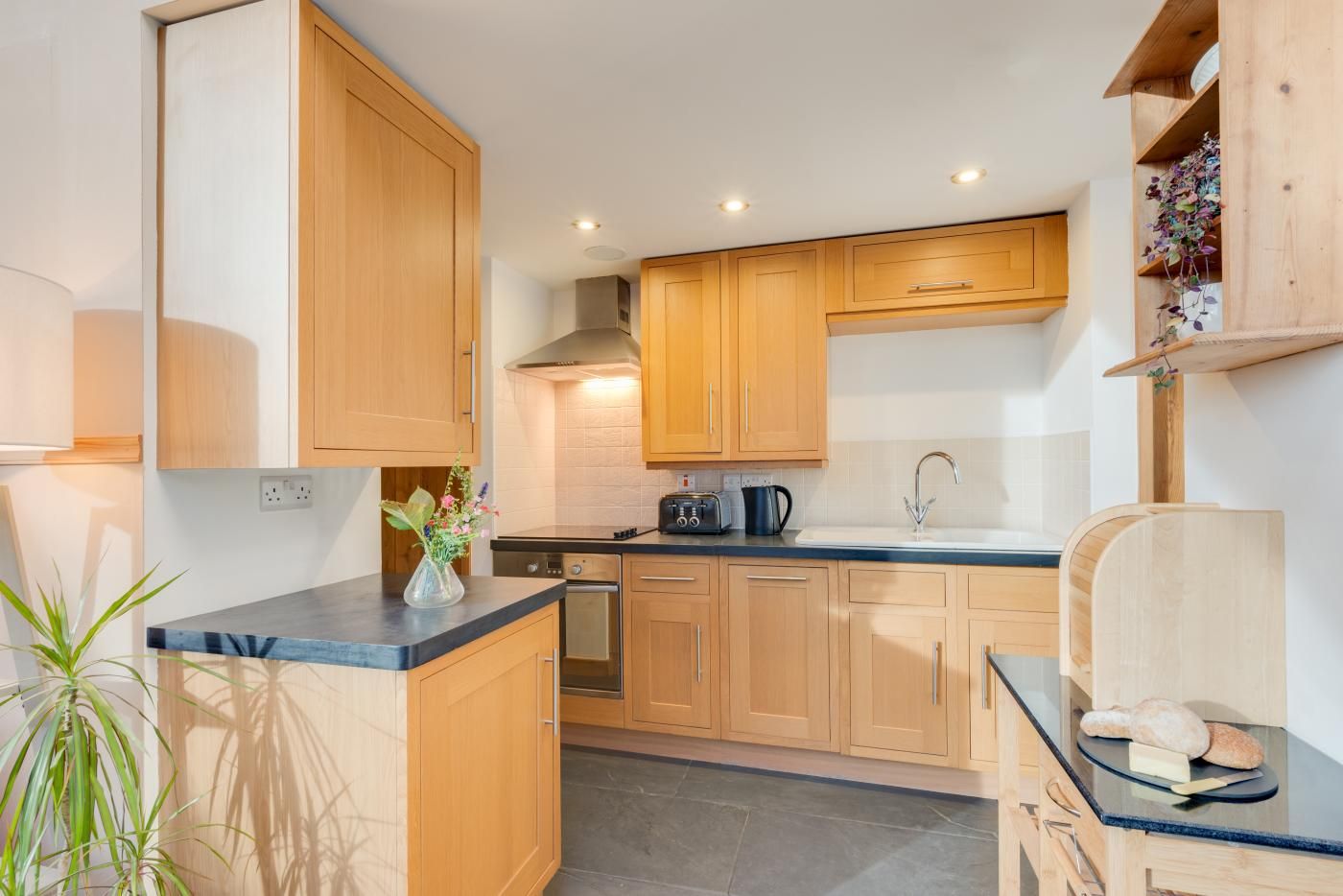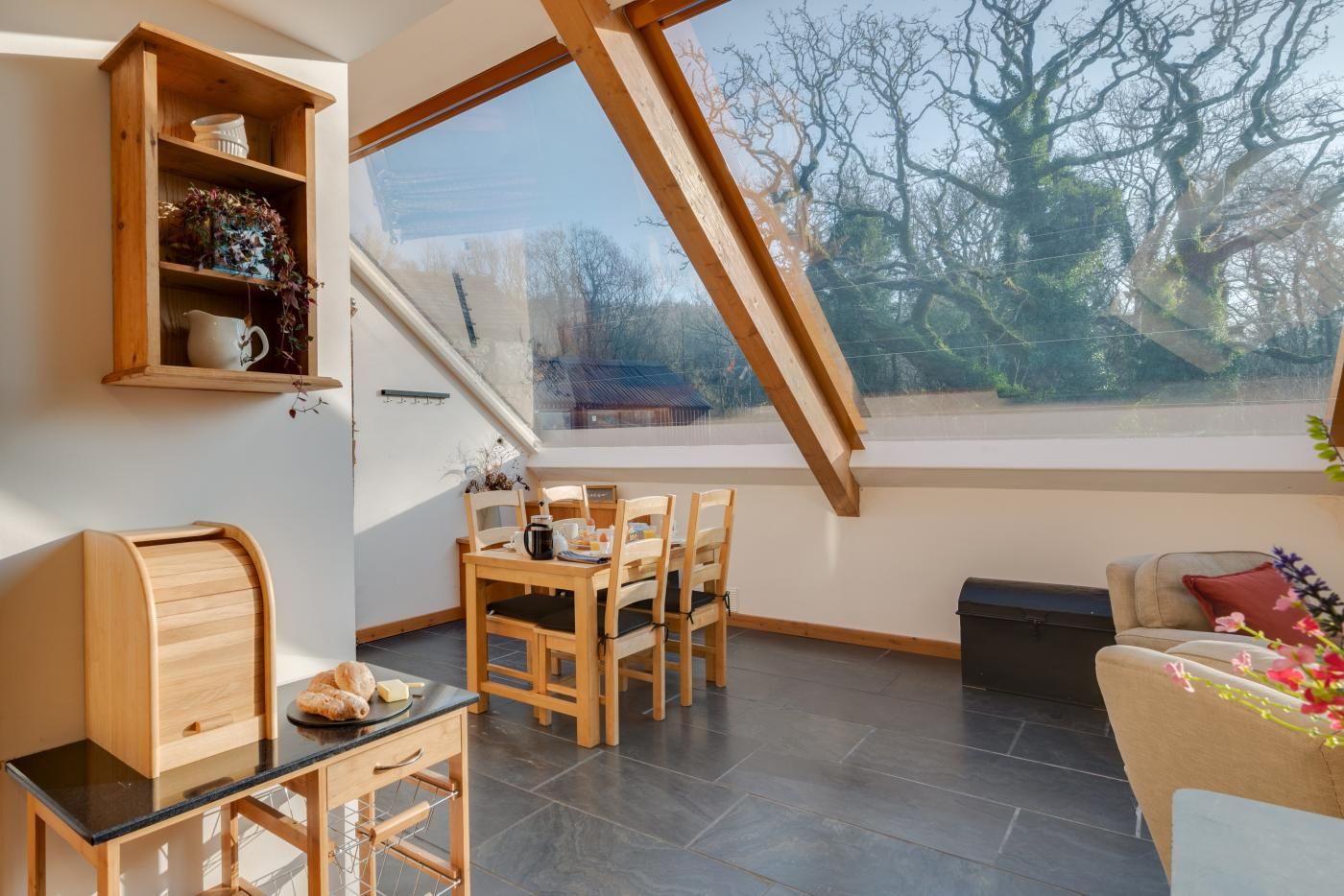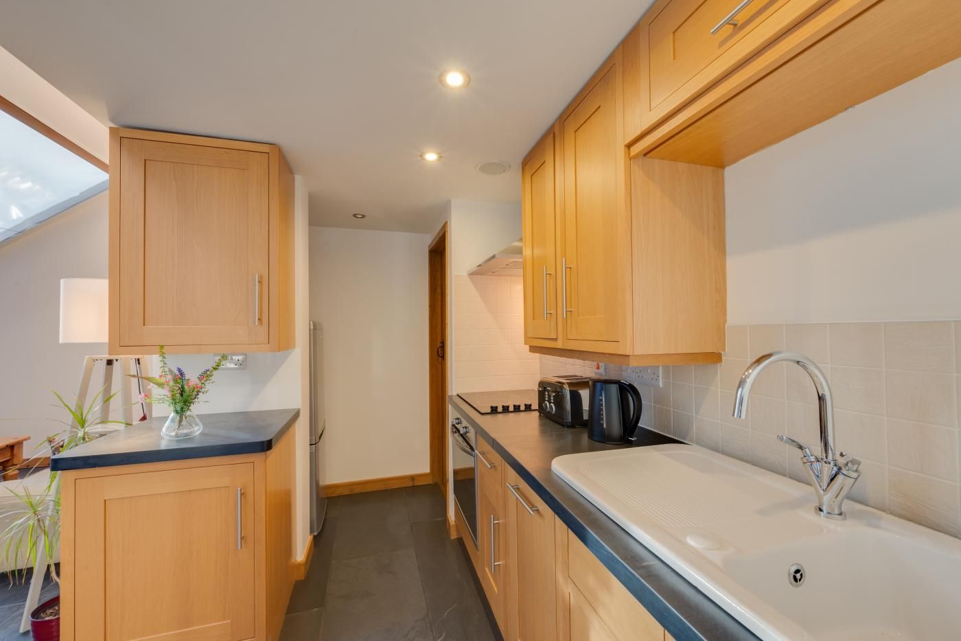 This light and airy property benefits from underfloor heating and a sloping glass roof. The open plan living areas are flooded with natural daylight and the kitchen is well-appointed for all your cooking needs.
