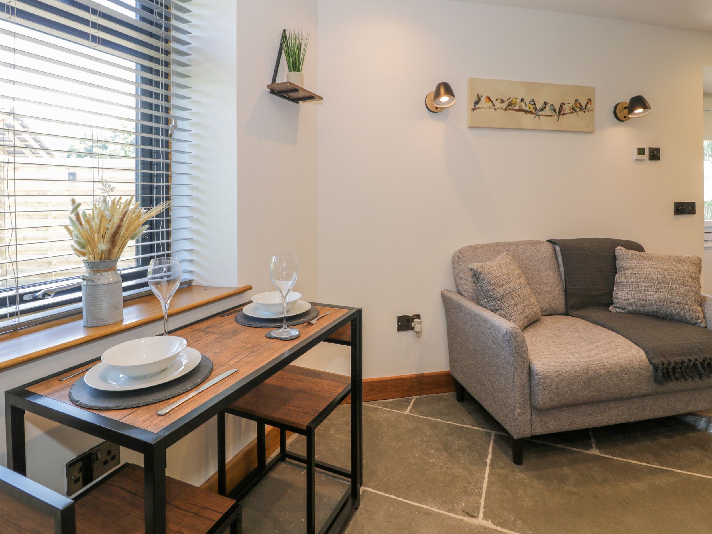 Accomodation Details One double bedroom with Smart TV and en-suite walk-in shower, basin, heated towel rail, and WC. Open-plan living space with kitchen, dining area, and sitting area with woodburning stove