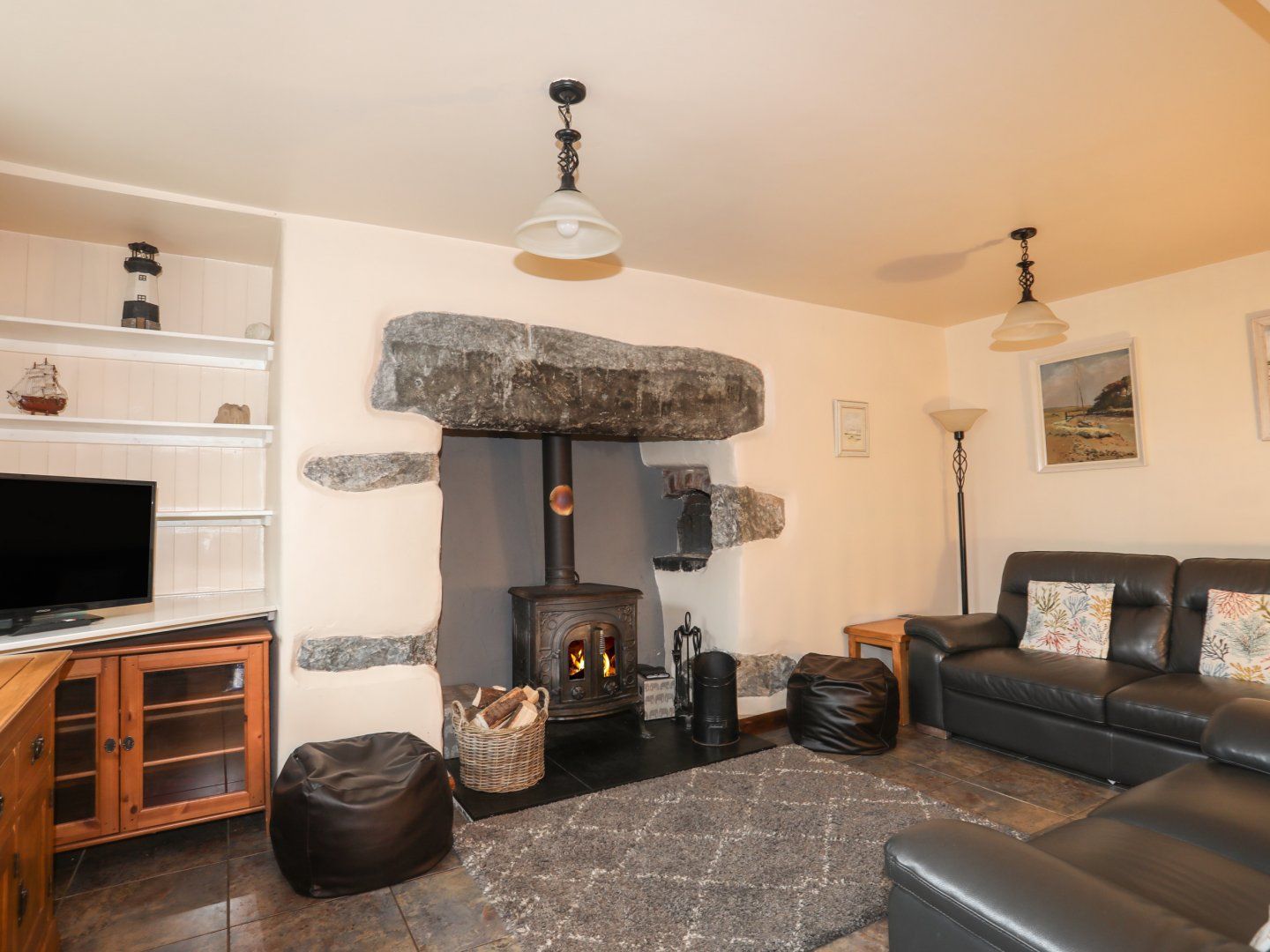 Accomodation Details Three bedrooms: 1 x double with Smart TV, 1 x twin with TV, 1 x bunk. Bathroom with bath, shower over, basin and WC. Ground-floor shower room with walk-in shower, basin, heated towel rail, and WC. Kitchen. Living/dining room with multi-fuel stove