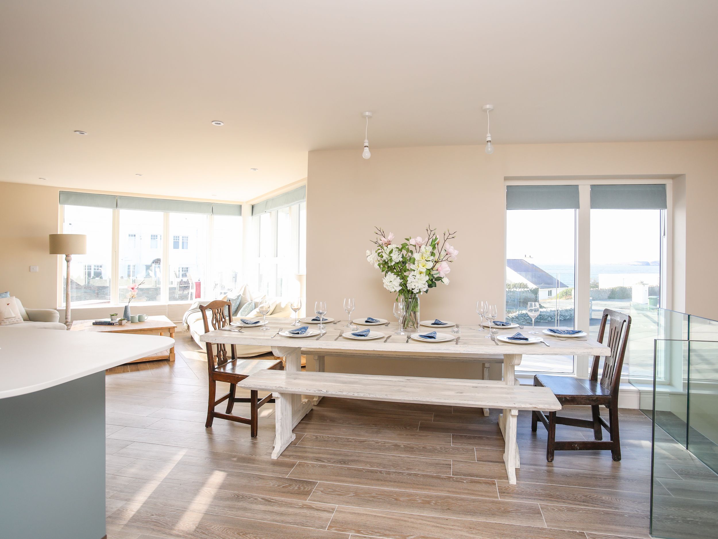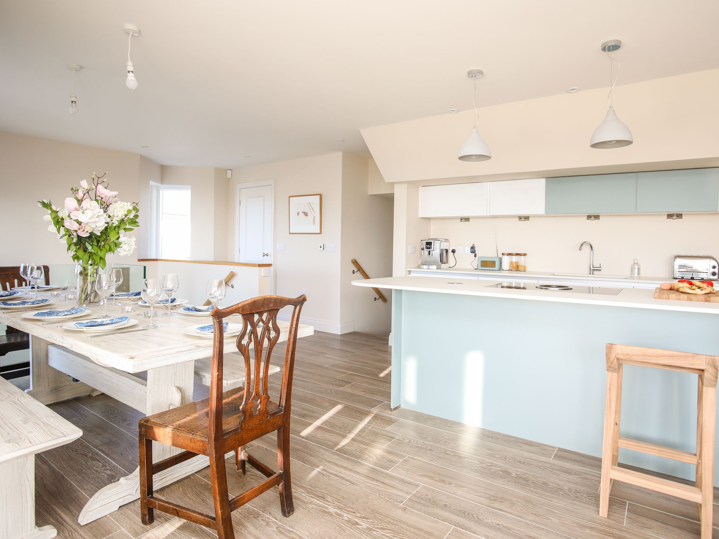 Within the coastal resort of Trearddur Bay, found on Holy Island, North Wales, is this stunning building offering a host of wonderful features and a luxury holiday home. Bryniau will impress you with its contemporary décor and attention to detail, suited to a large family or group looking to enjoy a holiday in North Wales. Relax in the open-plan living space on the first-floor where a beautiful modern kitchen with ample appliances, a long beach wood style dining table with bench seating and a soft seating area all sit before full length windows looking out to the gorgeous sea views, providing a wonderful backdrop to your holiday. Make the best memories out on the large balcony, with a special frameless glass barrier so nothing spoils your view, spread out on a sun lounger when the summer weather arrives and relax! A utility room for all of your laundry needs, a pantry and a cloakroom are on this floor too, before you reach the ground-floor garden wing, perfectly suited to the elderly, those less able or simply those who need a quiet space.It has a double bedroom with an en-suite accessible wet room, an open-plan living space with a kitchen, breakfast bar, TV and a sitting area with patio doors to the garden. This space is is suitable for aged or ambulant disabled with level threshold access from the covered carport. The rest of the bedrooms lie on the second floor, comprising two doubles, two twins both of which can be zip-linked as doubles, and a bunk room, all offering spectacular ocean views, with thoughtful décor and quality furnishings creating tranquil spots for you to unwind in at the end of the day.Two of the bedrooms have access to the upper balcony with frameless glass balustrade, which feels like being on the prow of a ship with Titanic views! Freshen up in one of the gleaming bathrooms, one with a tap-less bath and hand-held shower, the other offering a contemporary shower room.A fantastic feature is located on the ground-floor; come in from the beach all sandy and sea watery, and head straight into the limestone wet room where two shower cubicles, a WC with basin and a dressing area provide the best spot for all to get cleaned up after a beach day, The Trearddur Bay beach has a long stretch of golden sands, with shops and pubs still nearby.You can head for some lunch in between sunbathing, or in the colder months take a brisk walk with a pint at the end of it. A short drive will take you to Rhoscolyn, famous for its romantic sunsets, coastal walks and the dog friendly White Eagle pub, or simply explore the further reaches of this secluded island, a wildlife and nature haven. Bryniau is a wonderfully built property, sure to be a perfect and luxury host to you and your loved ones on an adventure to Holy Island.