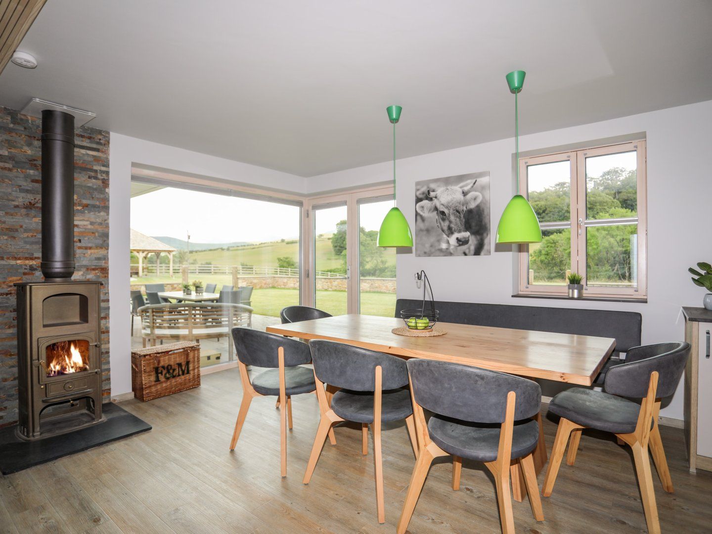microwave fridge, freezer, dishwasher and coffee machine, Ice machine. Smart TV, cinema screen, WiFi, pool table and table tennis table. Fuel, power and starters for woodburning stoves inc. in rent. Washing machine and clothes maiden. Bed linen and towels inc. in rent. Off-road parking available. Patio with furniture. Garden with pergola, garden table and chairs, patio seating and trampoline. Gas BBQ. 2 x dog allowed. Sorry, no smoking. Shop 2.8 miles and pub 1.5 miles. Note: Caretaker lives on grounds. Note: A single bed available in one of the twin rooms for added flexibility and a comfortable sofa bed in the king size with balcony room. Note: There is a washing machine in the family bathroom. Note: all rooms except for the master bedroom can be either Twin or King, please request on booking.