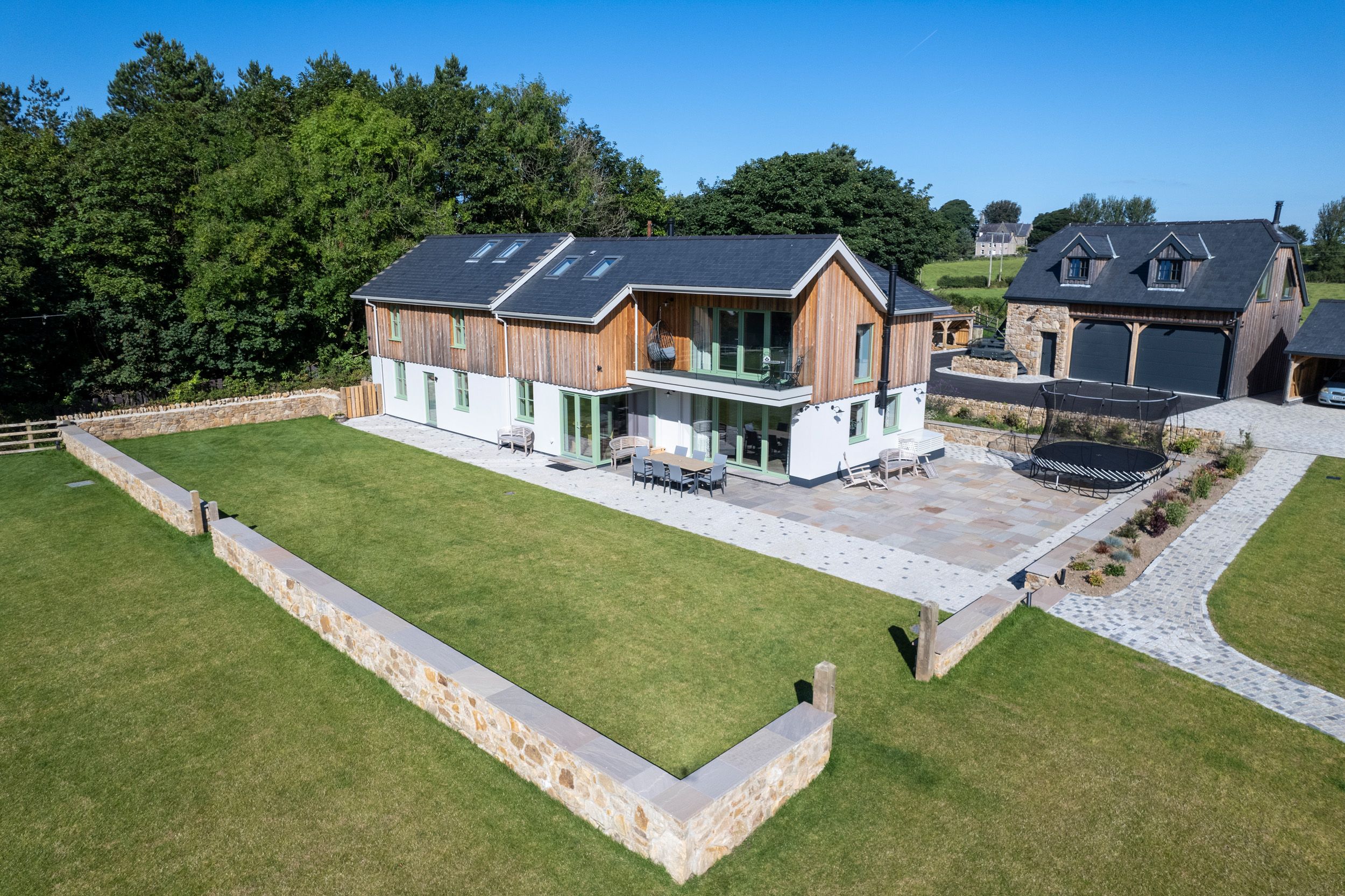 Holiday home The living areas in this property consist of a kitchen/diner with electric oven and hob, microwave, fridge/freezer, coffee machine, dining seating for eight and a woodburning stove, sitting room with woodburning stove and Smart TV, cinema room with screen and seating for ten and games room with pool table and table tennis table. The bedrooms consist of a king-size with balcony and en-suite shower room, a ground-floor twin (zip/link, can be king-size on request) with en-suite shower room, two twin rooms (both zip/link, can be king-size on request) with access to balconies serviced by a bathroom. Outside there is off-road parking available, a front patio with furniture and rear garden with pergola, furniture and trampoline. Within 2.8 miles there is a shop and 1.5 miles a pub. Sorry, no smoking. WiFi, fuel, power, starter for woodburning stove, bed linen and towels are all included in the price. Note: Caretaker lives on grounds. Rynys is a wonderful setting for families looking to escape to the Welsh countryside. Note: A single bed available in one of the twin rooms for added flexibility.