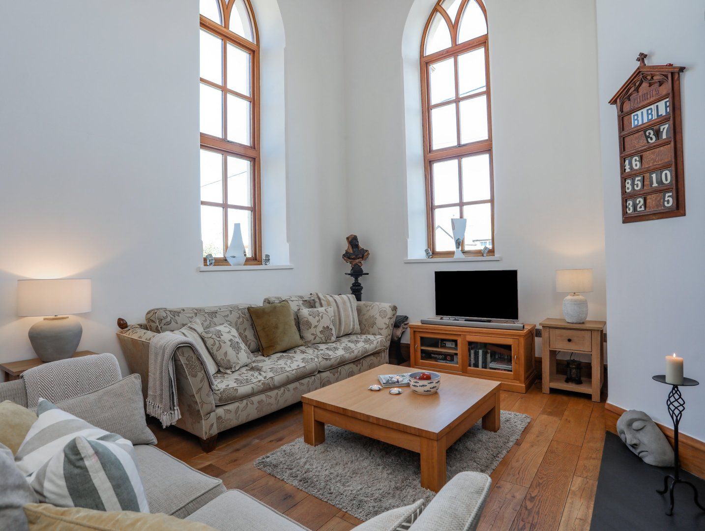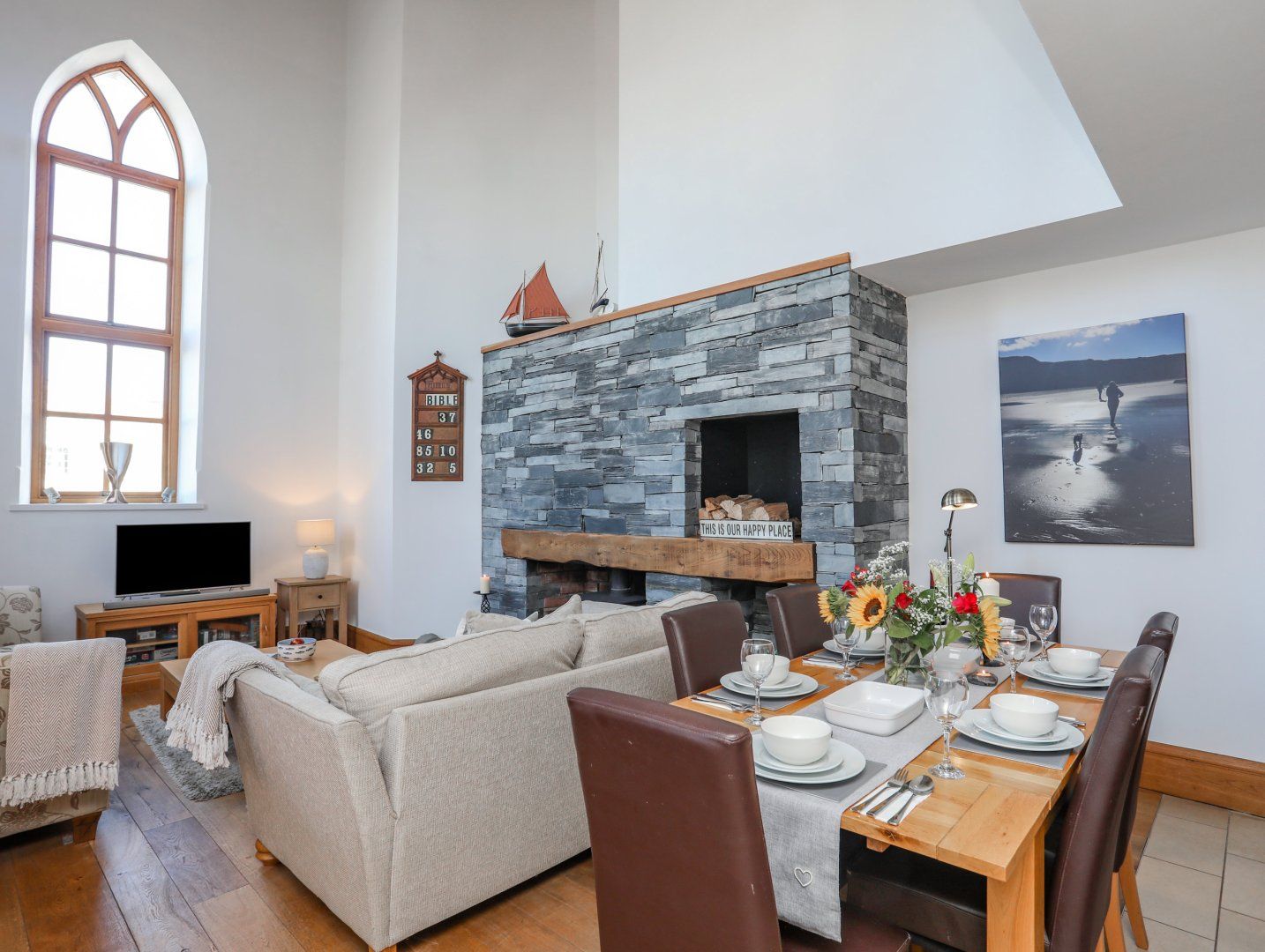 Holiday home The living areas in the three-storey chapel conversion consist of an open-plan living space with a kitchen hosting an electric oven and hob, microwave, fridge/freezer, dishwasher, a dining area with seating for six people, and a sitting area with a TV with Freeview, surround sound, a DVD player, and a utility with a washer/dryer. The bedrooms consist of a king-size with an en-suite shower room, a ground-floor double, and a second-floor twin with an en-suite shower room, along with a ground-floor bathroom. Outside, there is a decked, enclosed garden with an outdoor woodburning stove and furniture, along with parking for three cars. Within 0.1 miles, you will find a shop, and within 0.2, a pub. Please note that two well-behaved dogs are welcome, however smoking is not allowed. Capel Tabernacl is a wonderful choice for seaside break to this wonderful part of Wales. Note: Check-in is from 5pm, check-out by 10am.