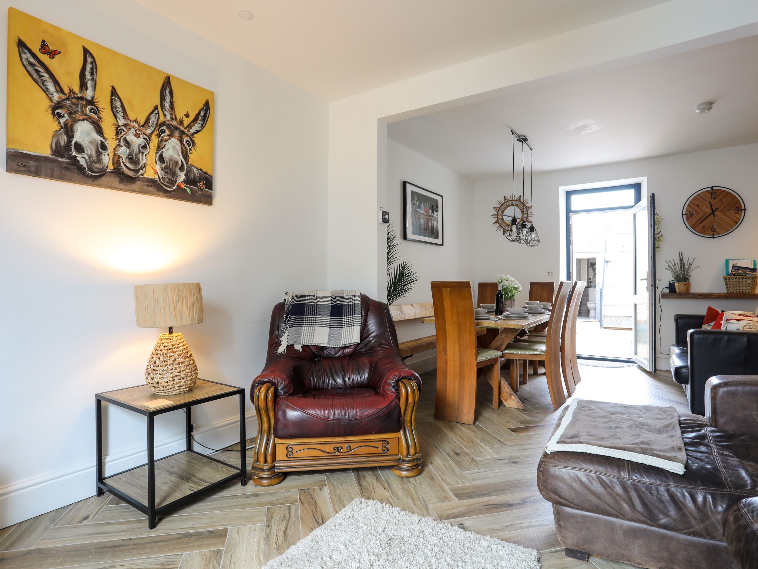 Over three floors. Four bedrooms: 1 x king-size with en-suite shower, basin and WC, 1 x king-size, 1 x second-floor twin, 1 x second-floor bunk. Bathroom with bath, walk-in shower, basin and WC. Second-floor shower room with walk-in shower, basin and WC. Open-plan living space with kitchen, dining and sitting area. Second-floor sitting area.