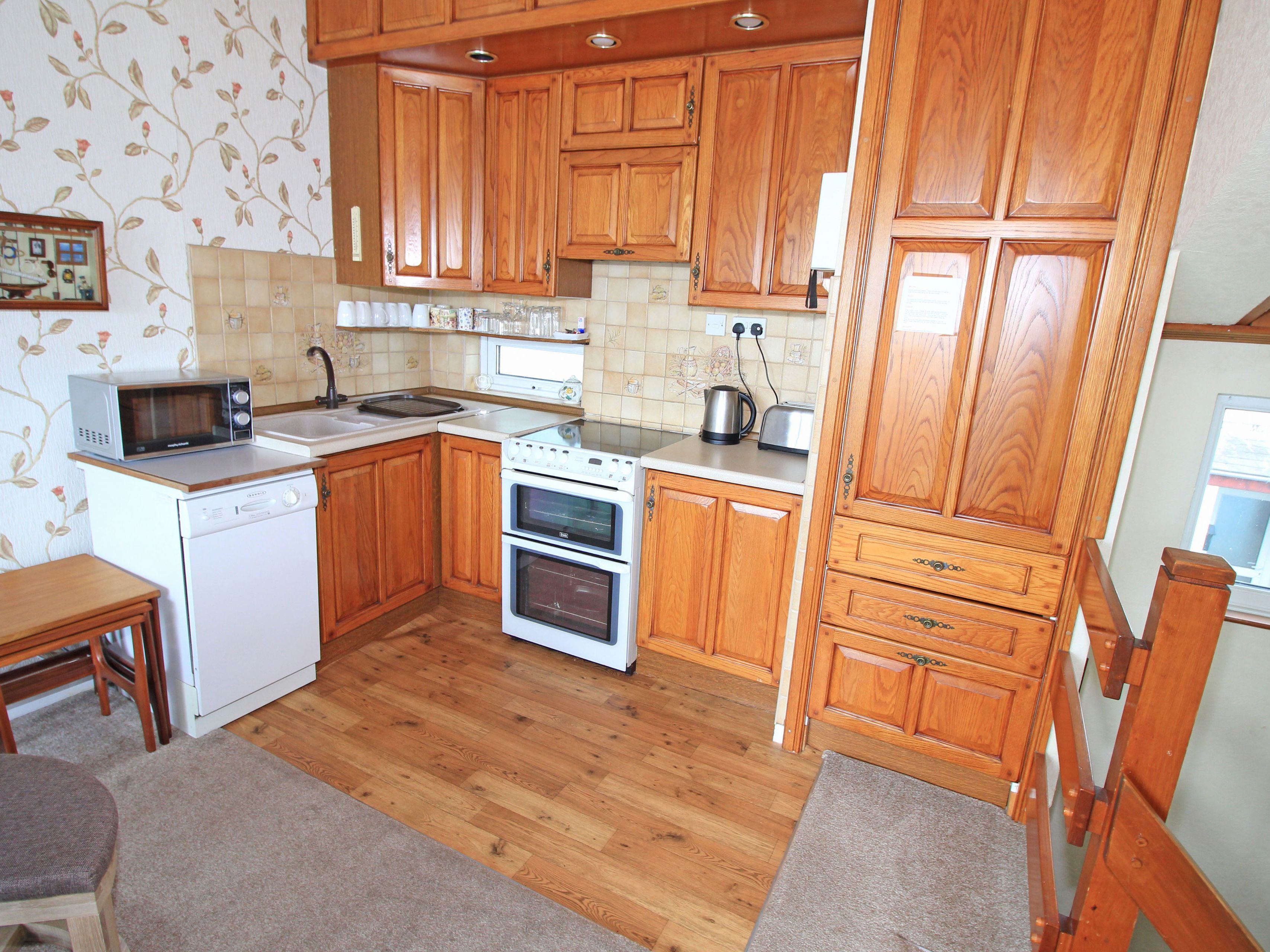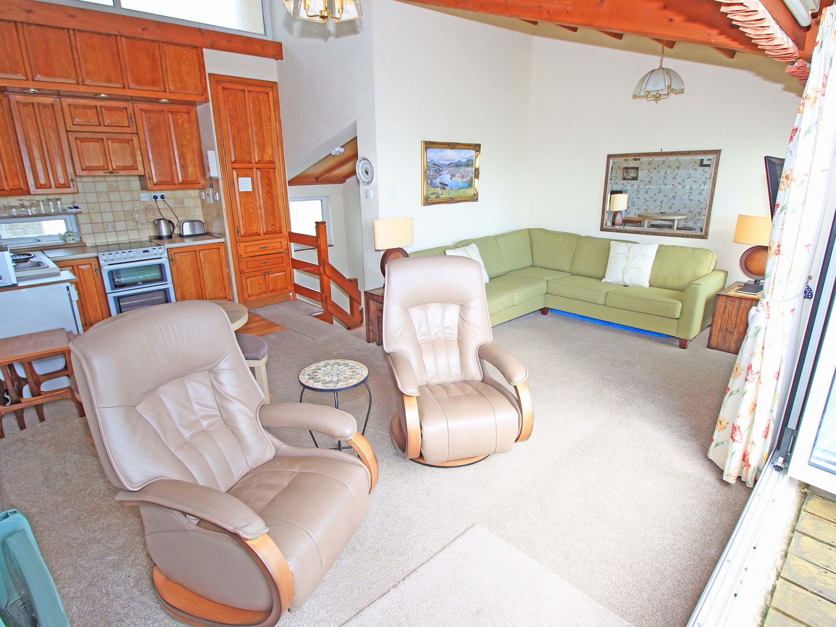 Accomodation Details Reverse-level. Two bedrooms: 1 x king-size, 1 x twin. Bathroom with bath, shower-over, basin, WC. Open-plan living space with kitchen, dining area and sitting area