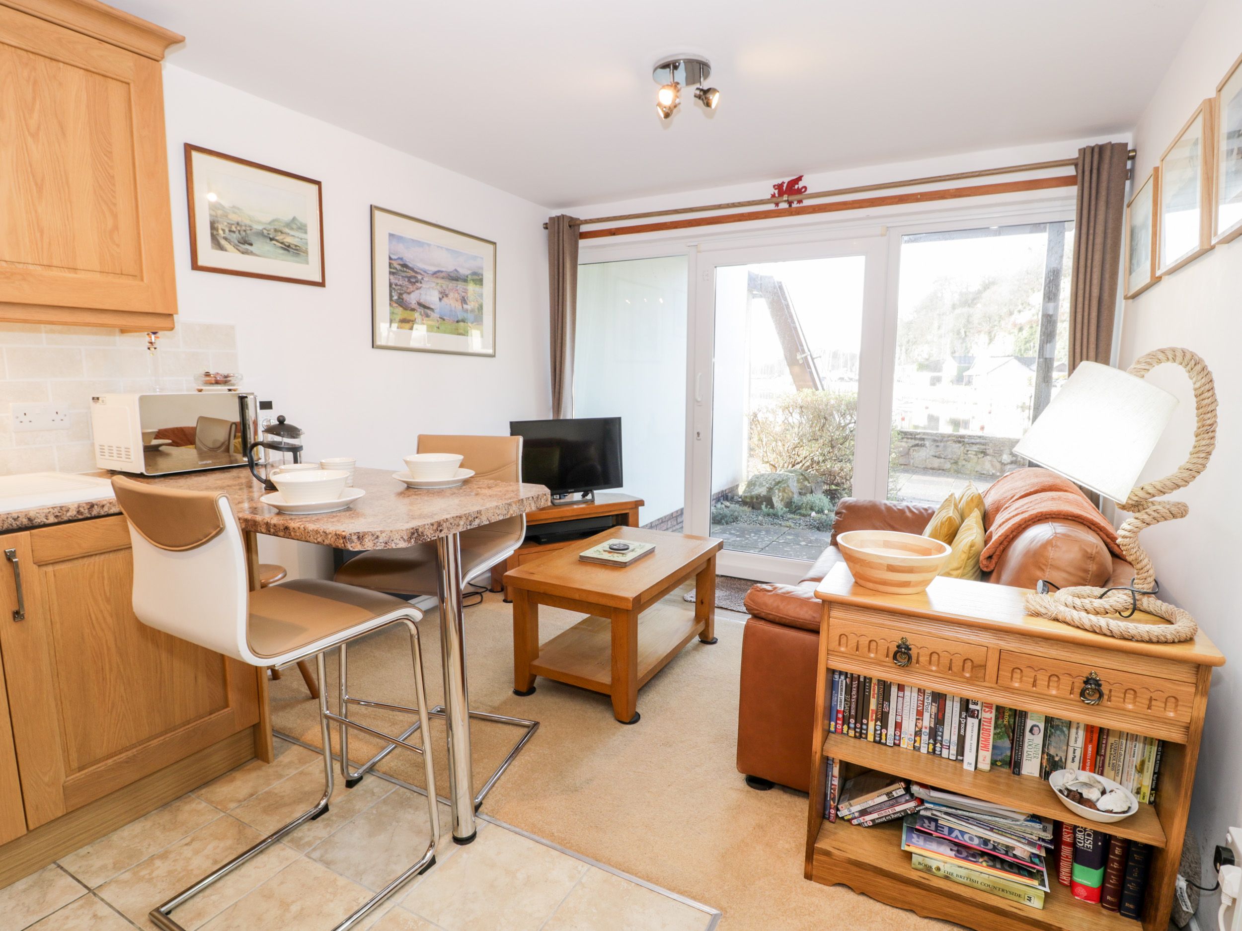 Accomodation Details Ground-floor apartment overlooking the waterfront. One double bedroom. Shower room with walk-in shower, basin and WC. Open plan living space with kitchen, dining area and sitting area with flame-effect electric fire