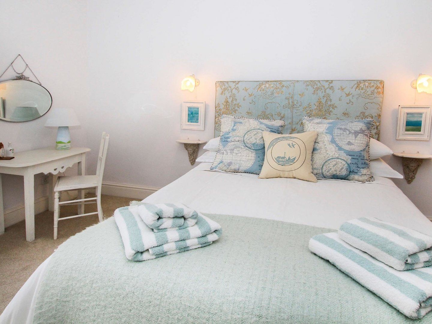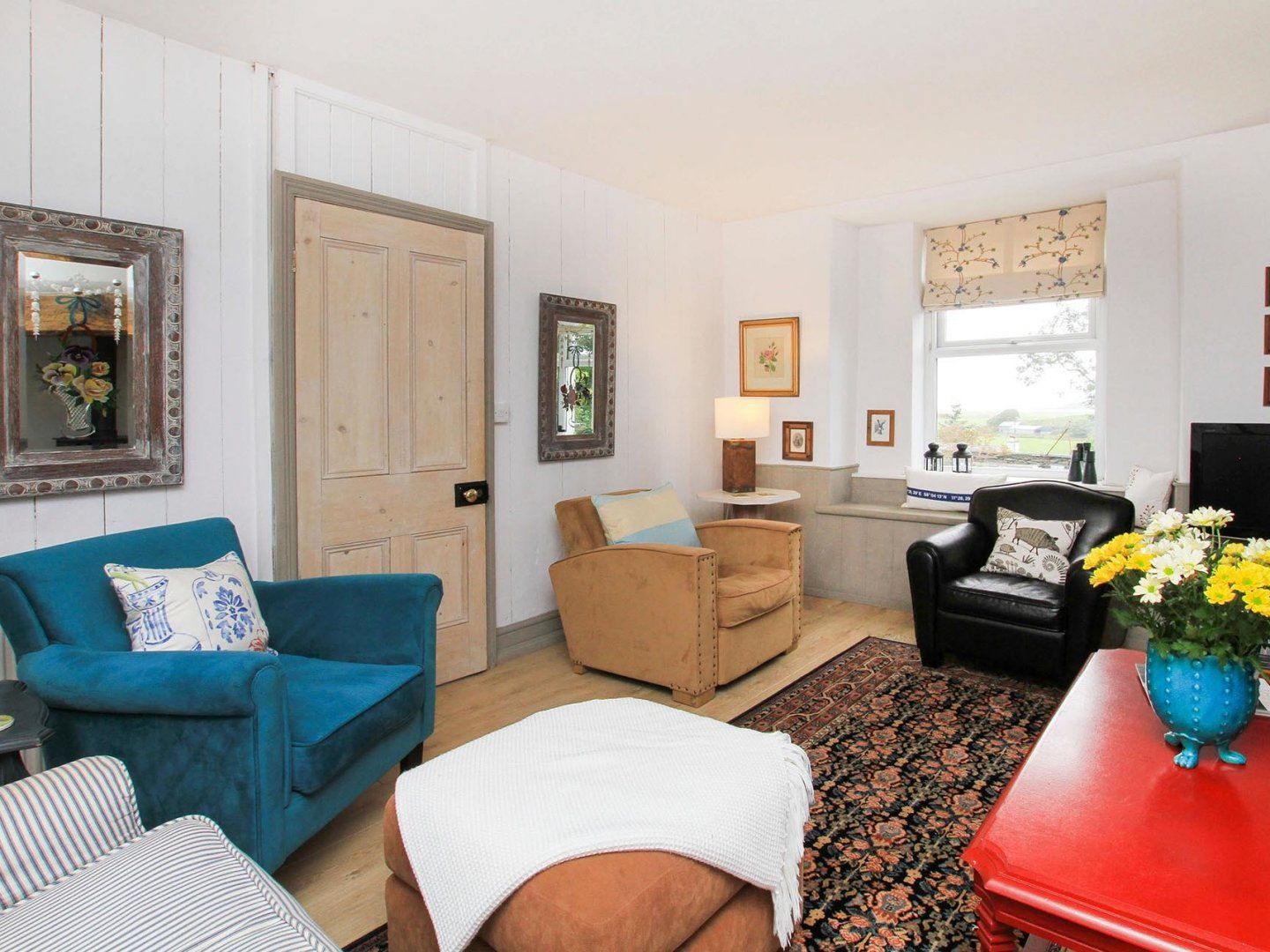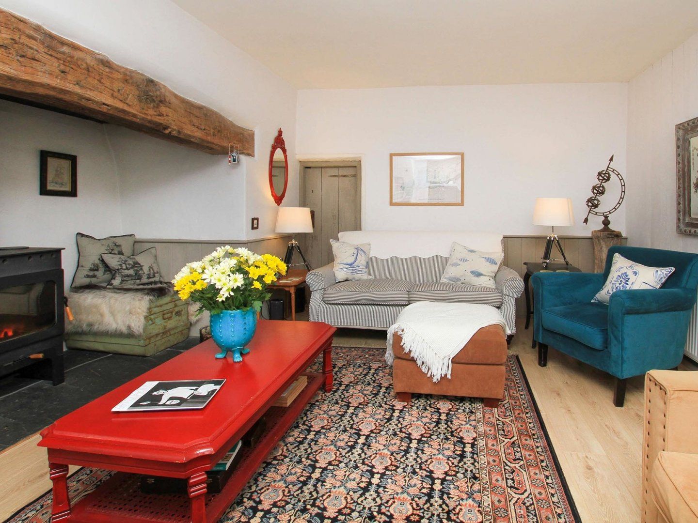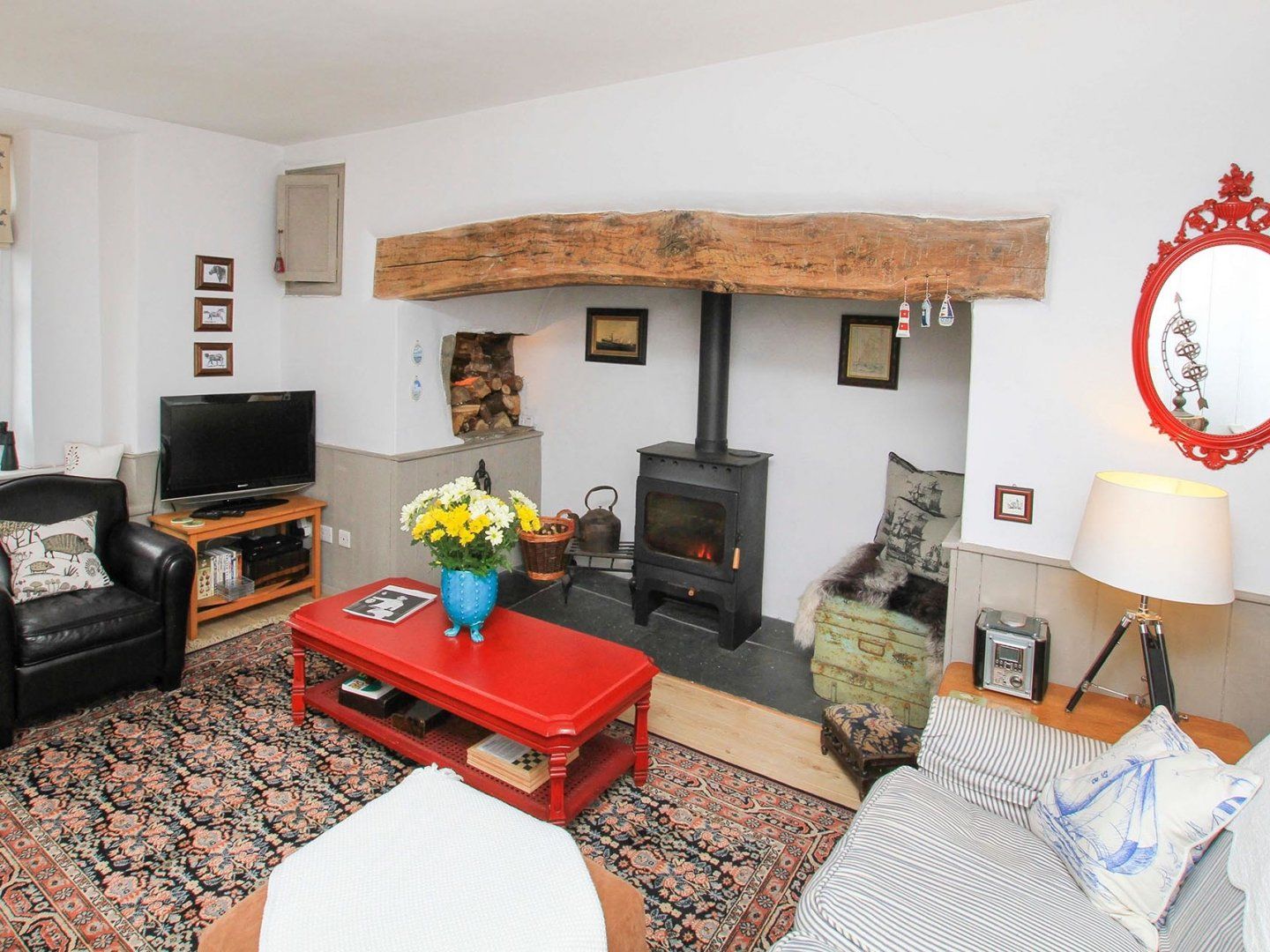 Four bedrooms: 2 x double, 1 x twin, 1 x single. 1 x ground floor cloakroom with wash hand basin loo. 1 x bathroom with loo, wash hand basin, bath with shower over. 1 x ensuite with loo, wash hand basin, bath shower. Kitchen with electric range cooker, American fridge freezer, dishwasher, washing machine tumble dryer. Sitting room with wood burning stove, TV, DVD and CD players and radio. Second sitting room with TV, DVD player, and kitchenette.