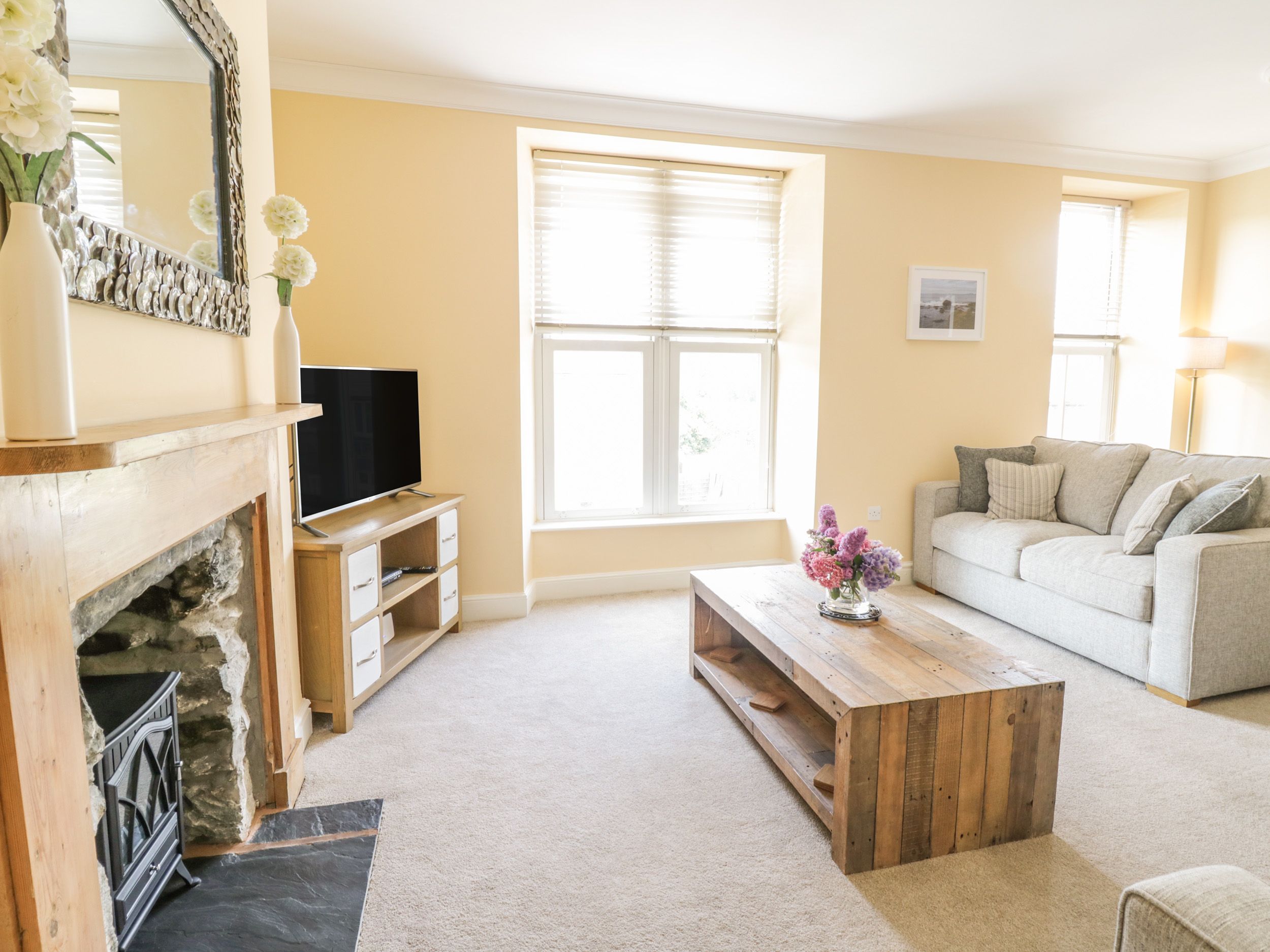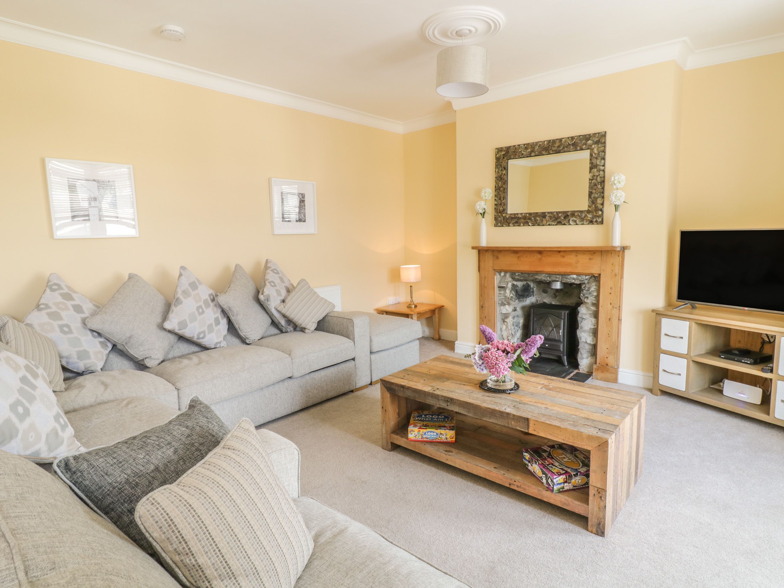Amenities Oil central heating with electric woodburner-effect stoves. Electric oven, halogen hob, microwave, fridge/freezer, dishwasher and tumble dryer, washing machine, 5 x TVs with Freeview, DVD, WiFi, selection of books, games and DVDs. Fuel and power inc. in rent. Bed linen and towels inc. in rent. Travel cot, highchair and stairgate. Roadside parking and FOC car park at the rear. Enclosed rear courtyard with furniture. One well-behaved dogs welcome. Sorry, no smoking. Shop and pub 1 min walk. Note: Property is next to a road, some associated noise may be heard. Note: dog must be kept downstairs. Property does not accept contractors or builders. Please contact us if your booking is for work purposes.