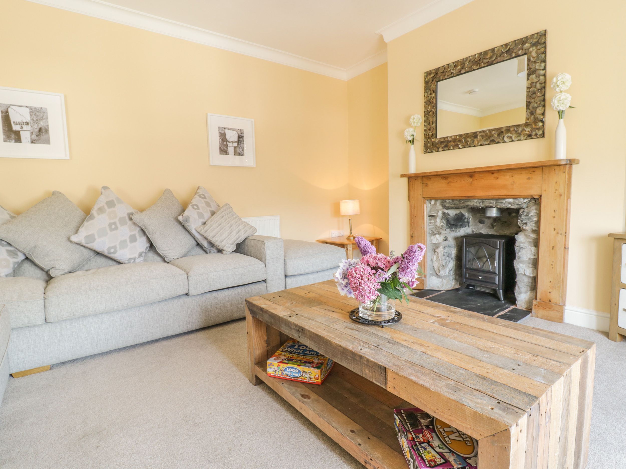 Holiday home Angorfa is a lovely Victorian house situated in the little village of Llanbedr in the Snowdonia National Park. The house can sleep eight people in four bedrooms, two king-size doubles, one twin one bunk room. There is a bathroom with a bath, shower, basin and toilet. There is also a second floor shower room with double shower, basin and toilet. There is a kitchen, dining room with electric woodburner effect stove, utility and sitting room. Outside there is an enclosed rear courtyard with furniture. There is roadside parking and a free of charge car park at the rear. Angorfa is an excellent family base for discovering the scenery of the nearby coastline of Cardigan Bay.